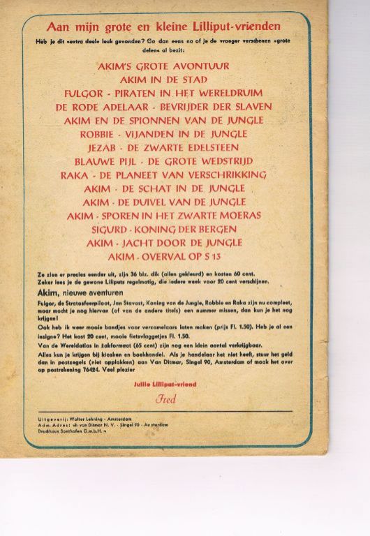 Uitg. Walter Lehning. 1955. Type: grote liliput. Hoewel het boekje er goed uit ziet, heeft deze toch wat te lijden gehad. De rug is onderaan een paar mm ingescheurd. De covers vertonen wat minieme scheurtjes van een of een paar mm. Het boekje zit wel nog goed vast in de nietjes. Gewicht 34 gram. Goed verpakt (met karton) zijn de verzendkosten vanaf € 3,95 met track & trace. Prijs € 24,95.