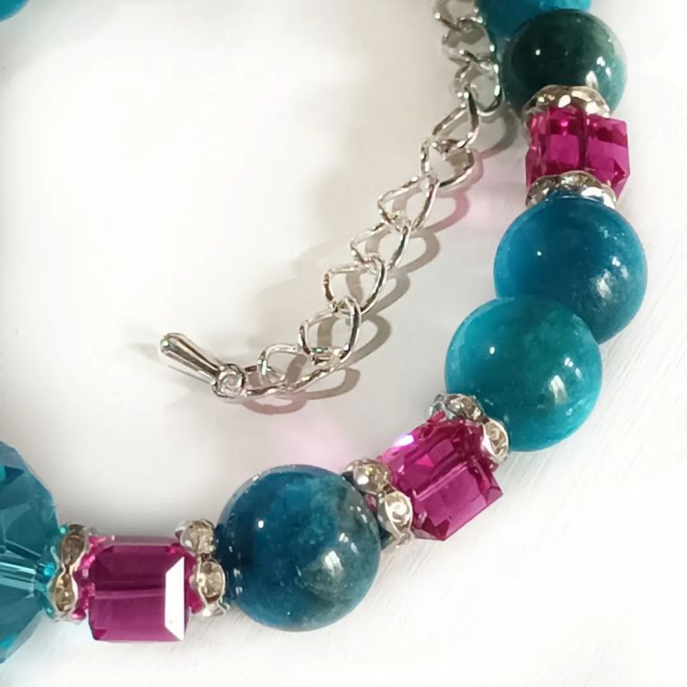 CORINA SIERADEN Handgemaakte armband van rode jaspis (8 en 10 mm), onyx (facetgeslepen disc), blackstone (gedraaid) en messing, met messing bedel dennenappel. Polsmaat: 19 cm.