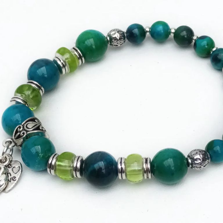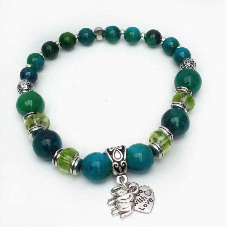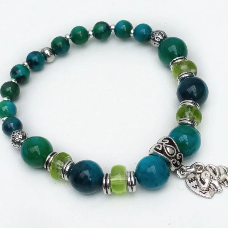 Armband van chrysocolla, glas rondel en tibetaans zilver, met bedeltjes, olifant en hartje. Lengte: 18,5 cm. Op de website vind je ook bijpassende oorhangers.