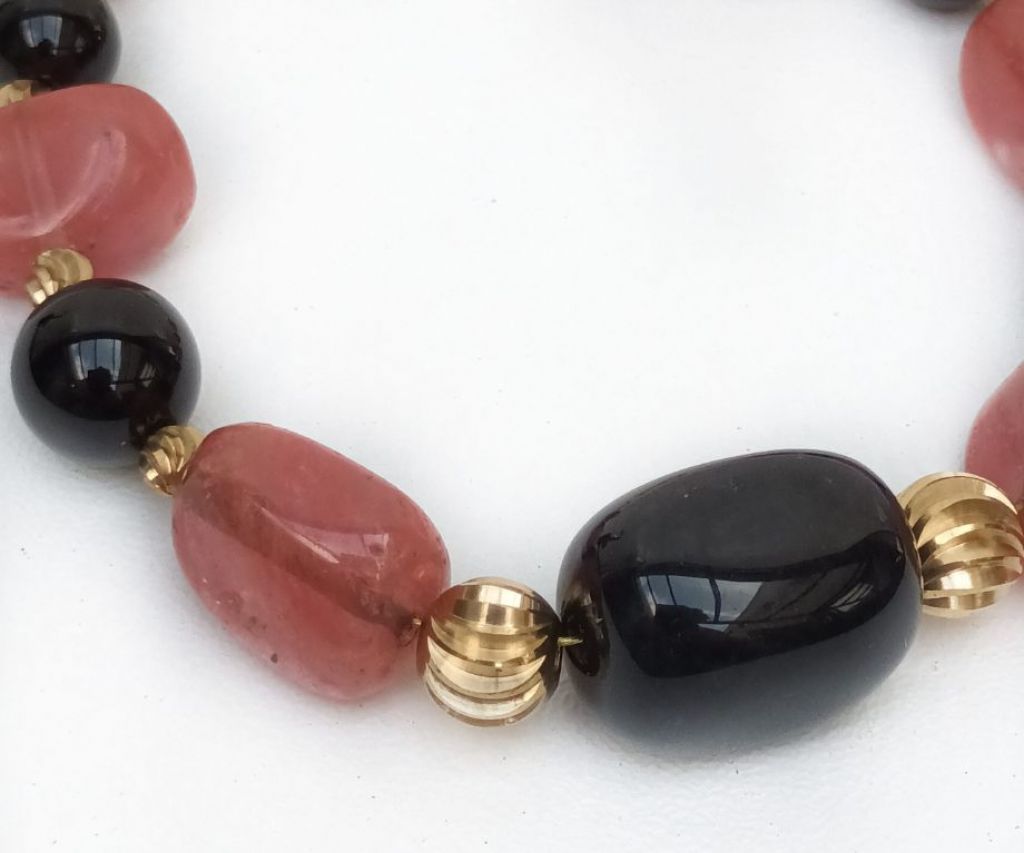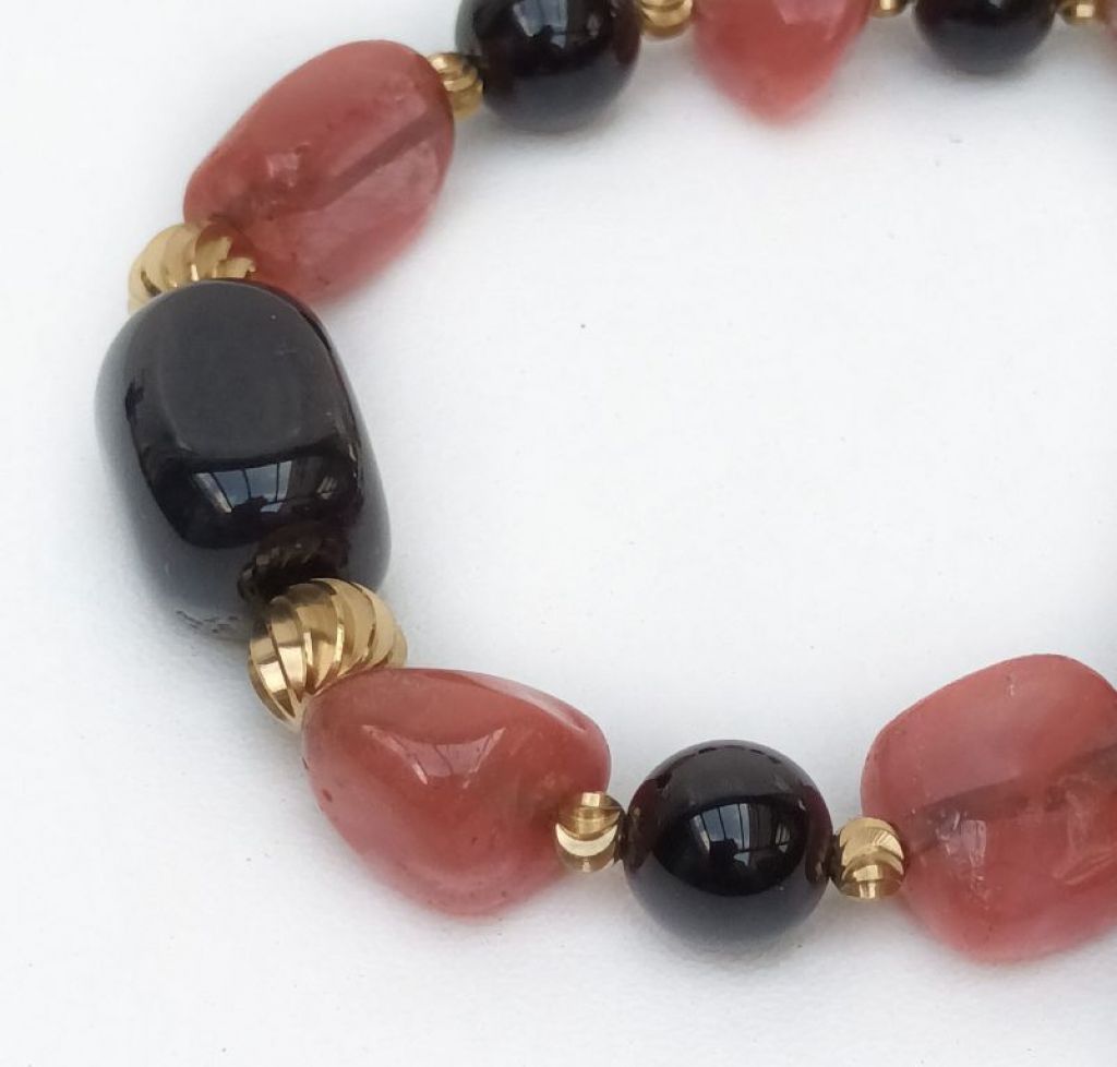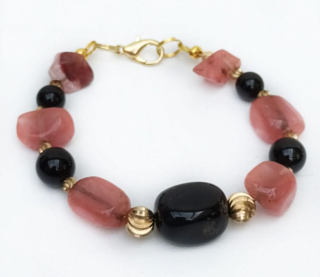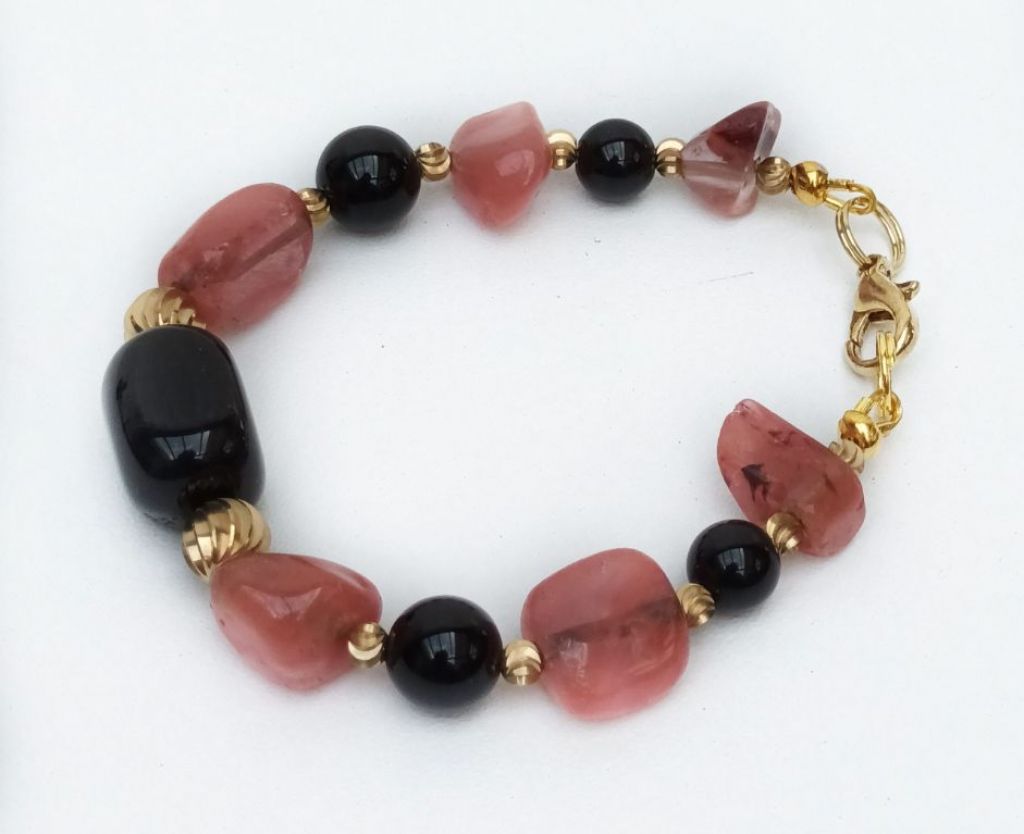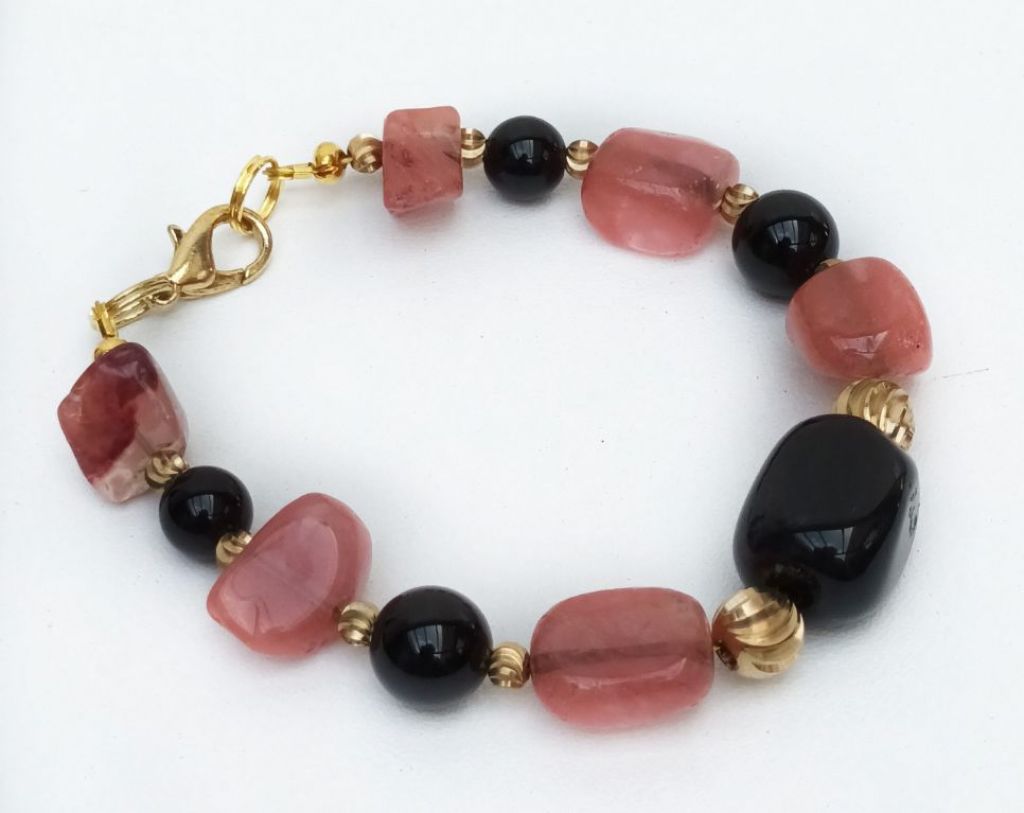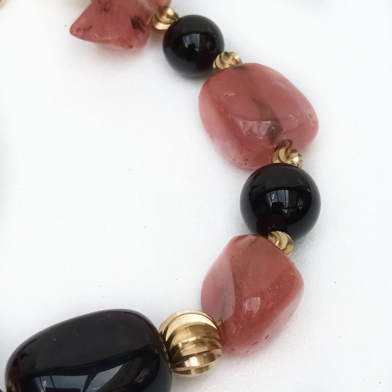 Unieke armband van onregelmatige cherry quartz, onyx en messing, met sierkraal van agaat.