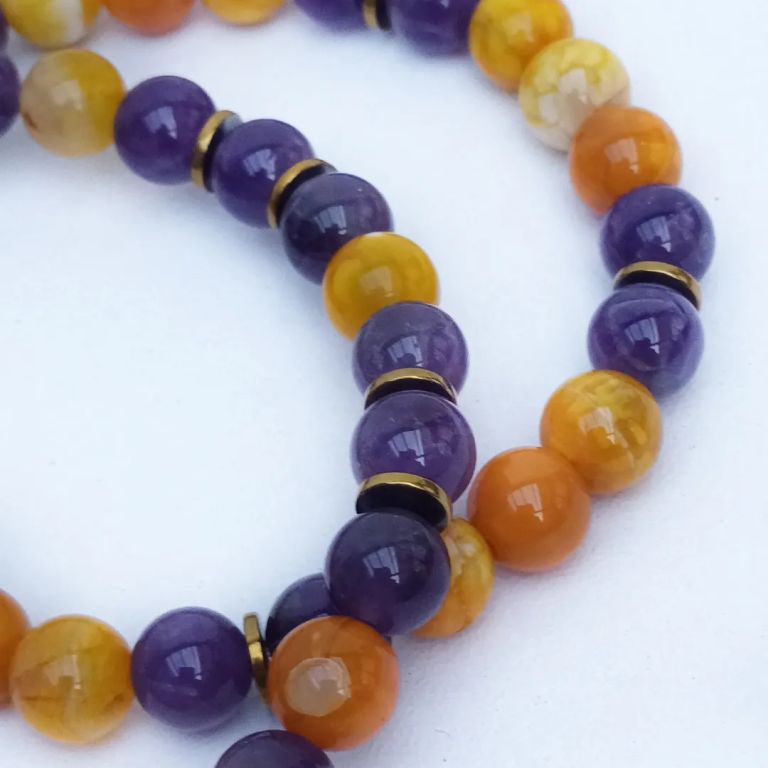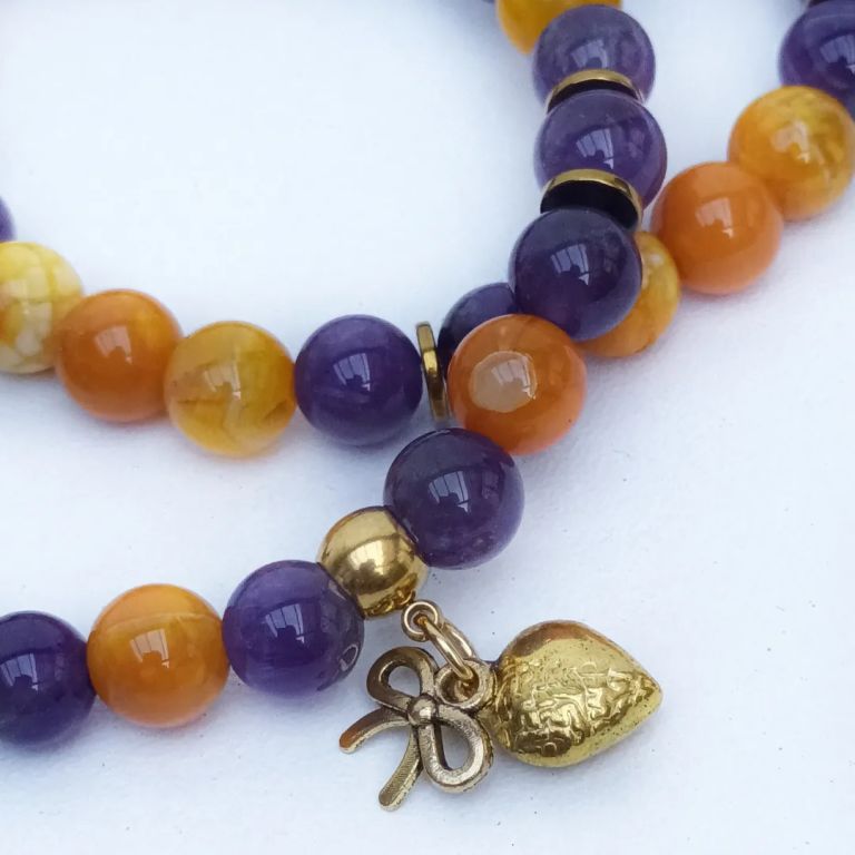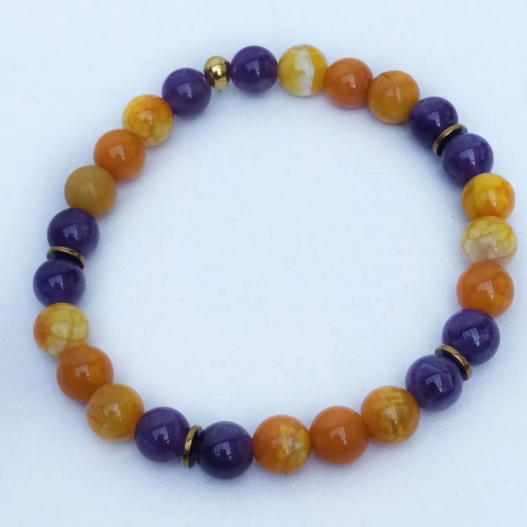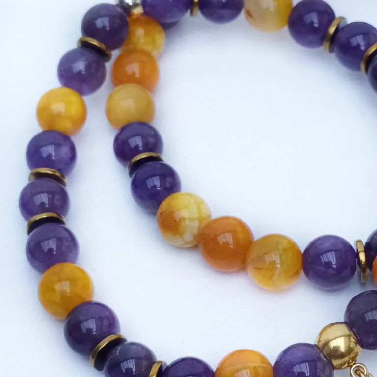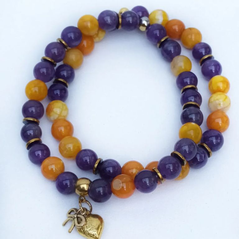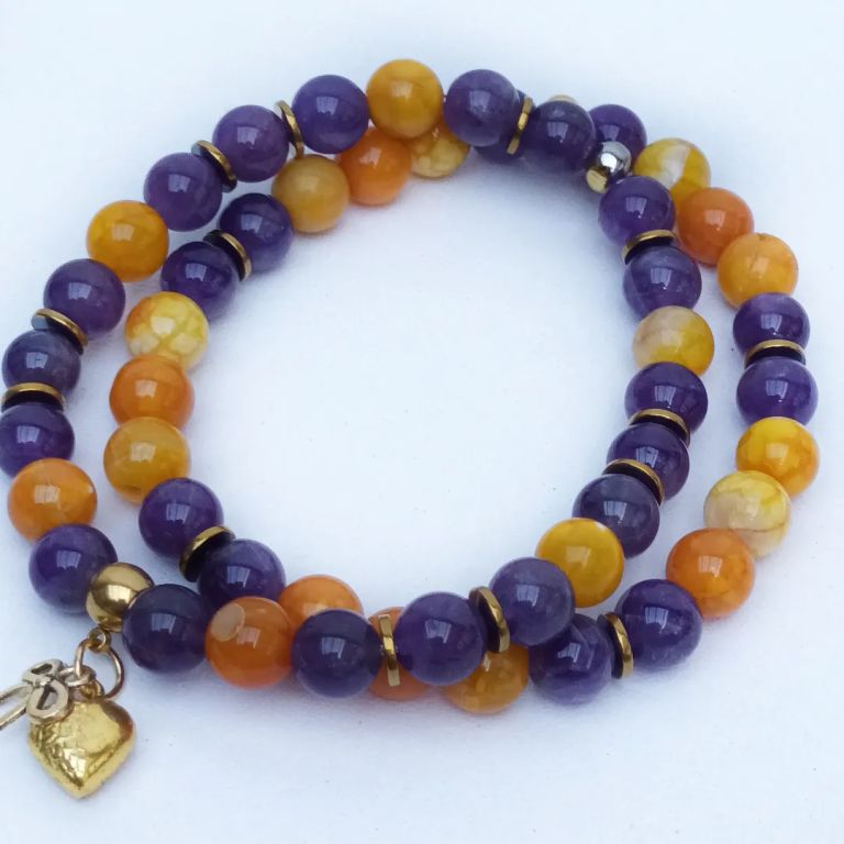 Prachtige armbandenset van amethyst, crackle agaat en hematiet, met bedels, geregen op elastiek.