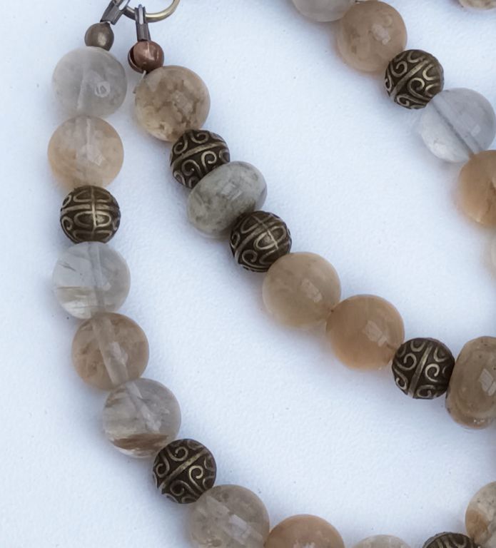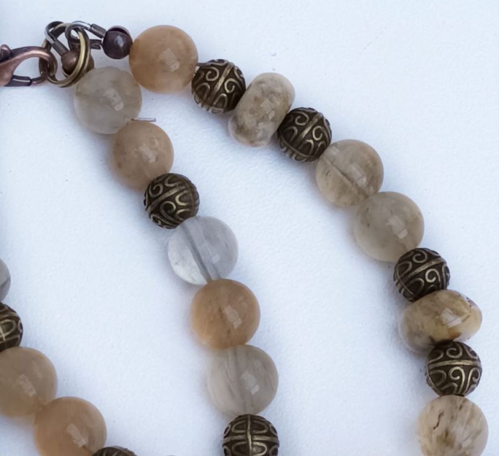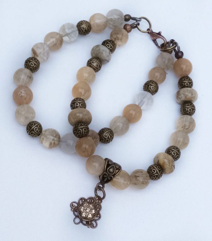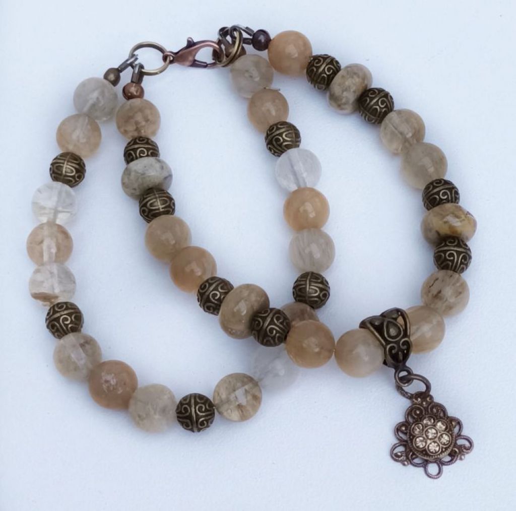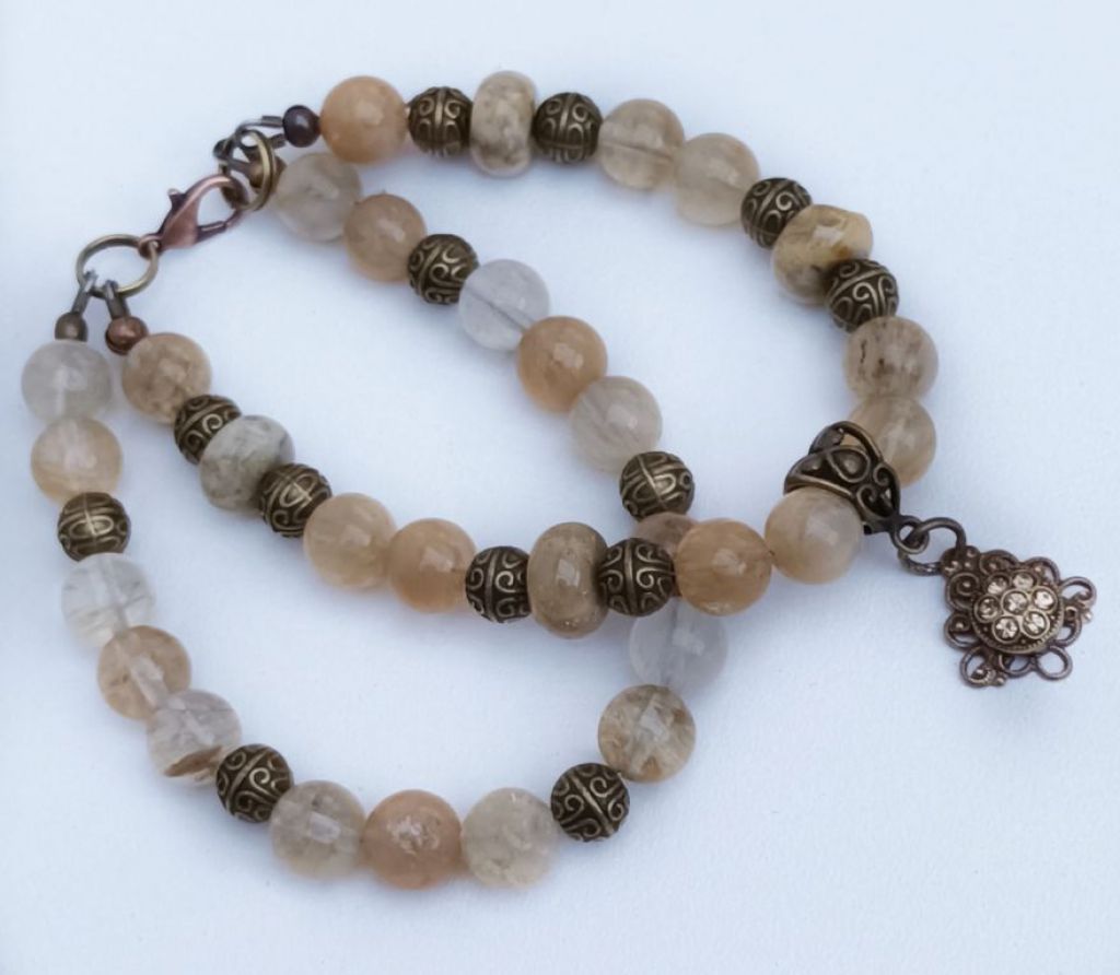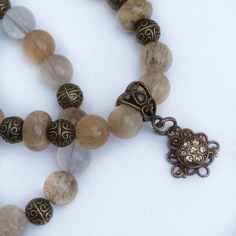 Dubbele armband van beige/gele watermeloen quartz, crazy agaat rondel en brons, met prachtige bedel met strass.