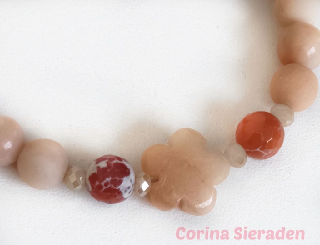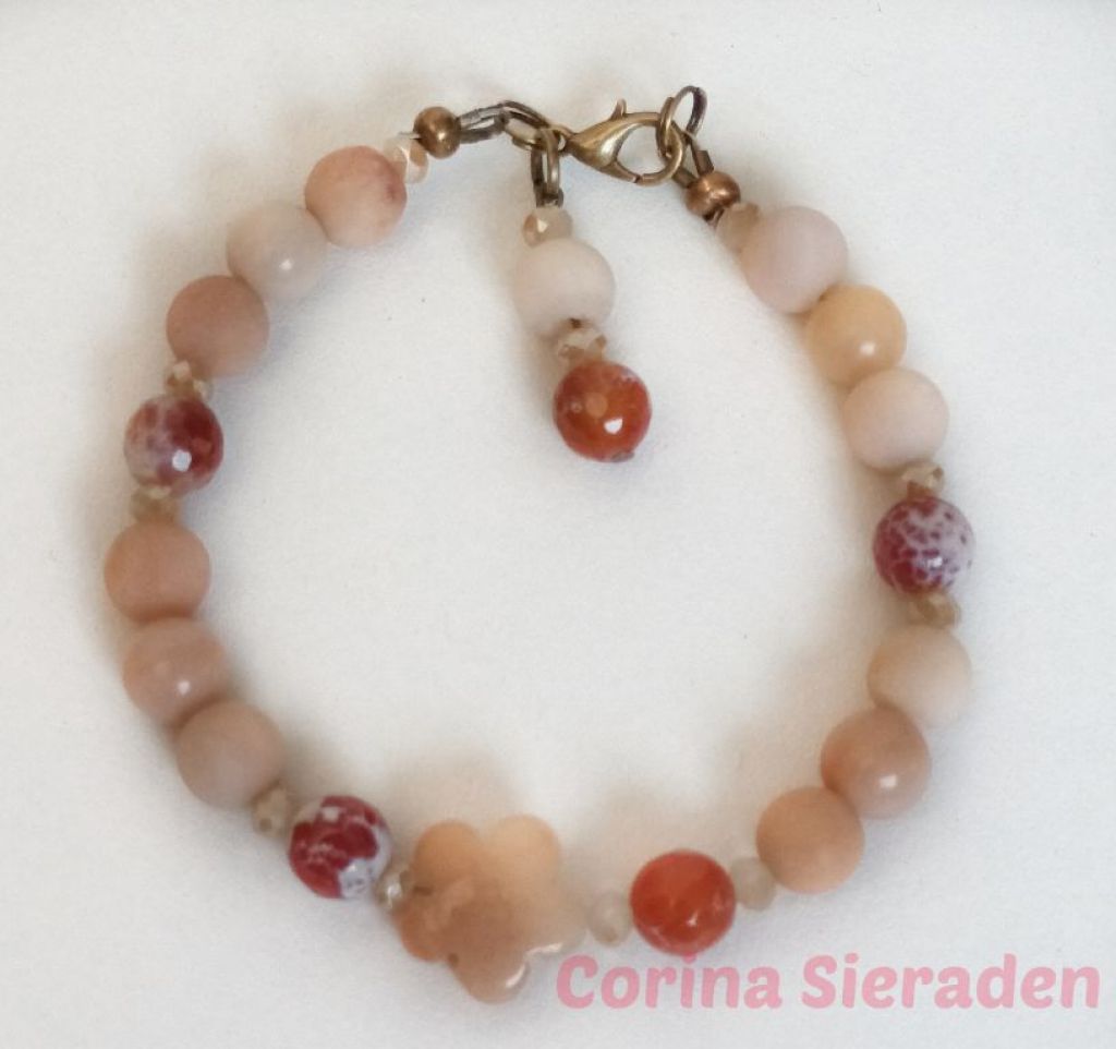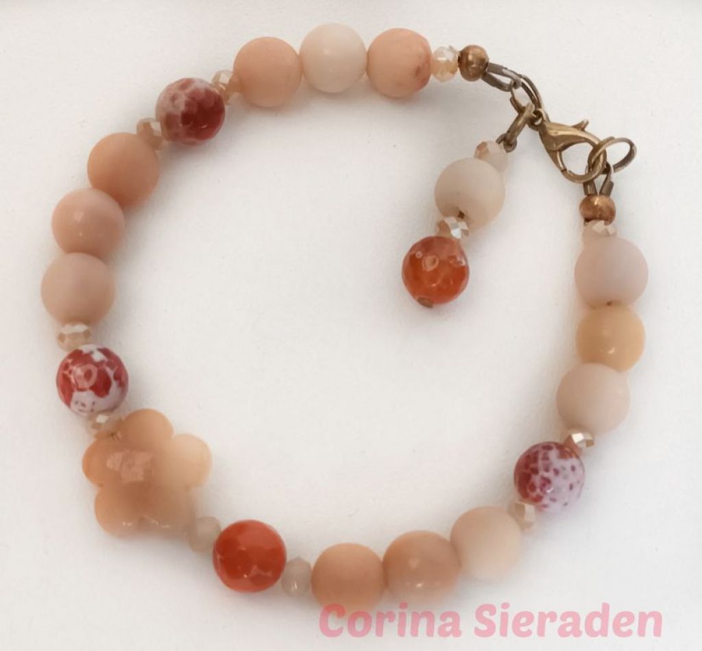 Armband van aventurijn (8 mm, mat en glad) crackle agaat en kristallen facetkraaltjes, met een sierkraal (bloem) van jade en bedel van kralen.