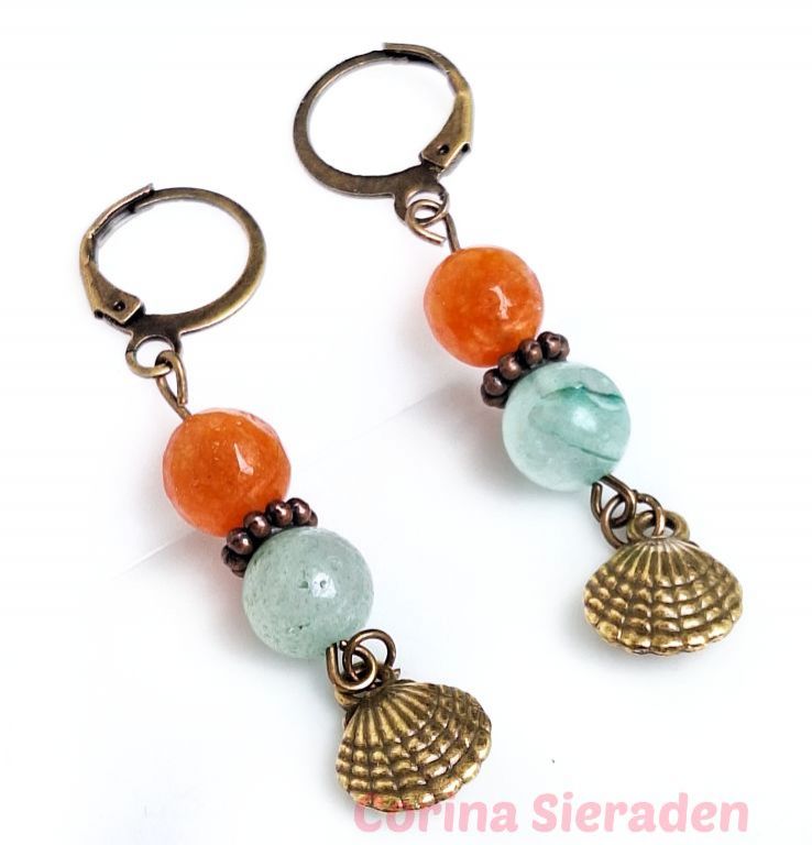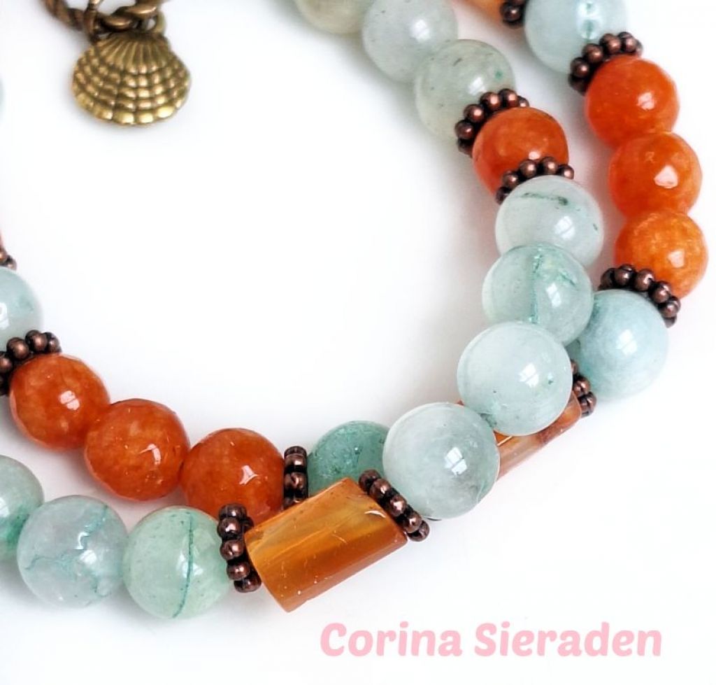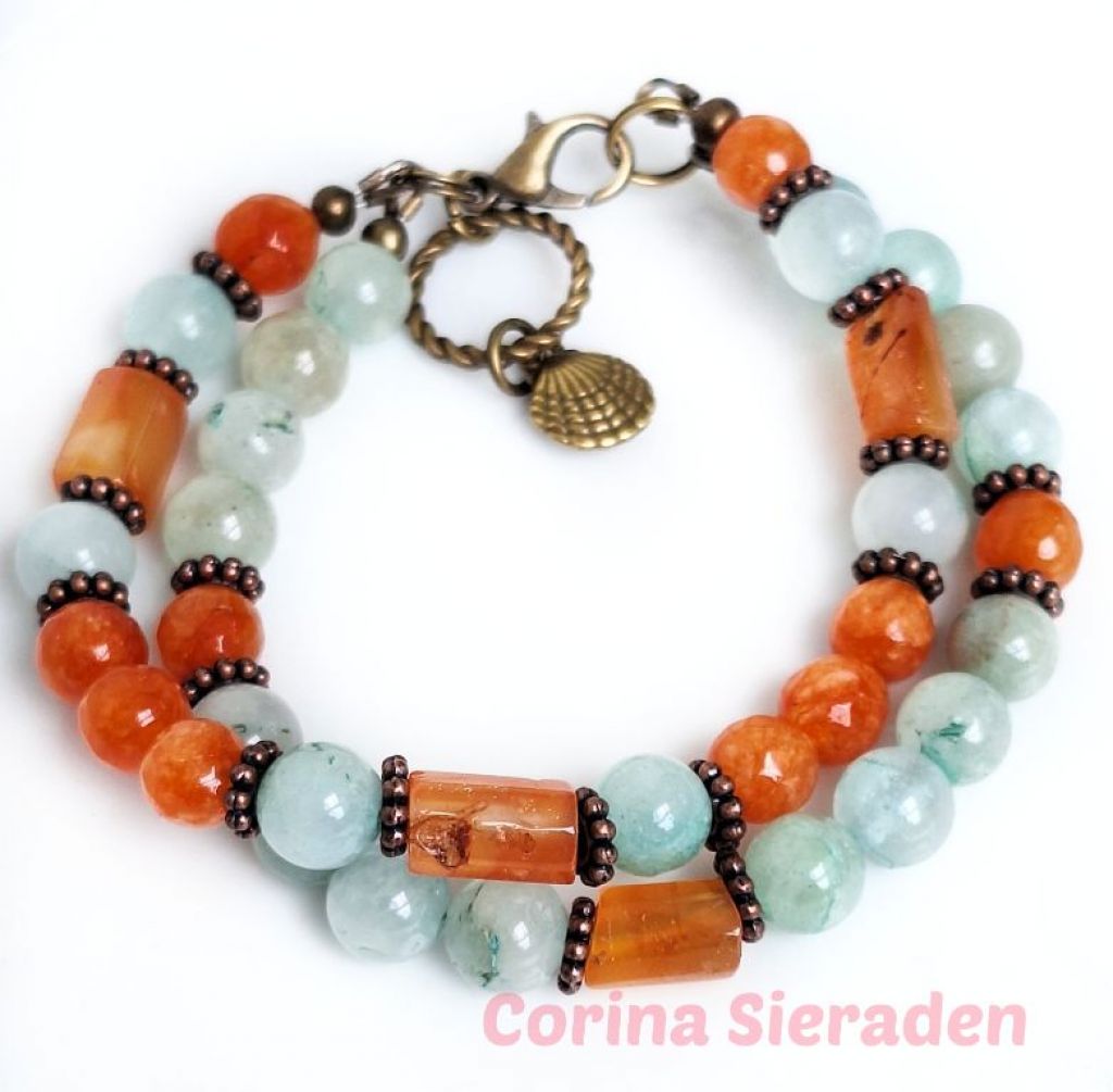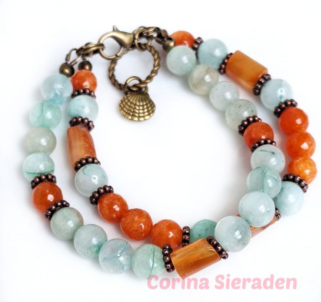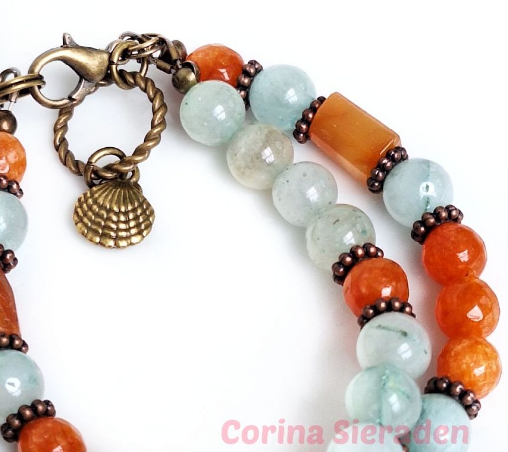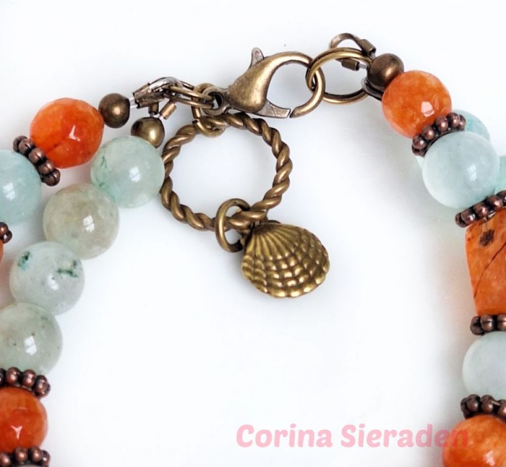 Dubbele armband van amazoniet, facetgeslepen chalcedoon, Botswana agaat (cilinder) en brons, met bedel schelp.