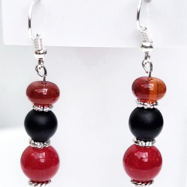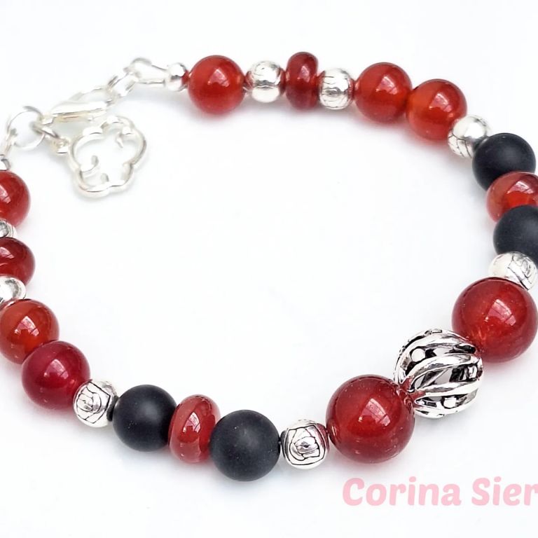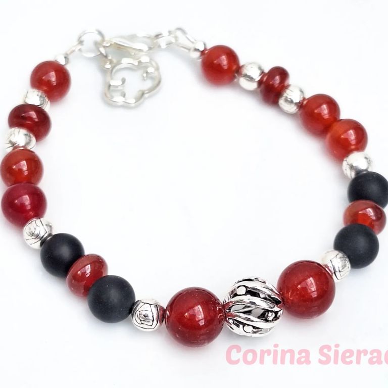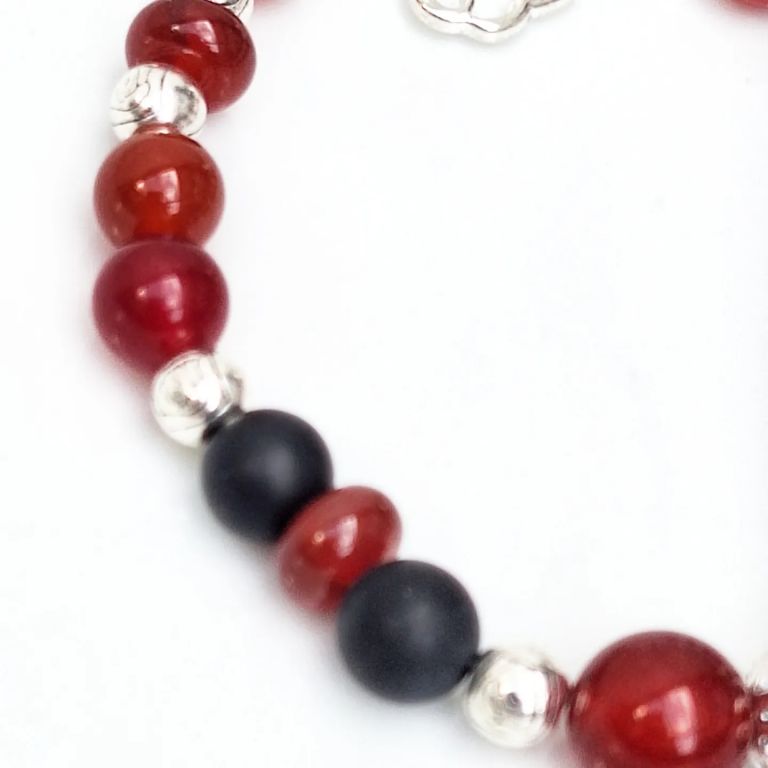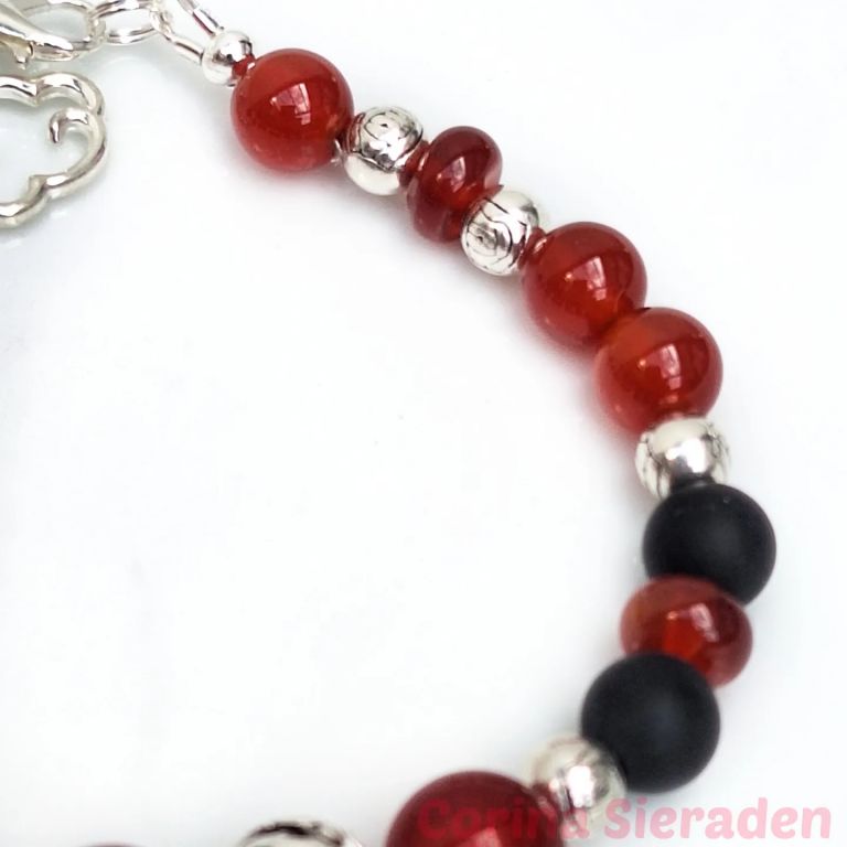 Armband van rode agaat, matte onyx en tibetaans zilver, met sierkraal en bedel wolkje.
