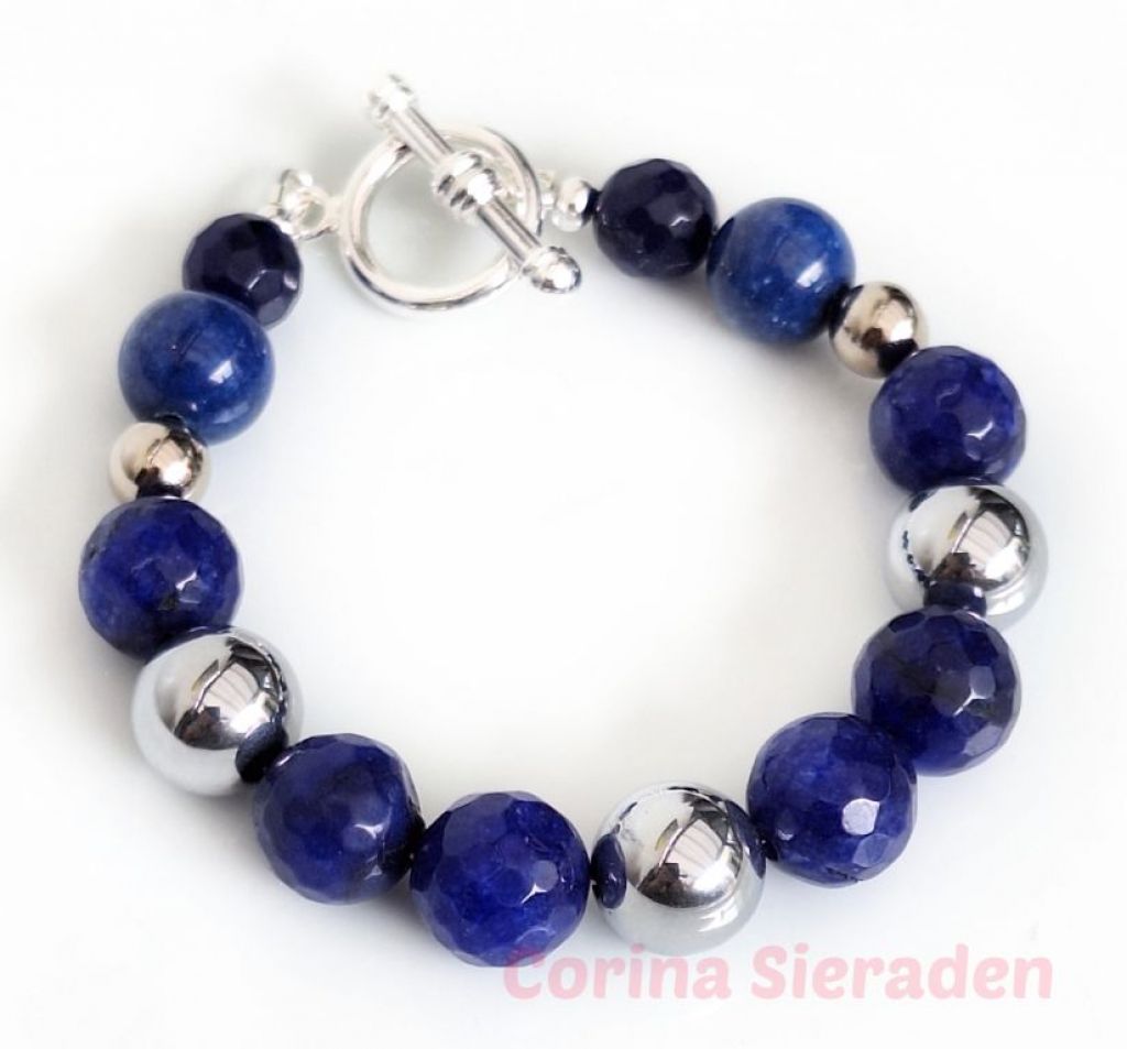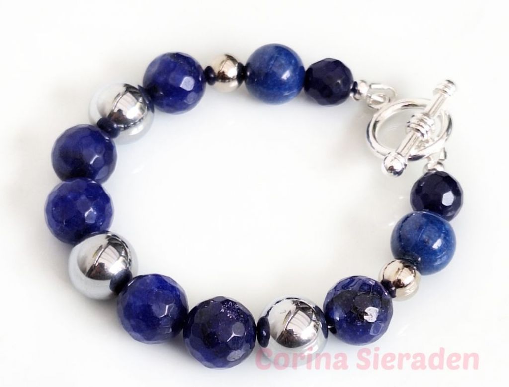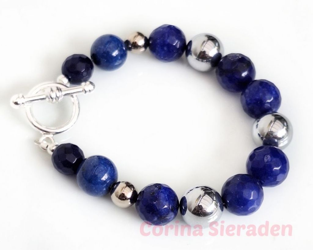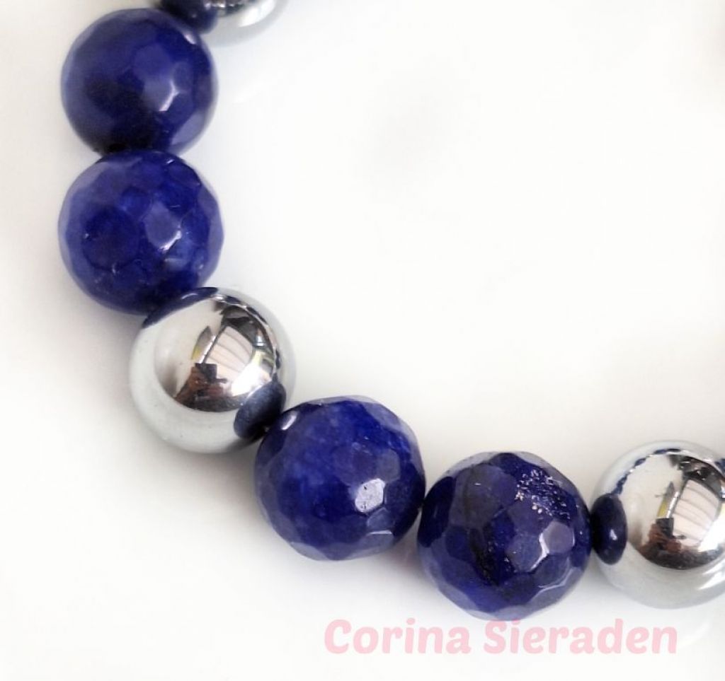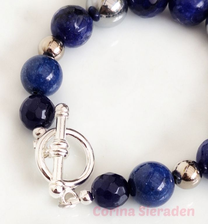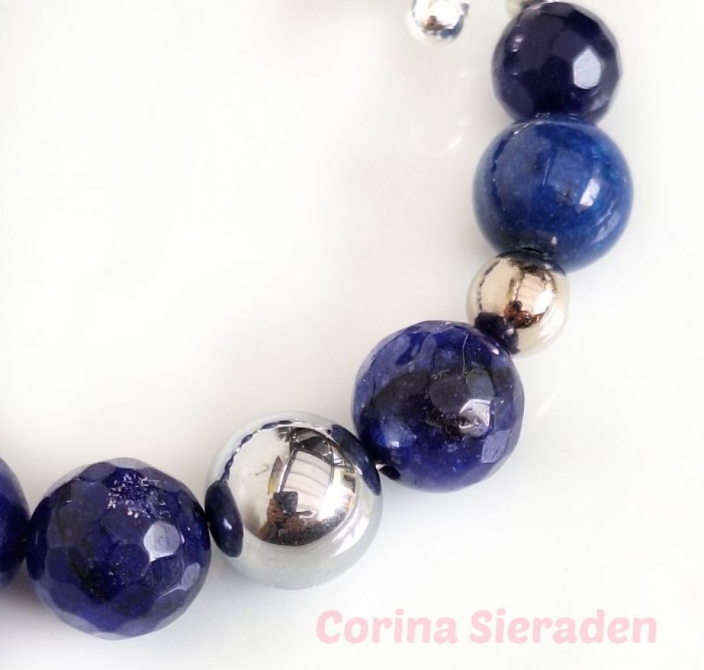 Armband van facetgeslepen agaat (10 en 12 mm), calciet (12 mm) en RVS, met prachtig kapittelslot.