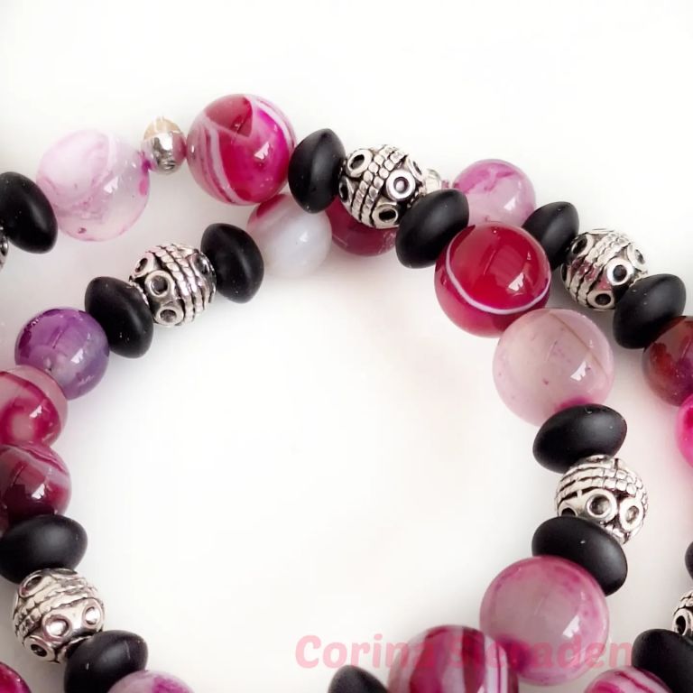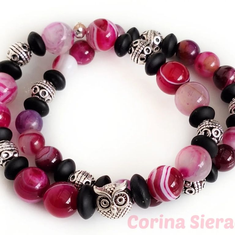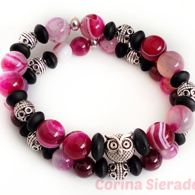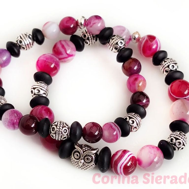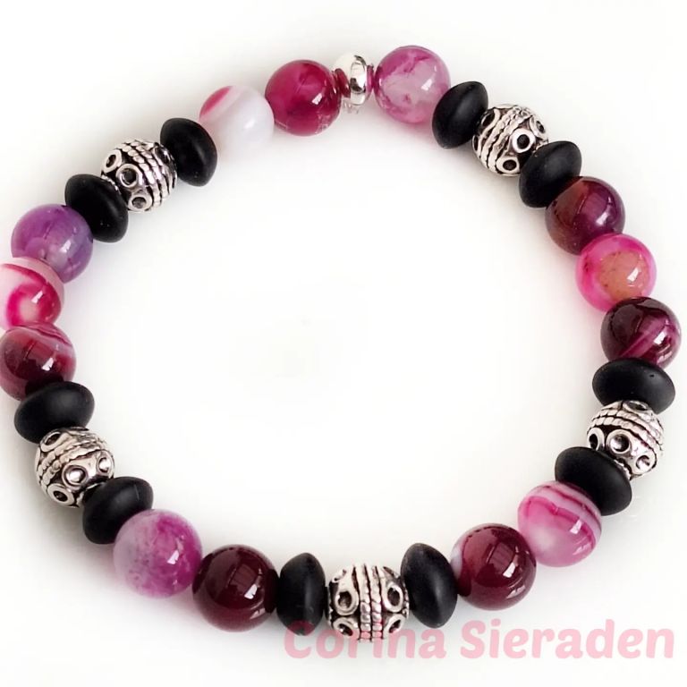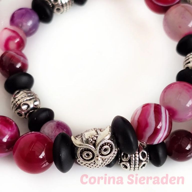 Prachtige armbandenset van sardonyx (AA kwaliteit, (8 en 10mm), agaat (abacus, mat) en tibetaans zilver, met sierkraal uiltje, geregen op elastiek. Polsmaat: 17-18 cm.