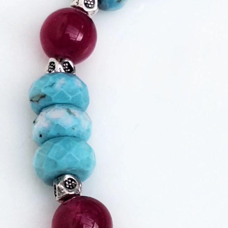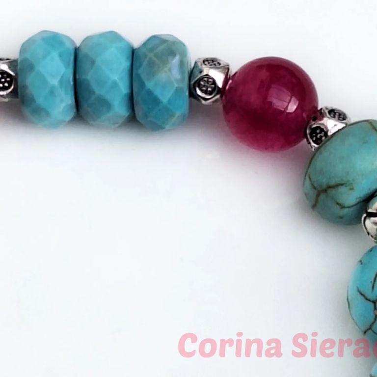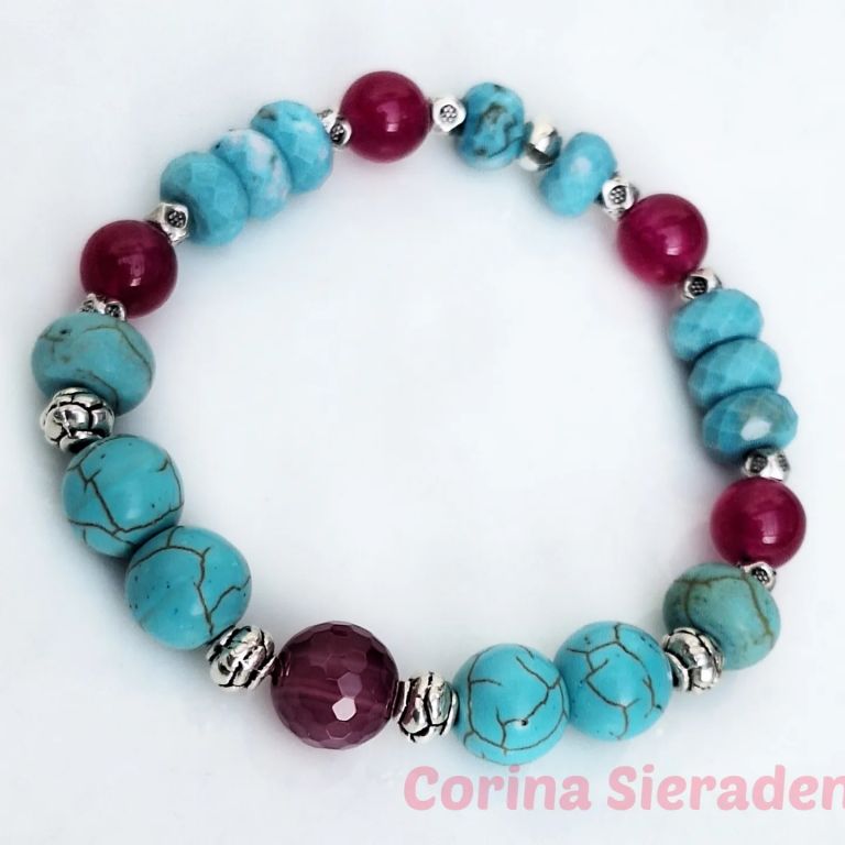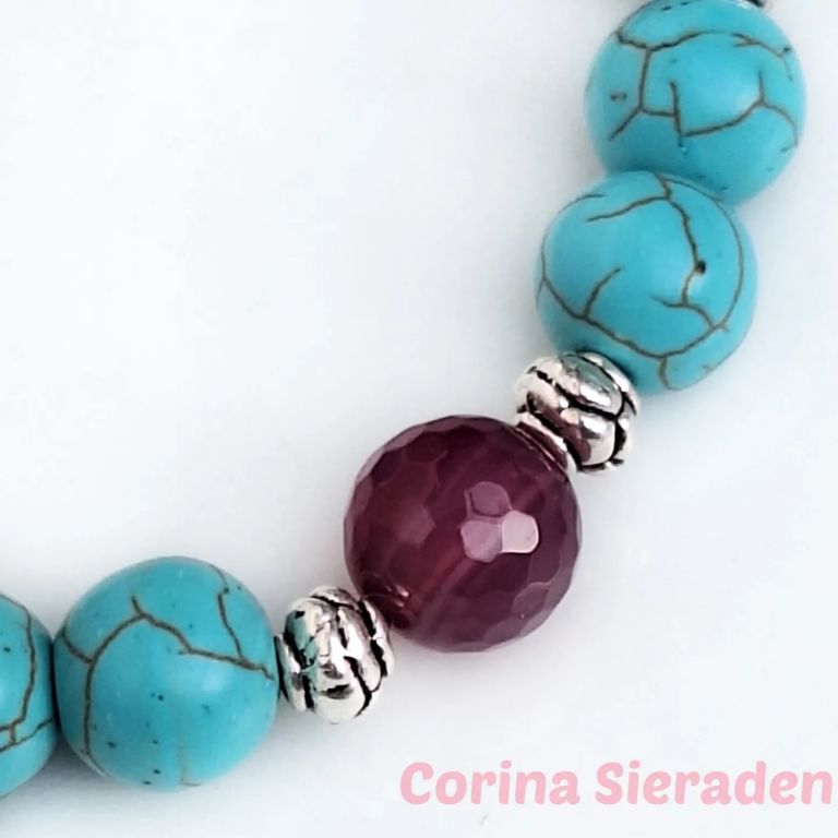 CORINA SIERADEN Armband van howliet, agaat, jade en tibetaans zilver, geregen op elastiek. Polsmaat: 17 cm.