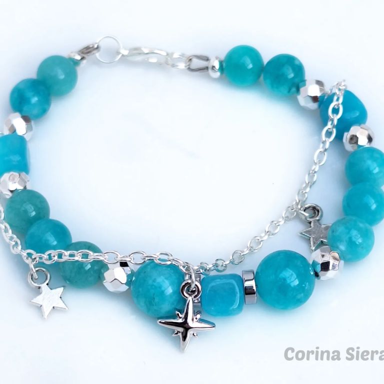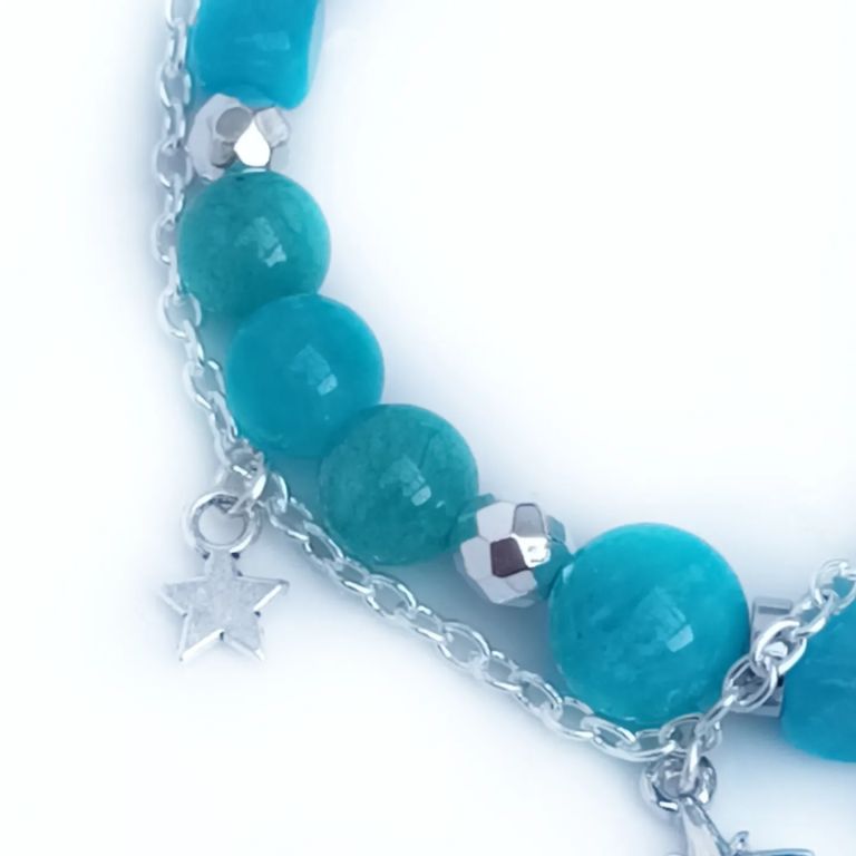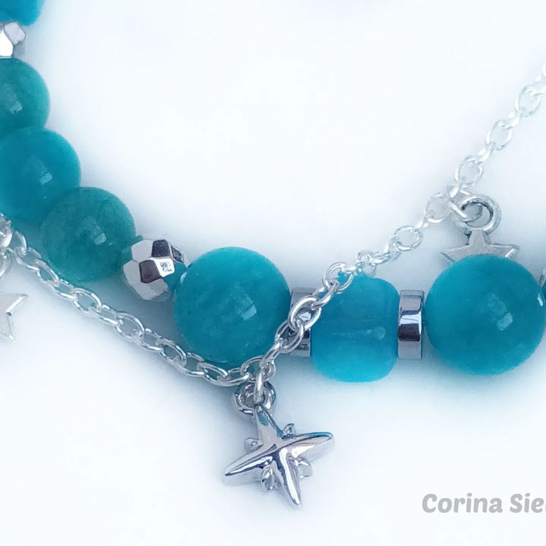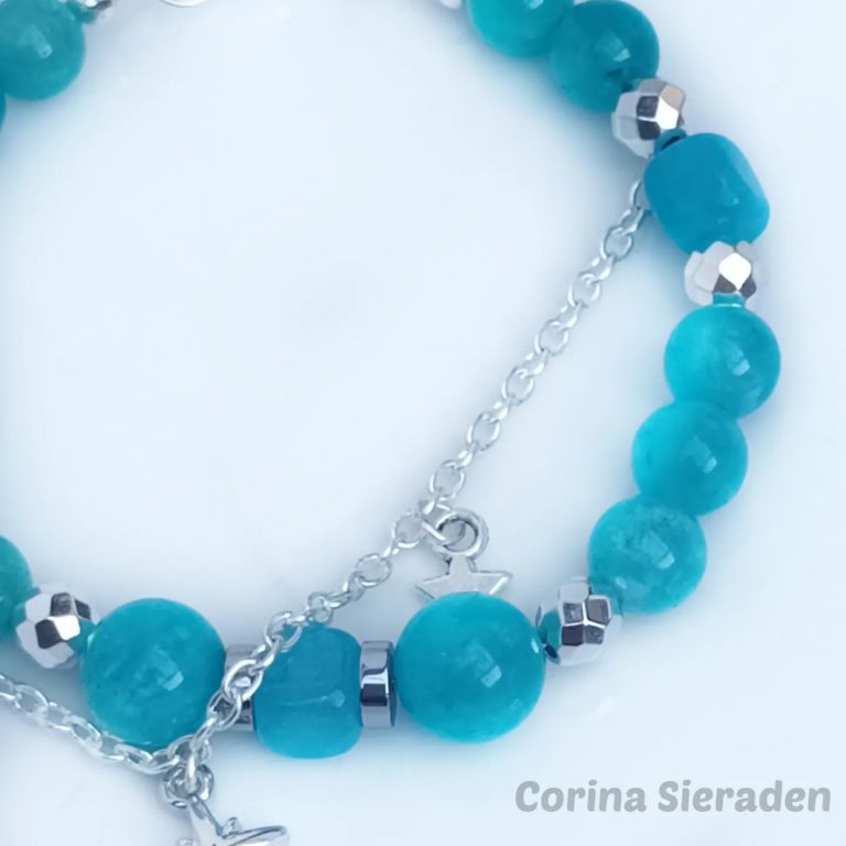 CORINA SIERADEN Armband van amazoniet en hematiet, met stukje verzilverde jasseron en bedeltjes. Polsmaat: 19 cm.