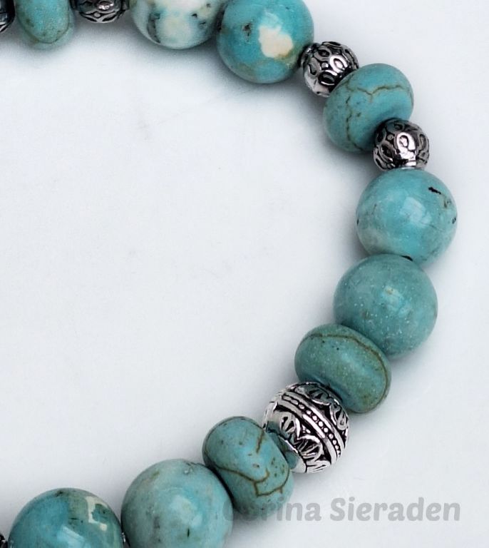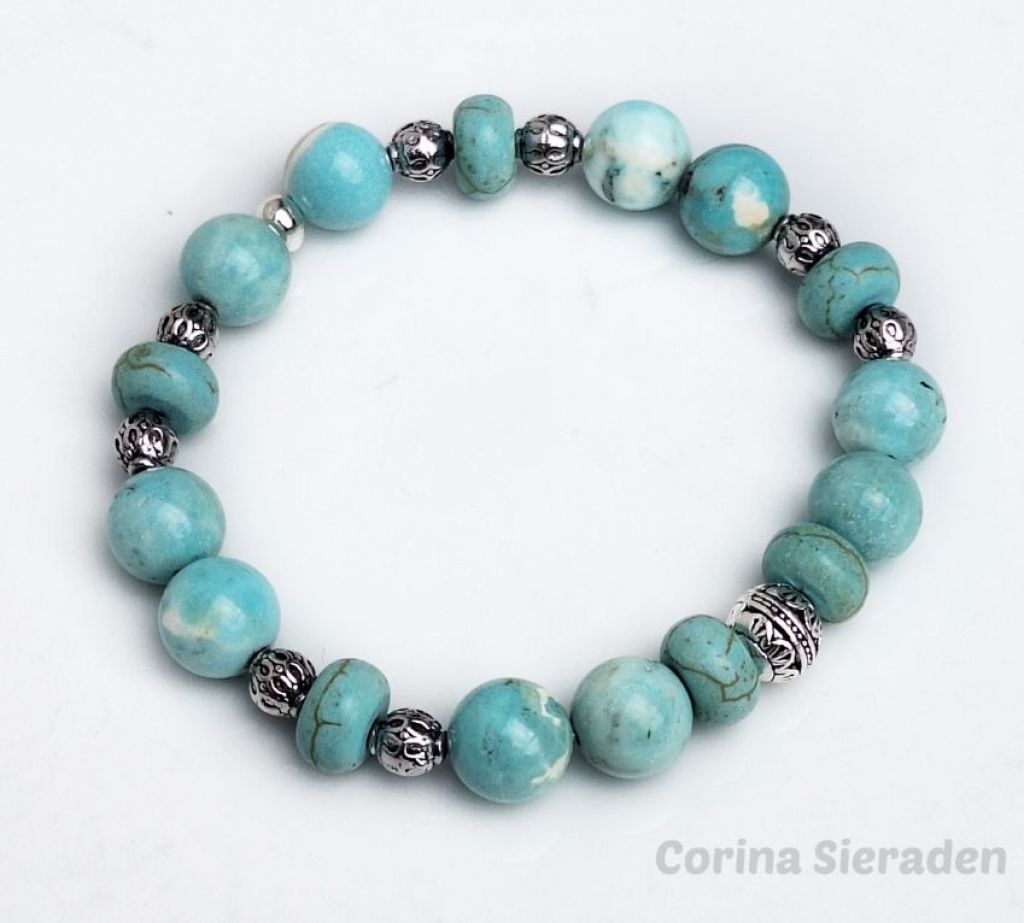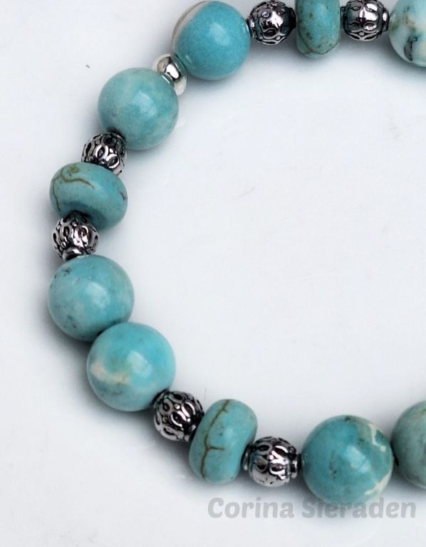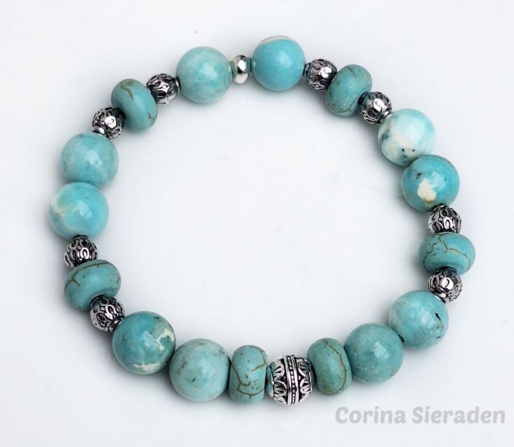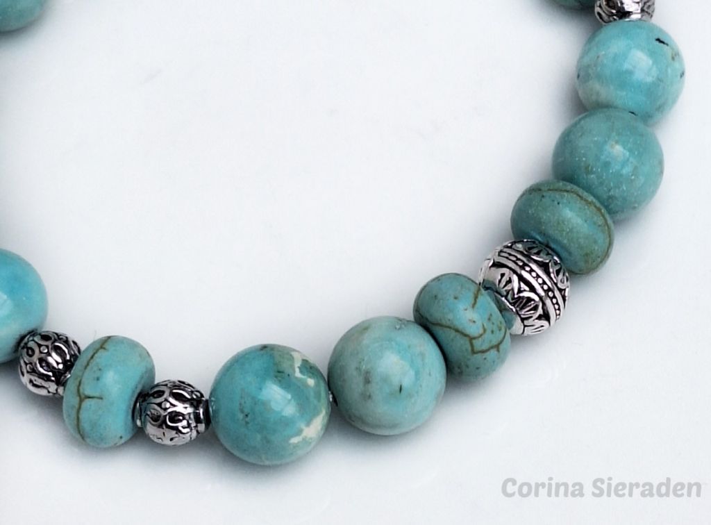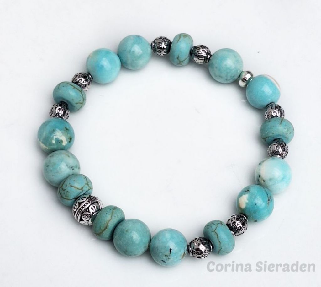 CORINA SIERADEN Armband van howliet (10 mm rond en rondelle) en tibetaans zilver, geregen op elastiek. Polsmaat: 18,5 cm.