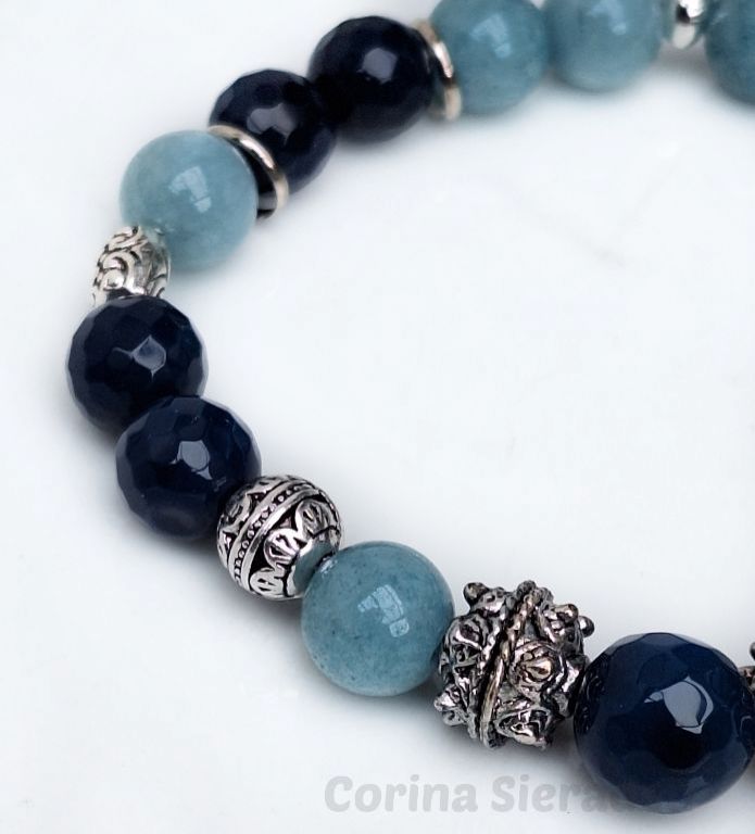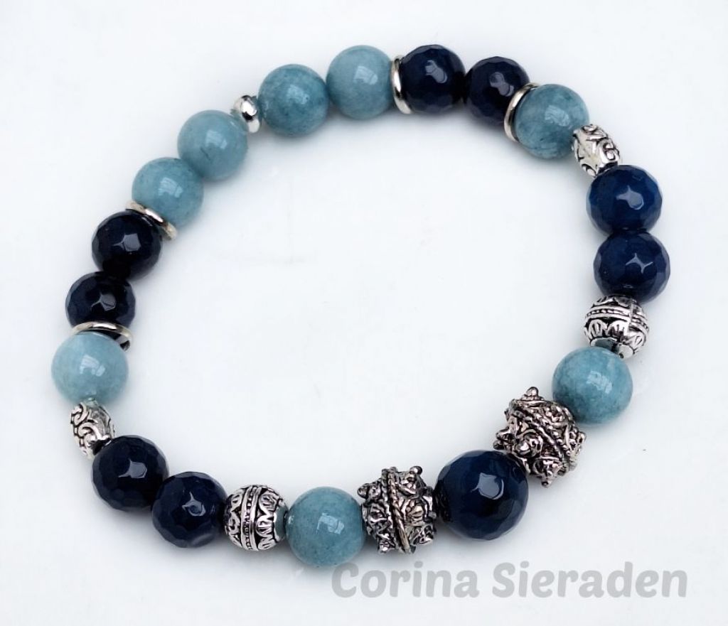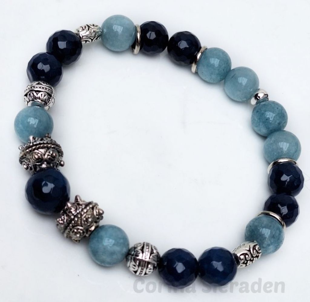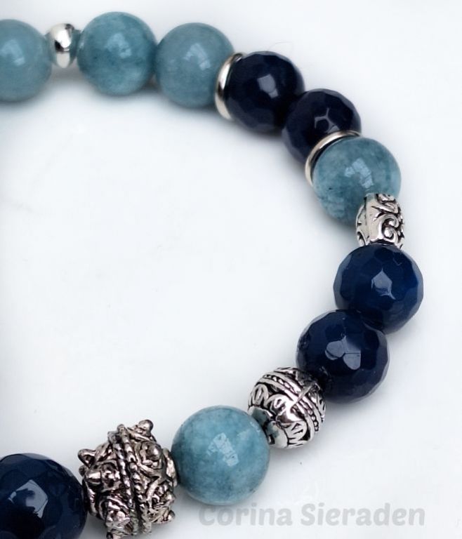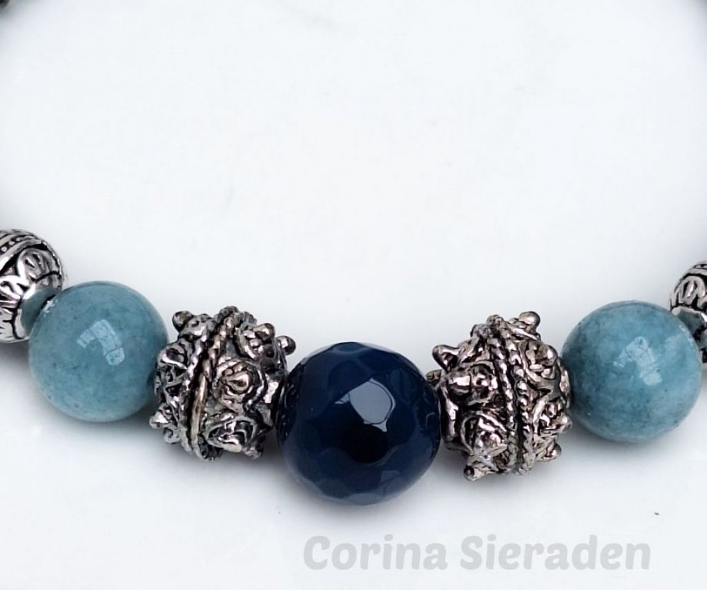 CORINA SIERADEN Herenarmband van facetgeslepen agaat, chalcedoon en tibetaans zilver, geregen op elastiek. Polsmaat: 21,5 cm.