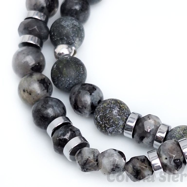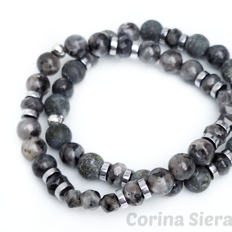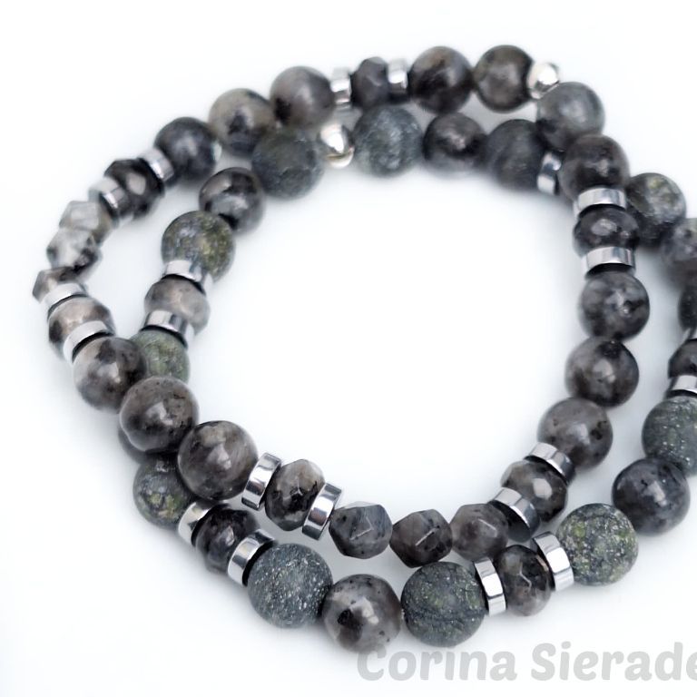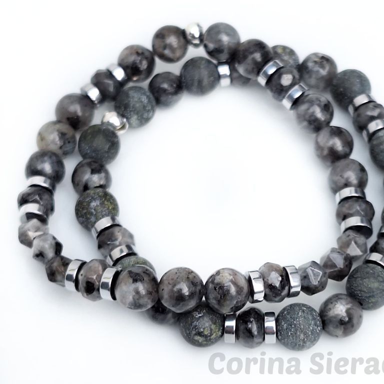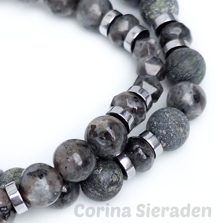 Laat jezelf stralen met deze prachtige armbandenset, samengesteld uit glanzende, matte en facetgeslepen labradorietstenen, verfraaid met glinsterend hematiet.