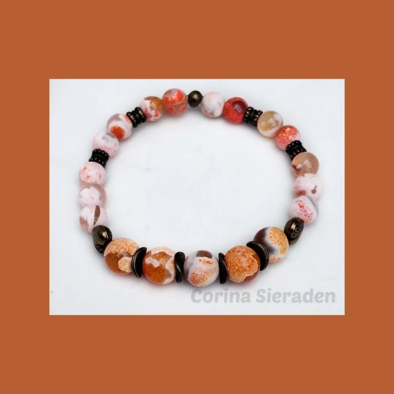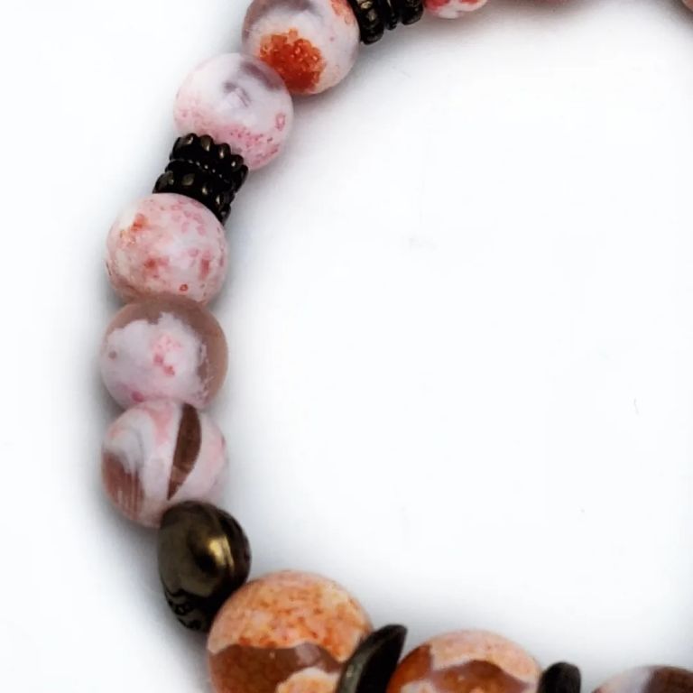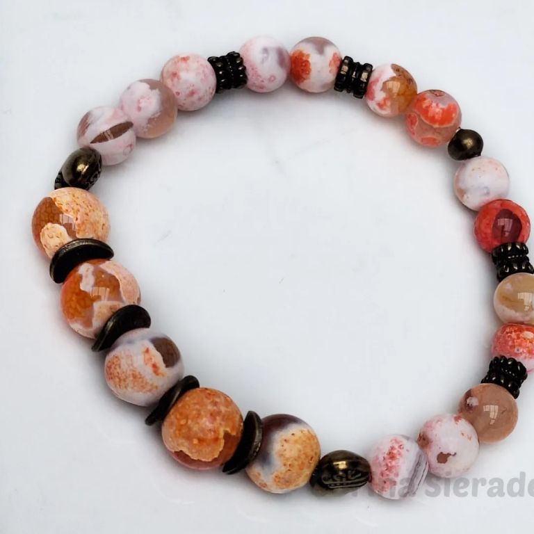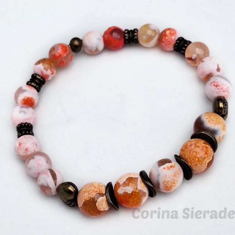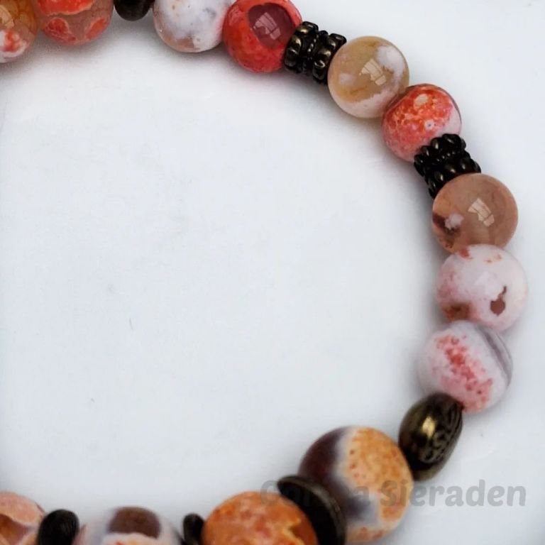 Armband van fire dragon veins agaat (8 en 10 mm) en brons, geregen op elastiek.