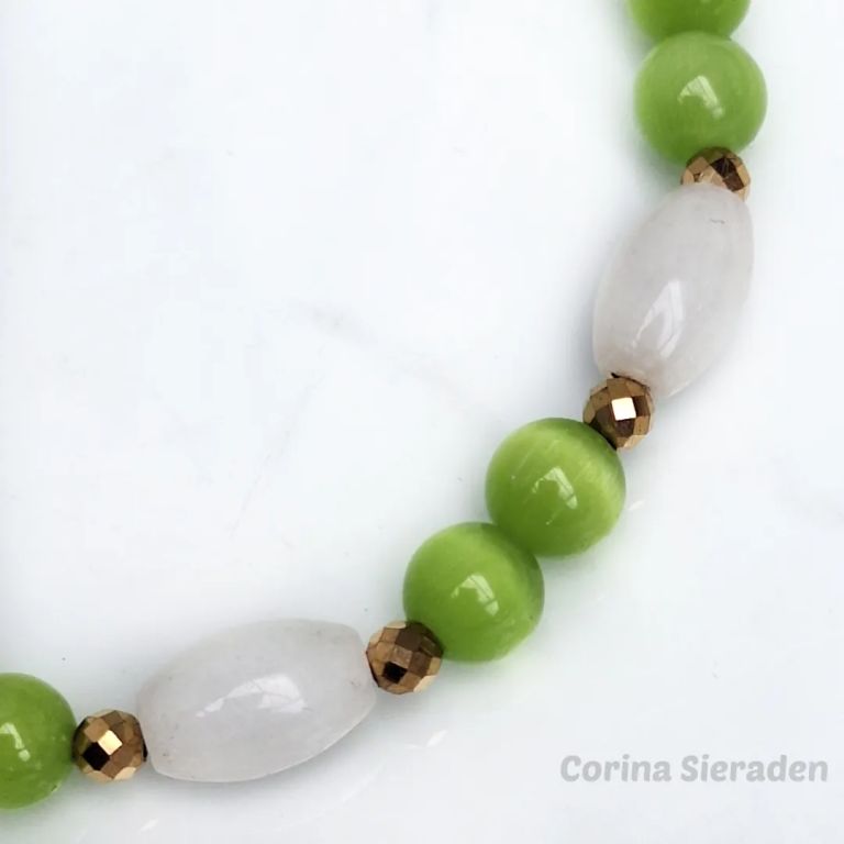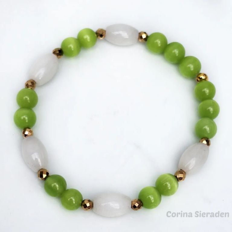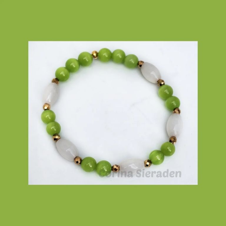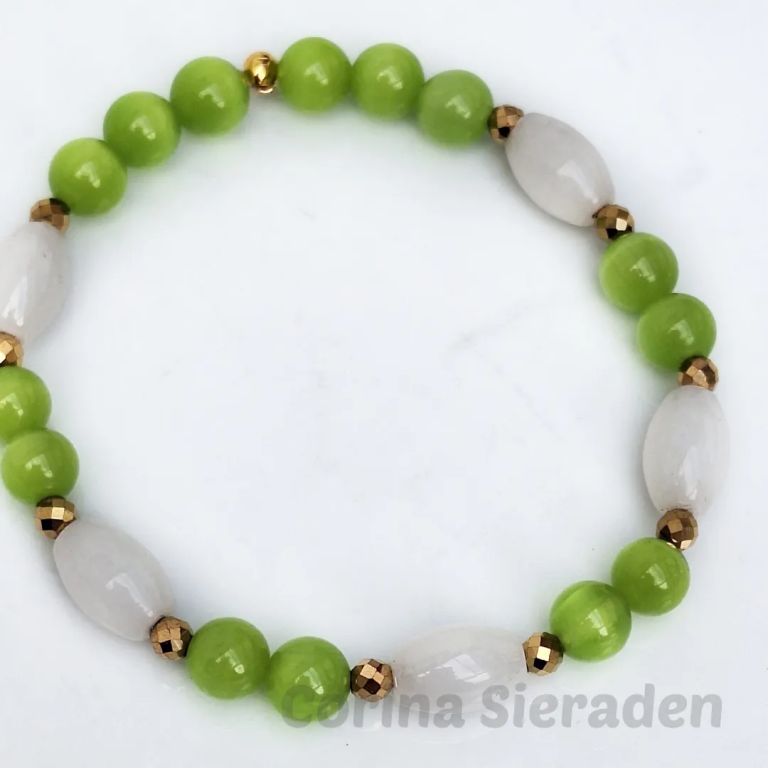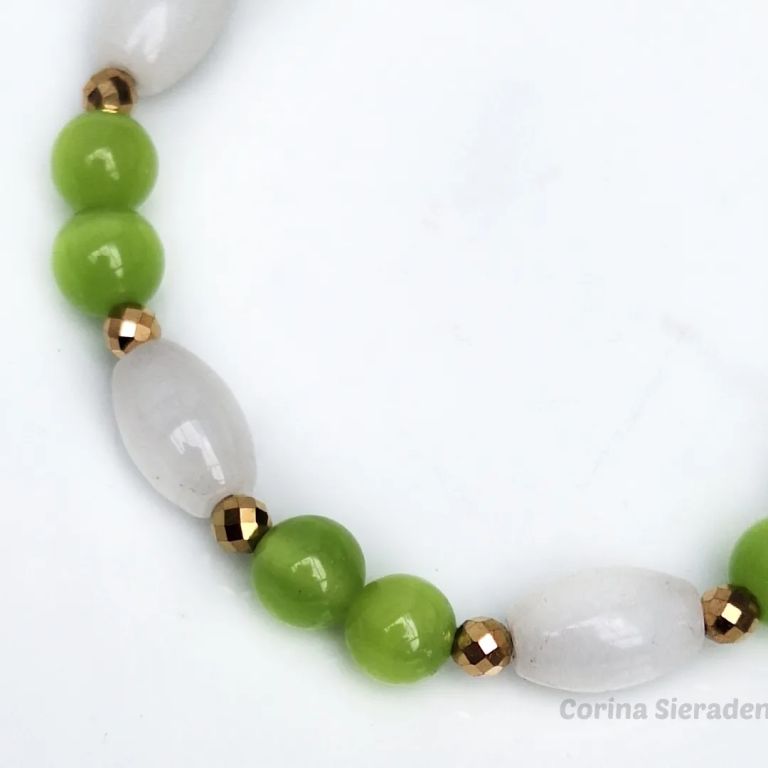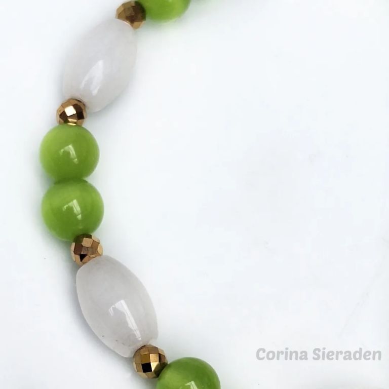 Armband van jade (8 mm), calciet (ovaal) en goudkleurige hematiet, geregen op elastiek.