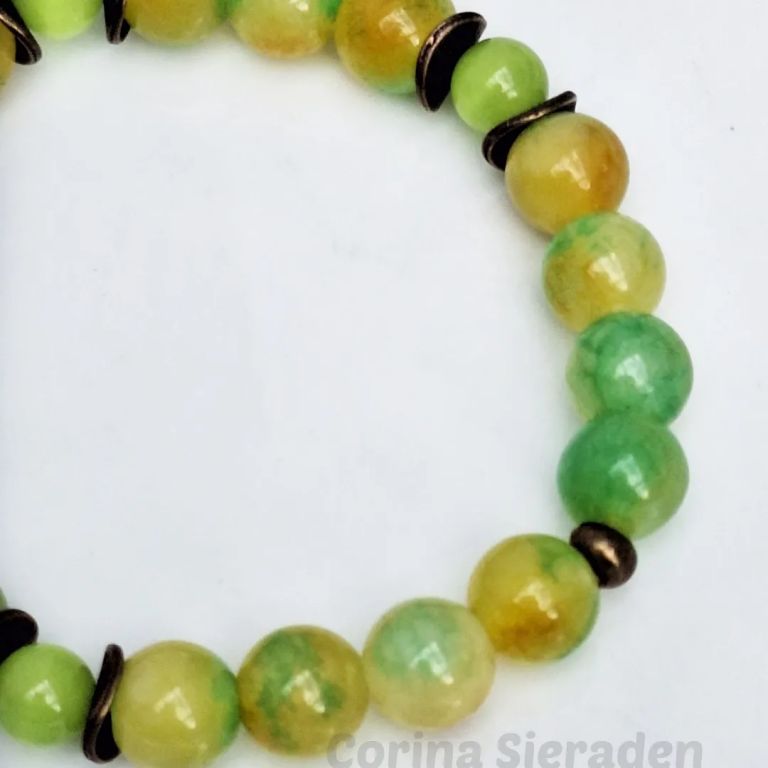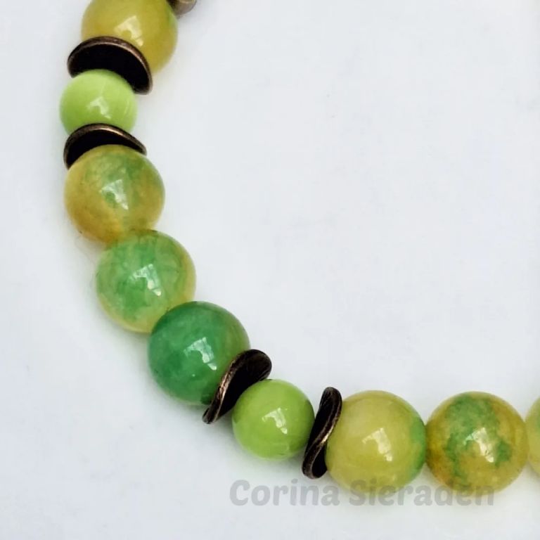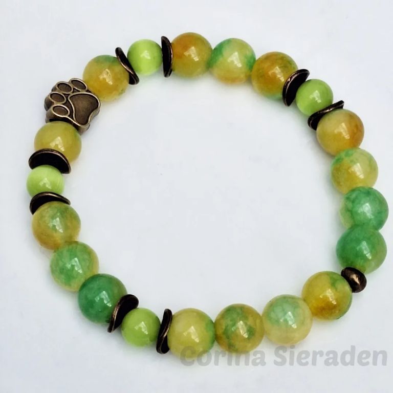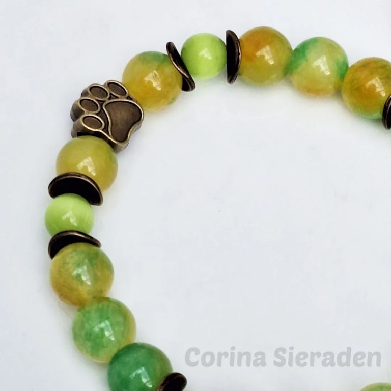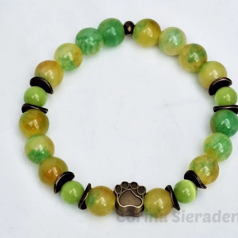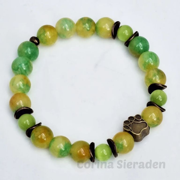 Armband van jade (8 mm), persian jade (10 mm) en brons, met bronzen sierkraal hondenpootje, geregen op elastiek.