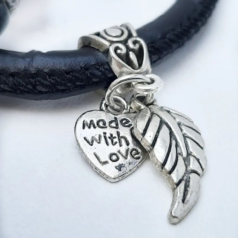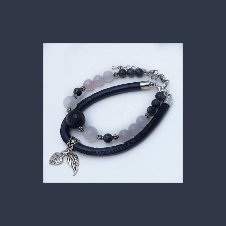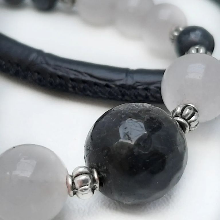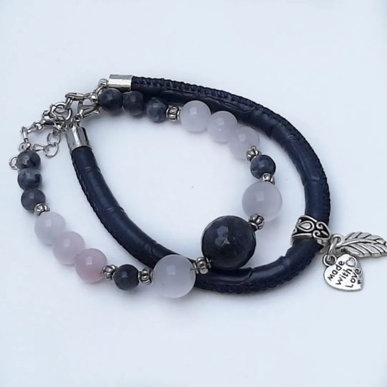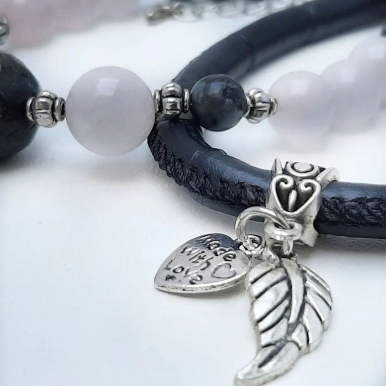 Armbandenset van labradoriet, rose quartz, tibetaans zilver en leer, met bedels en verlengkettinkje. Polsmaat: 18 cm.