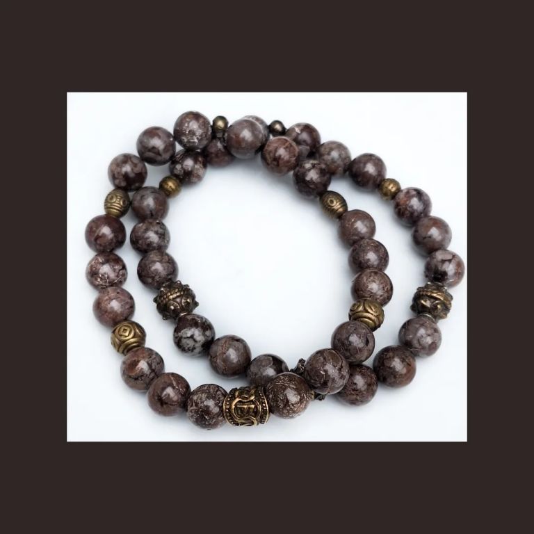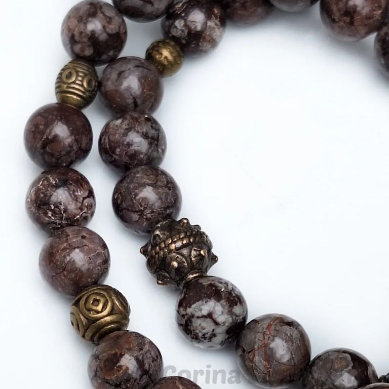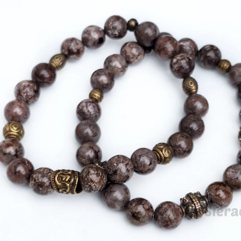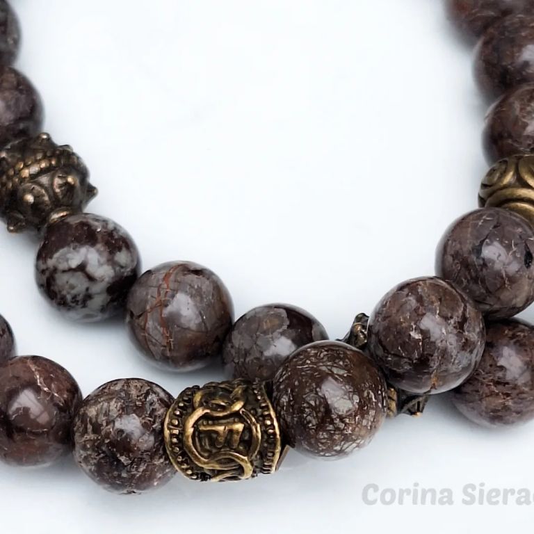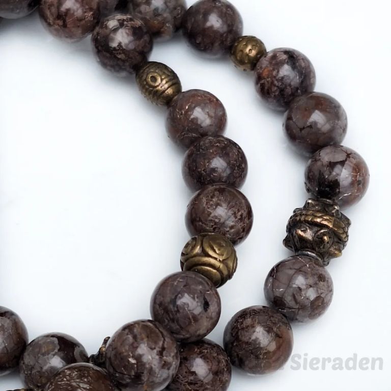 Heren armbandenset van jaspis (10 mm) en brons, geregen op elastiek. Polsmaat: 22 cm.
