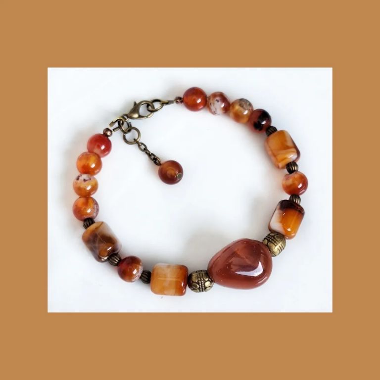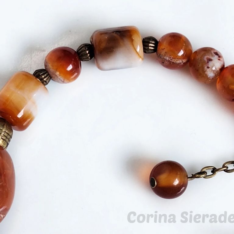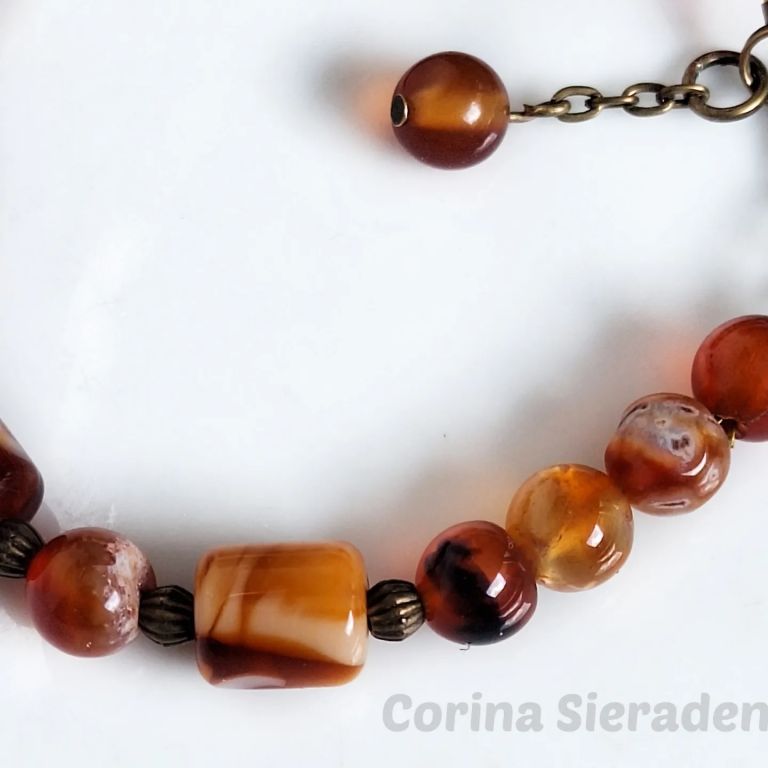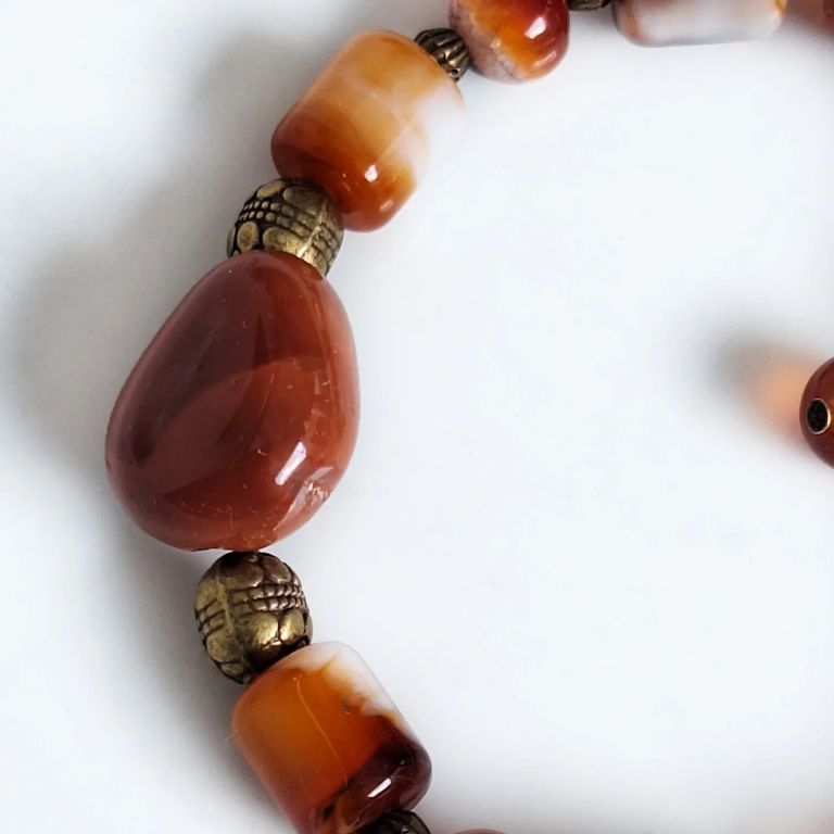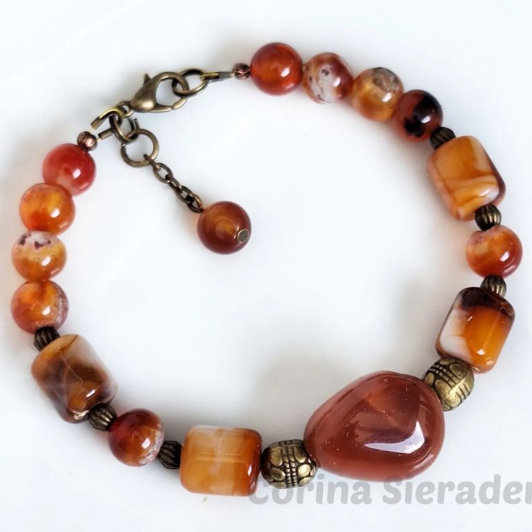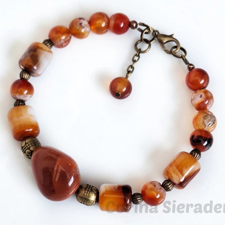 Bijvoorbeeld deze armband van carneool (8 mm rond, tonnetjes en onregelmatig) en brons.