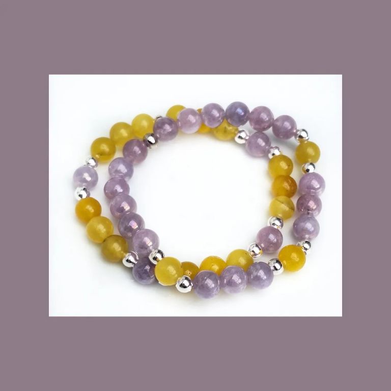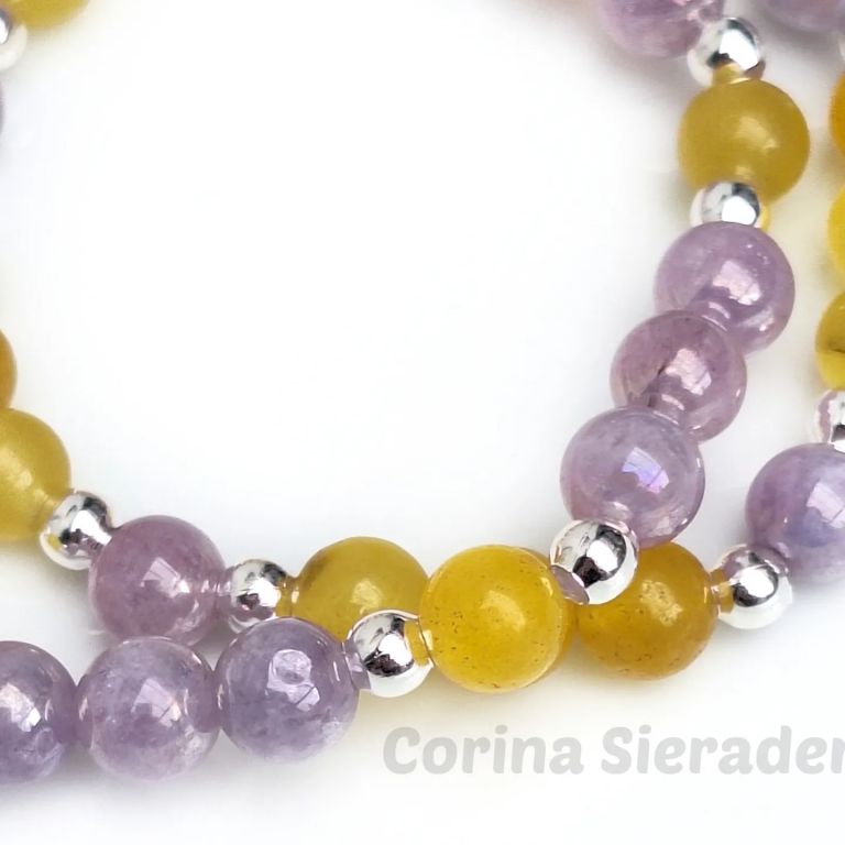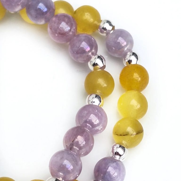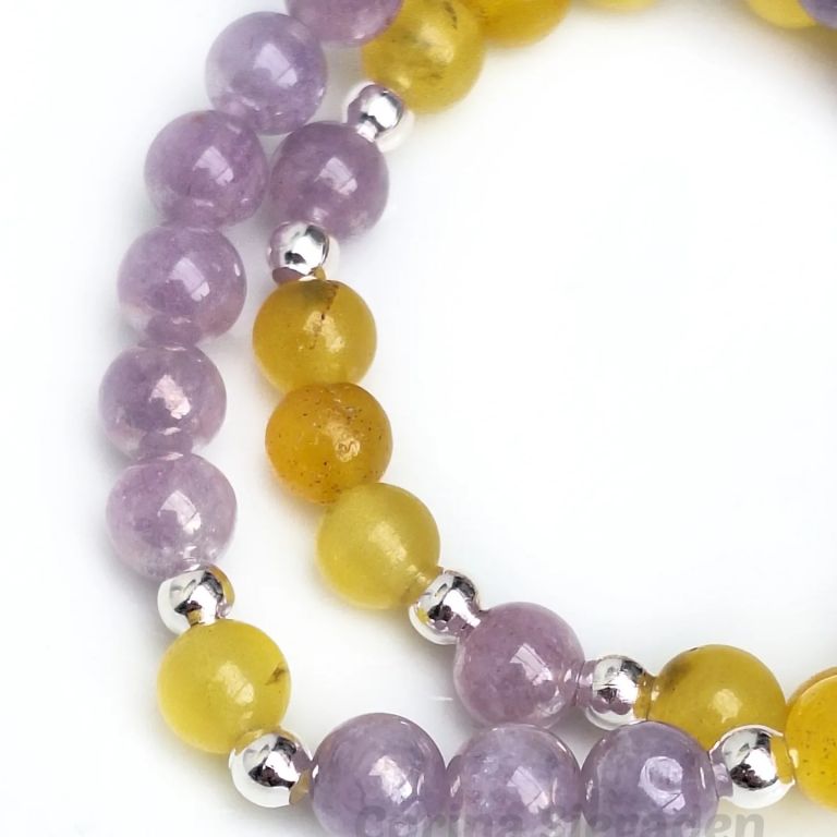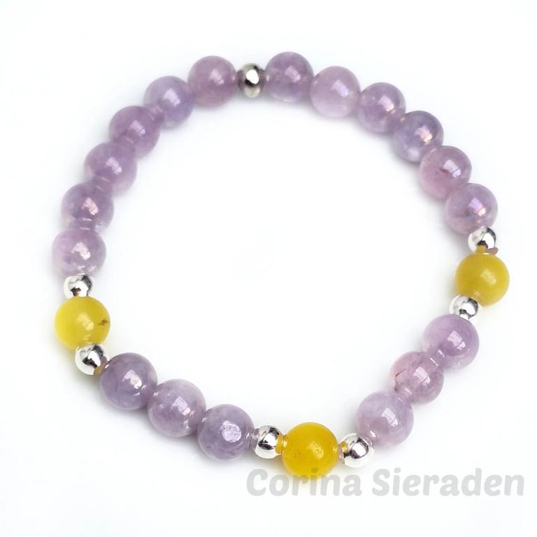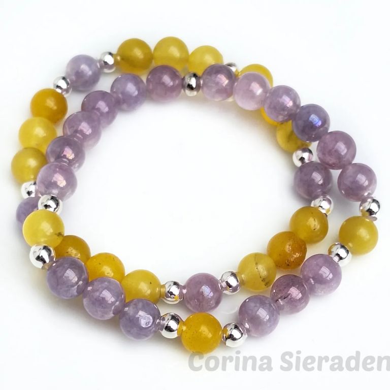 Armbandenset van agaat (8 mm), angeliet (8 mm) en zilverkleurige spacers, geregen op elastiek.