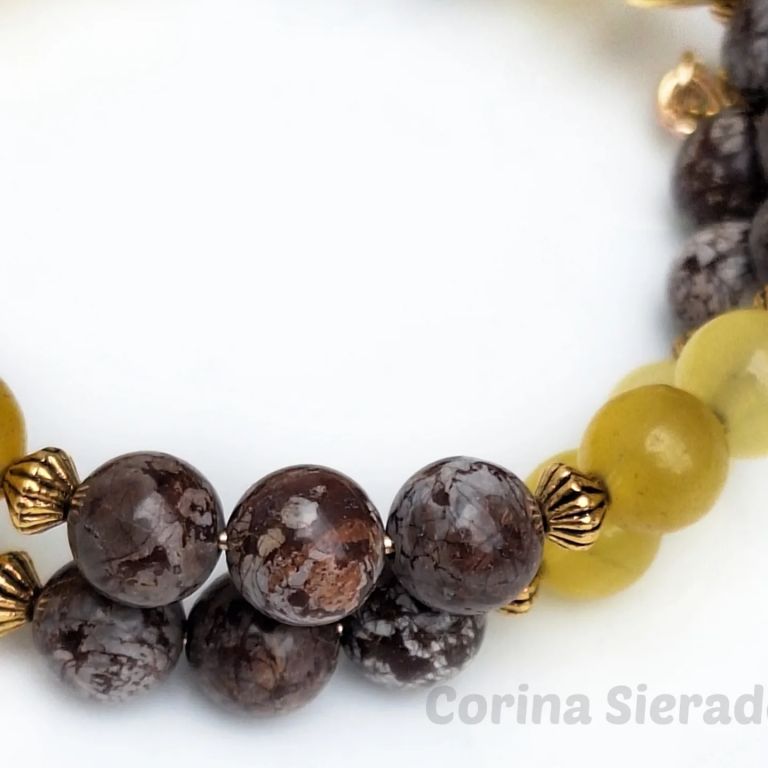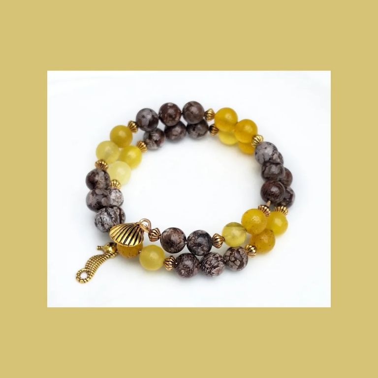 Memory wire armband van agaat (8 mm), snowflake obsidiaan (8 mm) en goudkleurige spacers, met bedels. Eén maat.