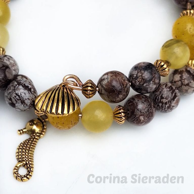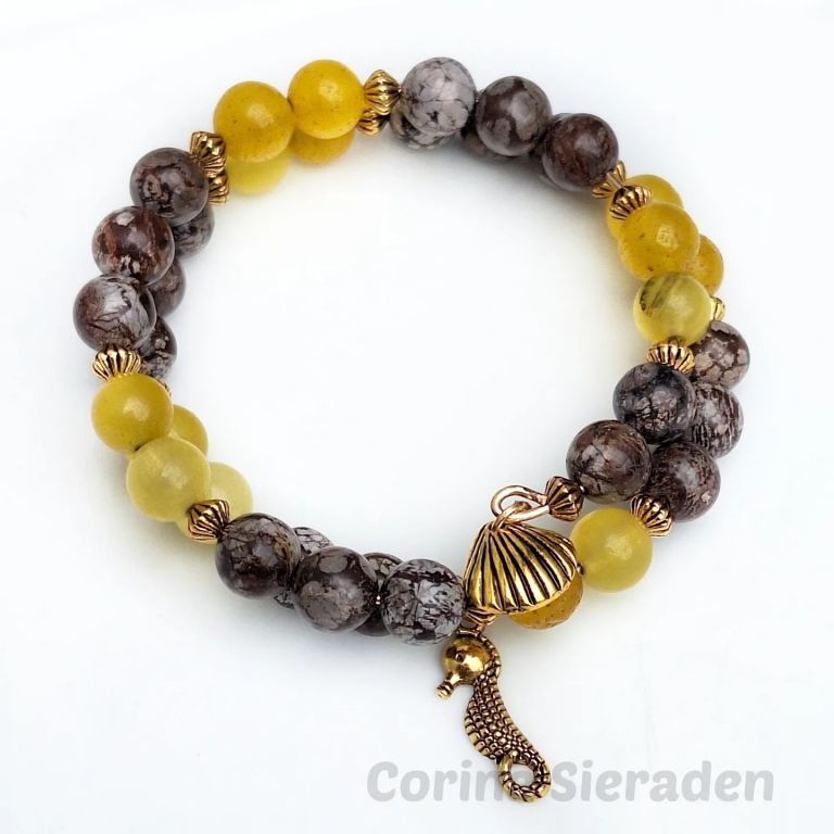 CORINA SIERADEN Dubbele armband van mosagaat (8 mm), calciet (8 mm) en hematiet spacers. Polsmaat: 19 cm. U kunt mij volgen op Facebook corinasieraden en Instagram