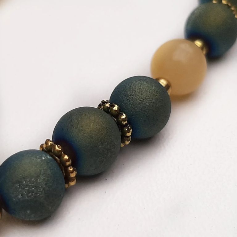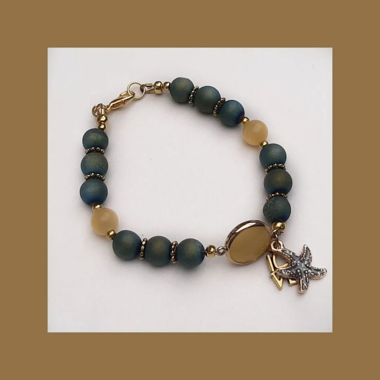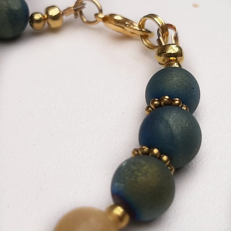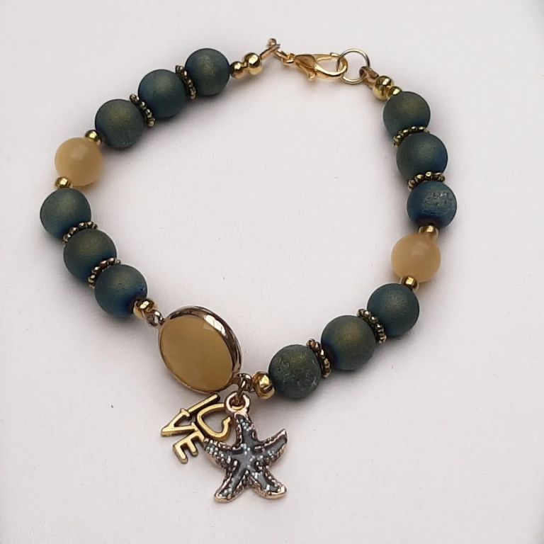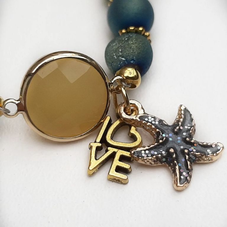 Armband van druzy agaat, topaas jade en goudmetaal, met mooi tussenstuk van jade in cabochon en bedeltjes zeester en love.