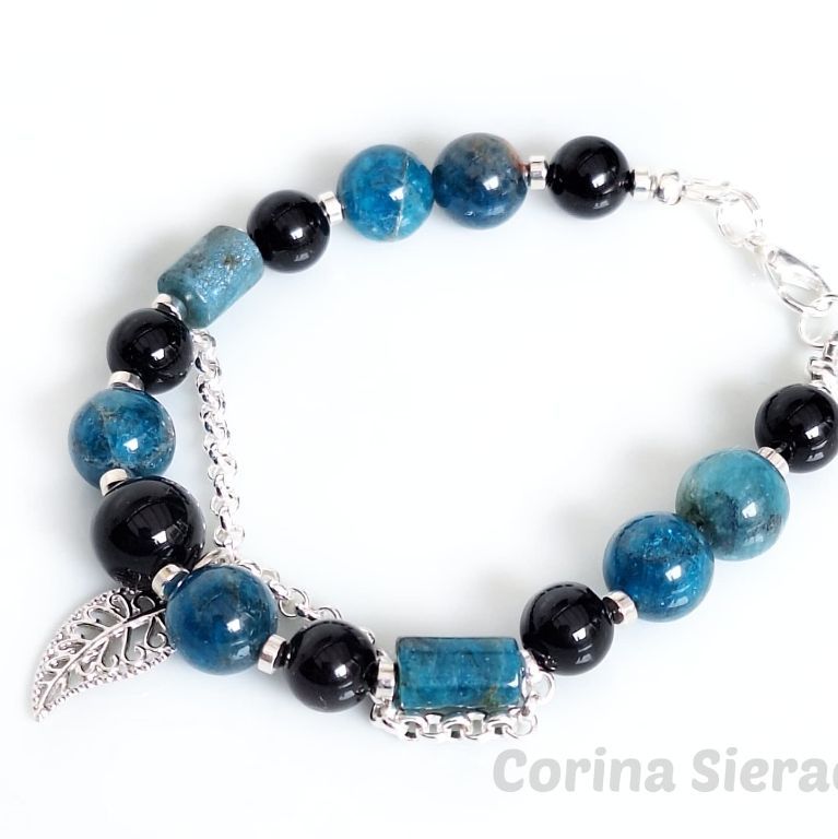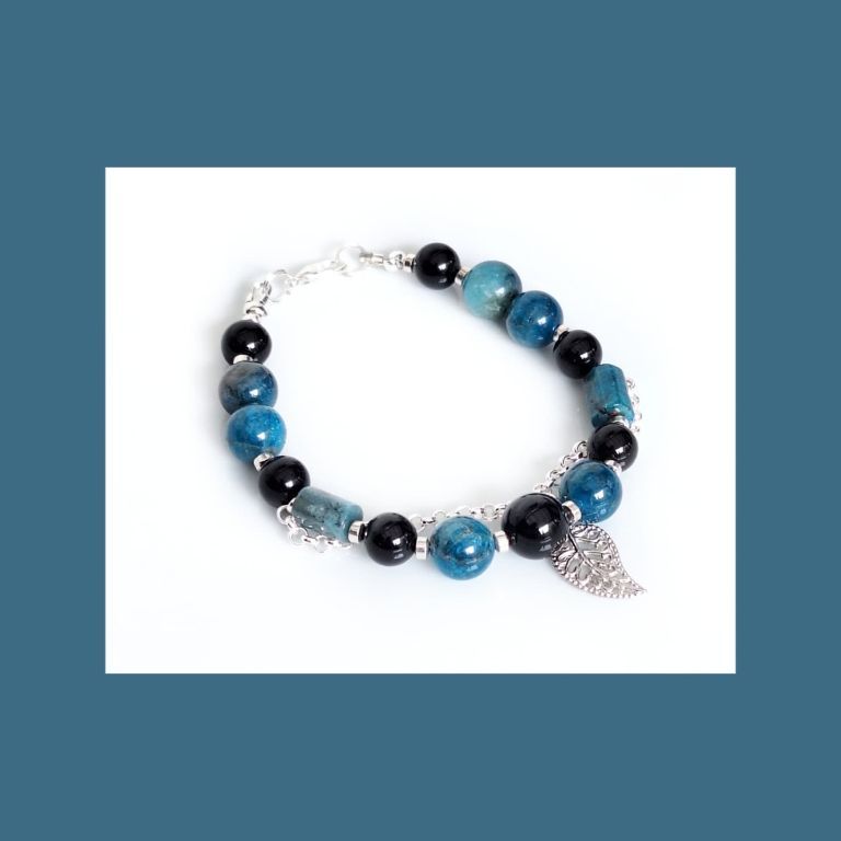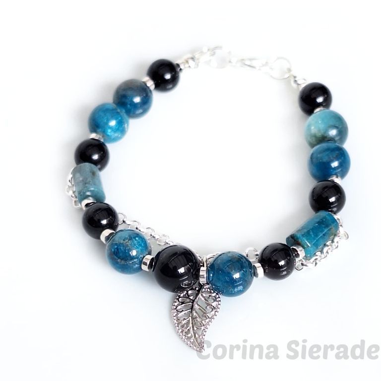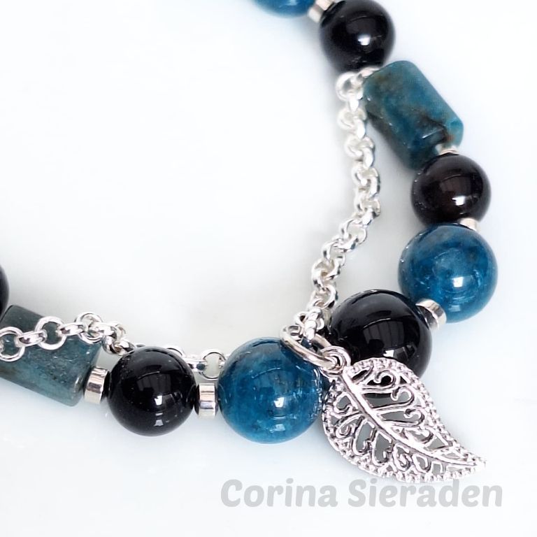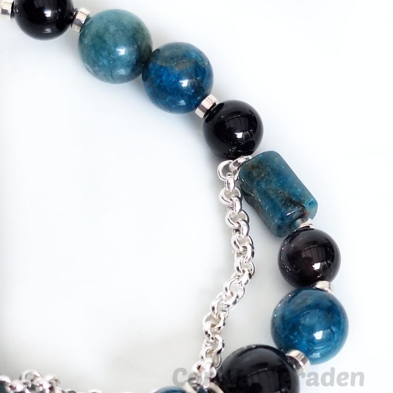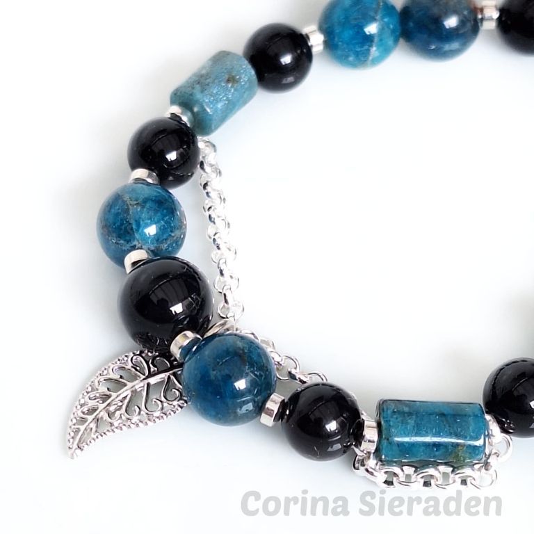 Armband van blue apatiet (10 mm en facetgeslepen 5x8 mm), onyx (8 en 10 mm) en hematiet, met stukje jasseron en filigraan bedel.
