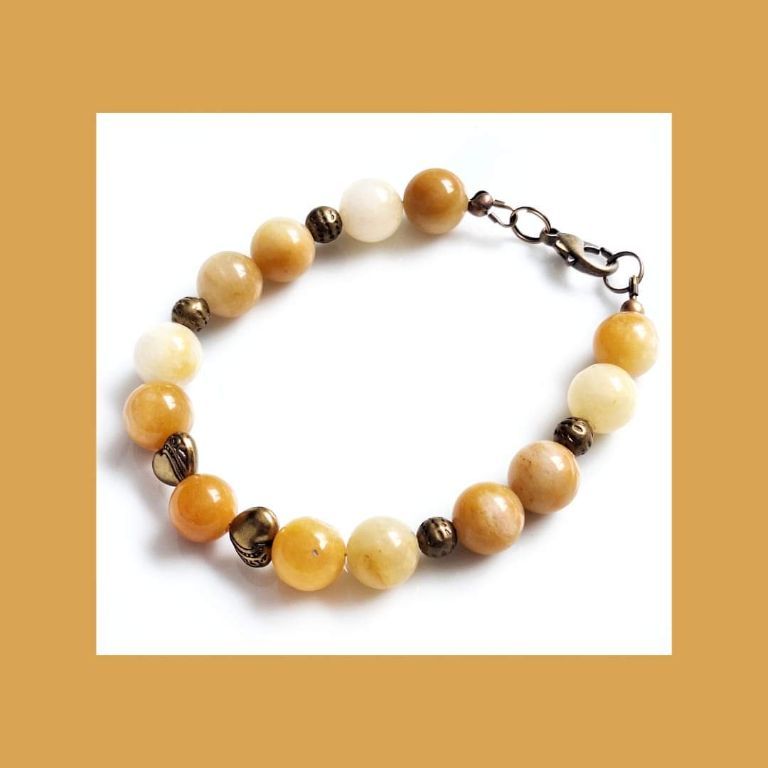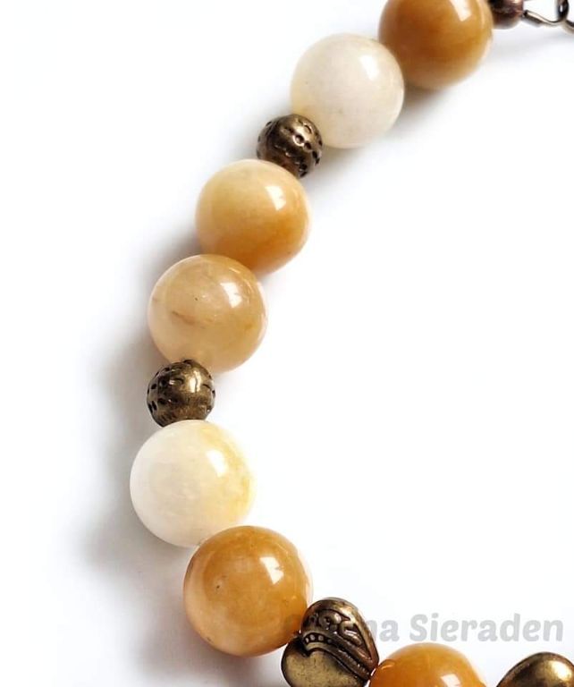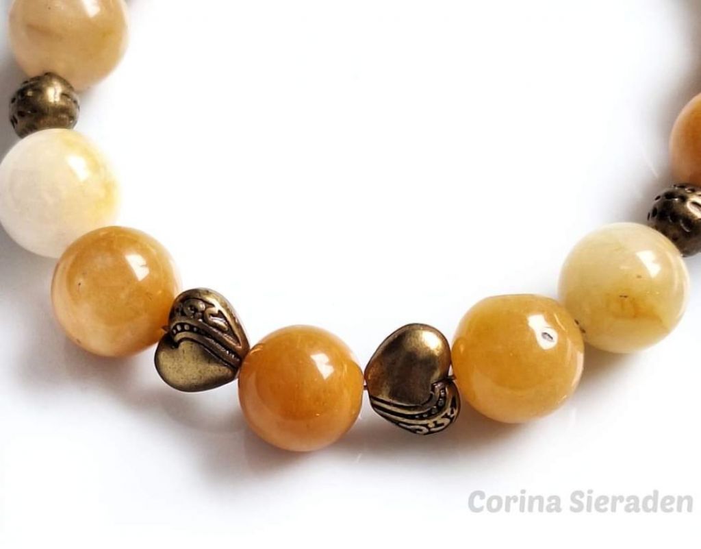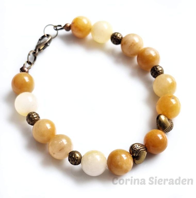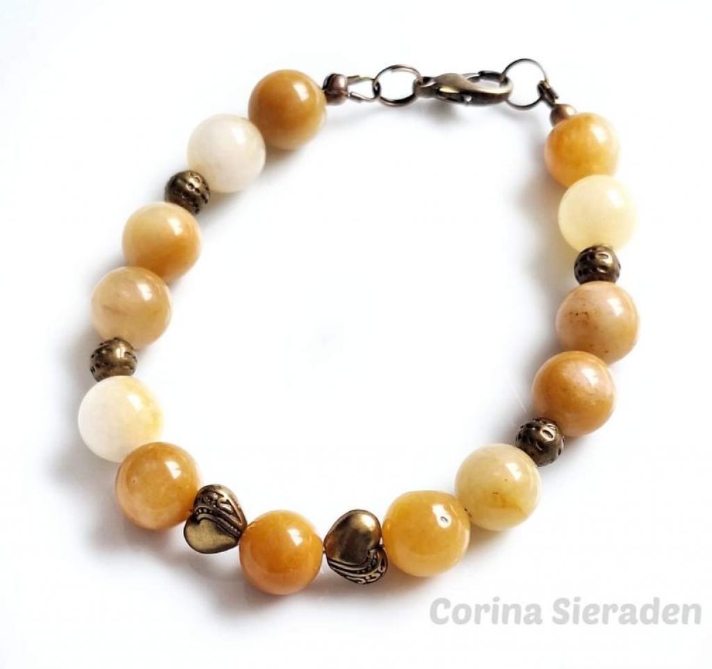 De armband is gemaakt van spring jade (10 mm) en brons.
