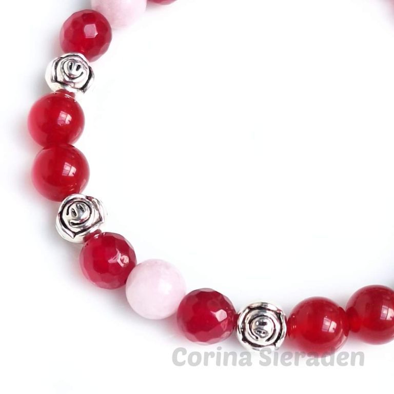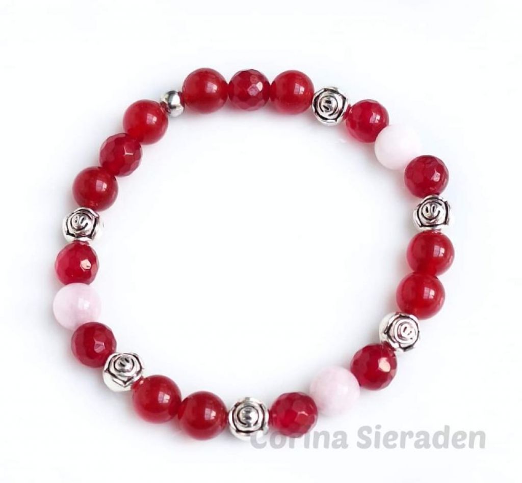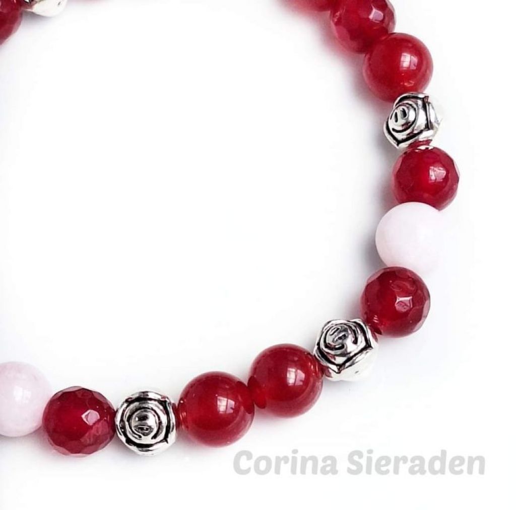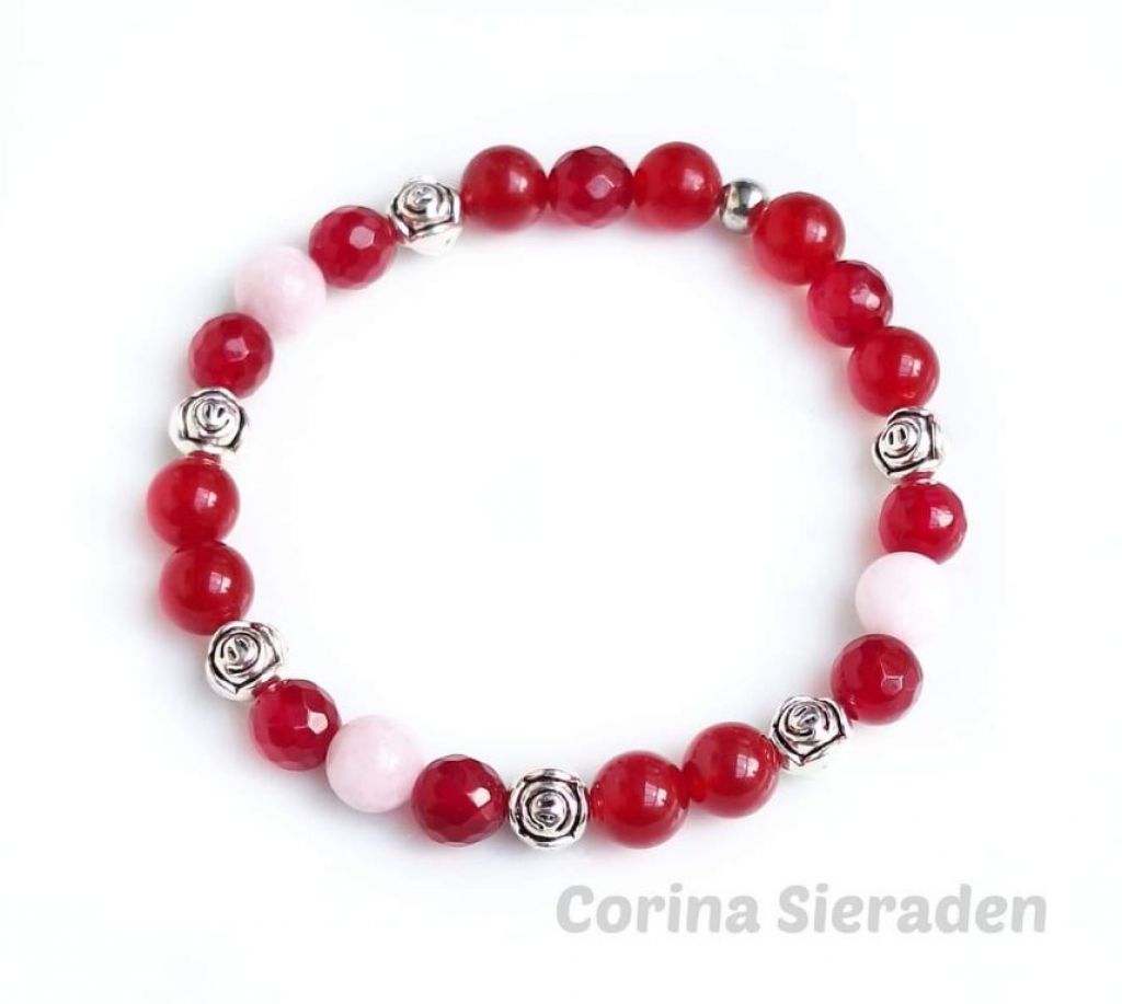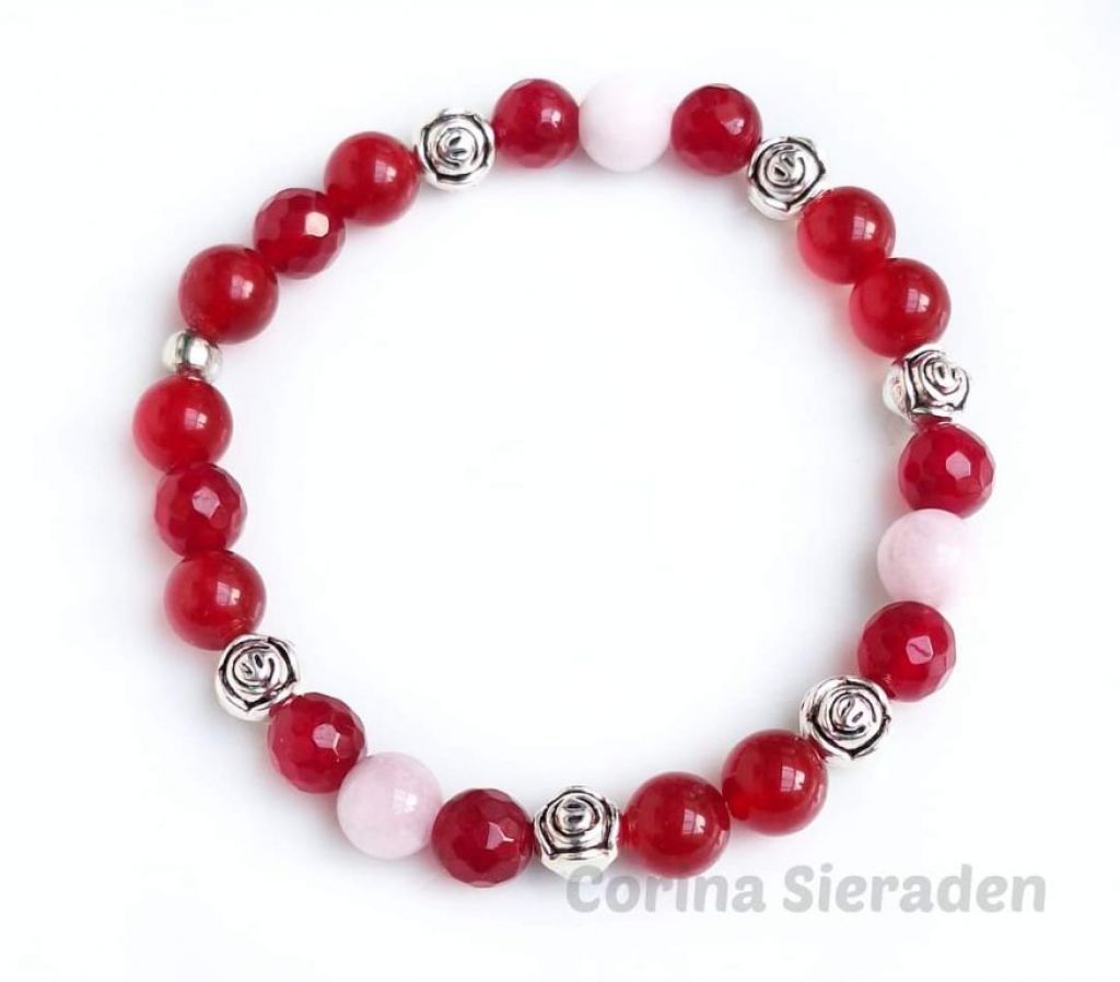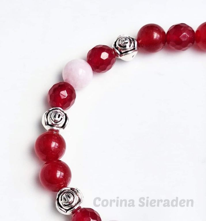 Armband van rode jade (8 mm rond en facetgeslepen), kunziet (8 mm) en tibetaans zilver, geregen op elastiek. Polsmaat: 19 cm. +