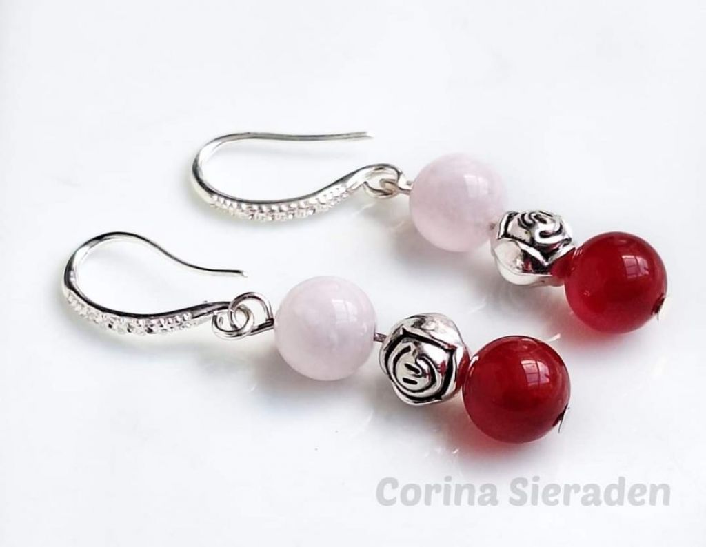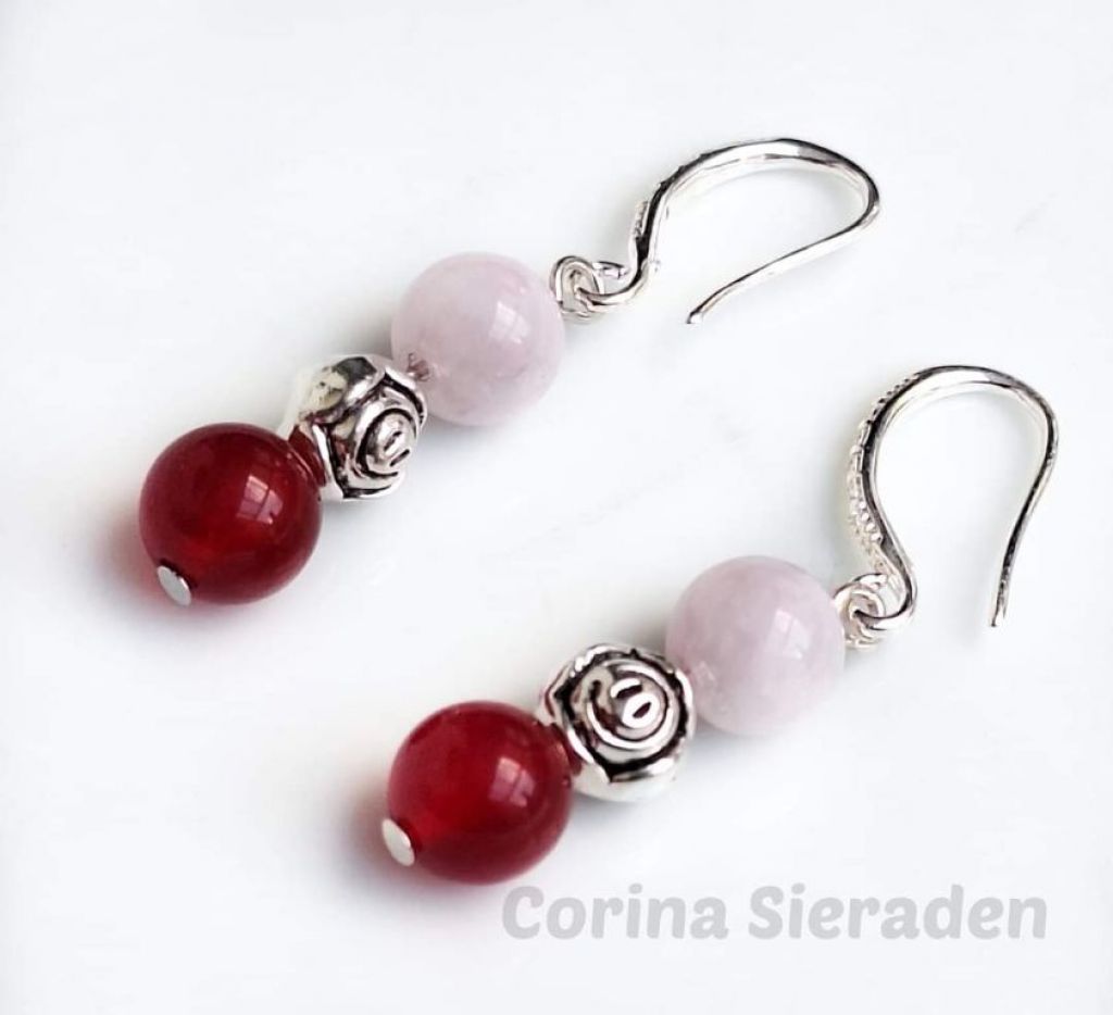 RVS oorhangers (klein beetje strass) met rode jade (8 mm), kunziet (8 mm) en tibetaans zilver.