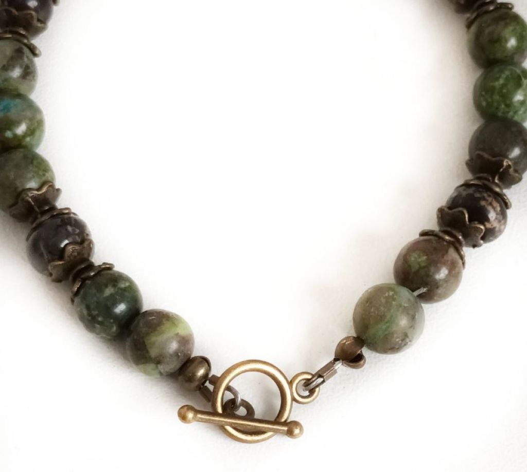 Armband van varisciet, howliet (rondelle bijgekleurd) en brons, met kapittelslotje van brons.