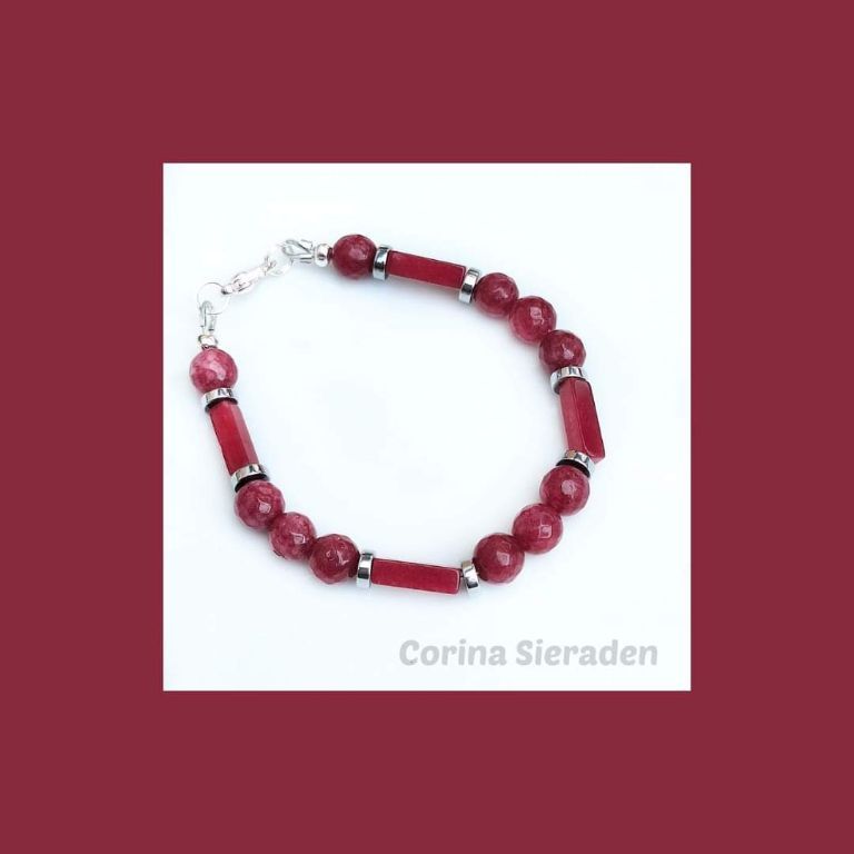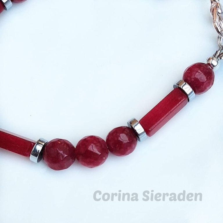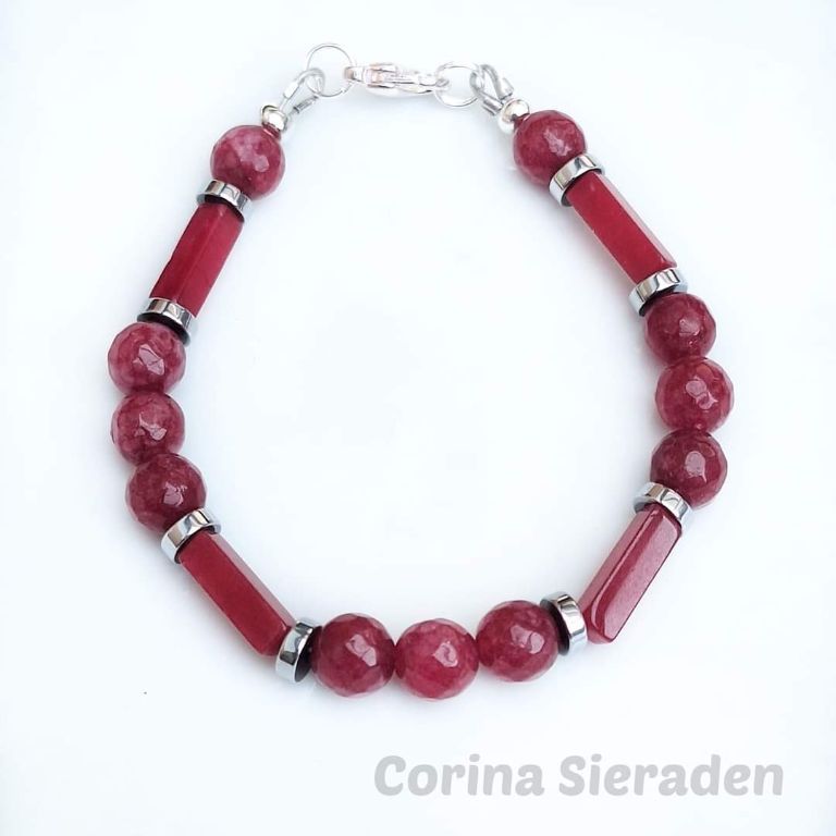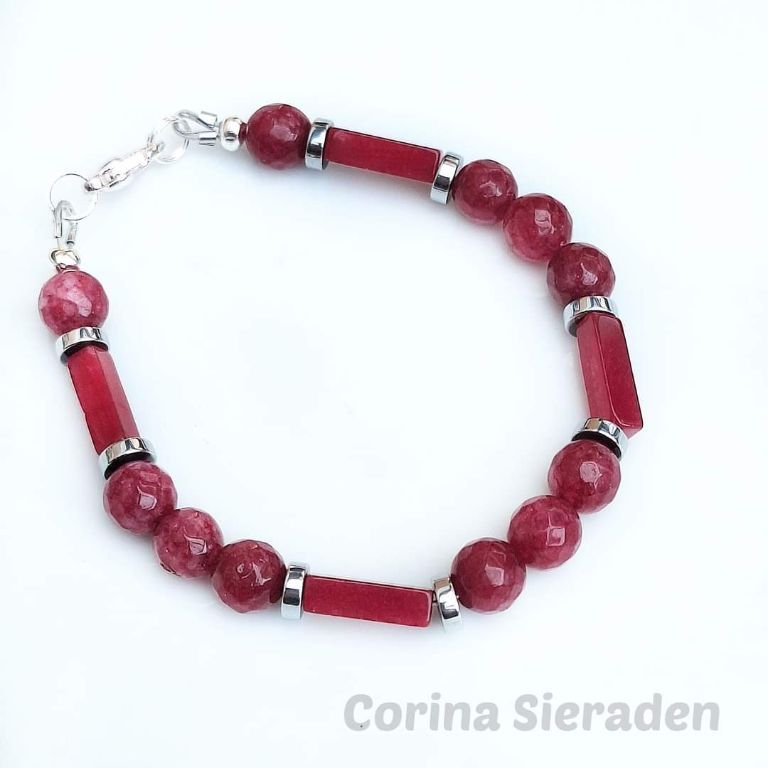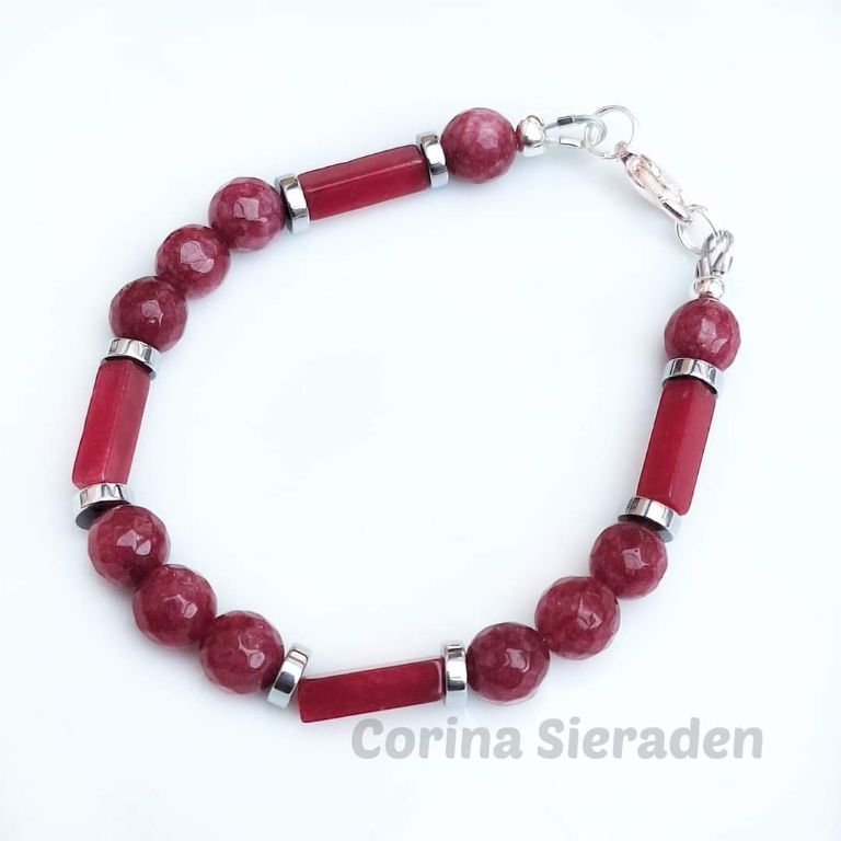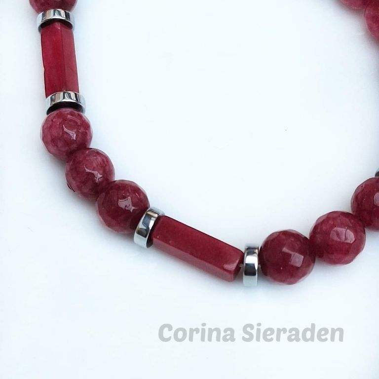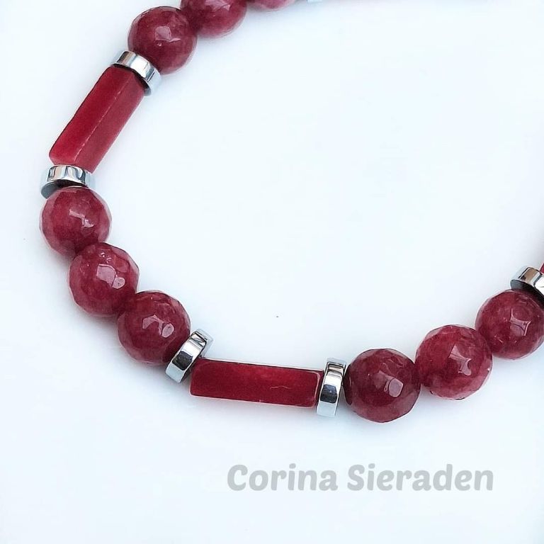 Armband van rode chalcedoon (8 mm facetgeslepen en 4x13 mm buis) en hematiet schijfjes.