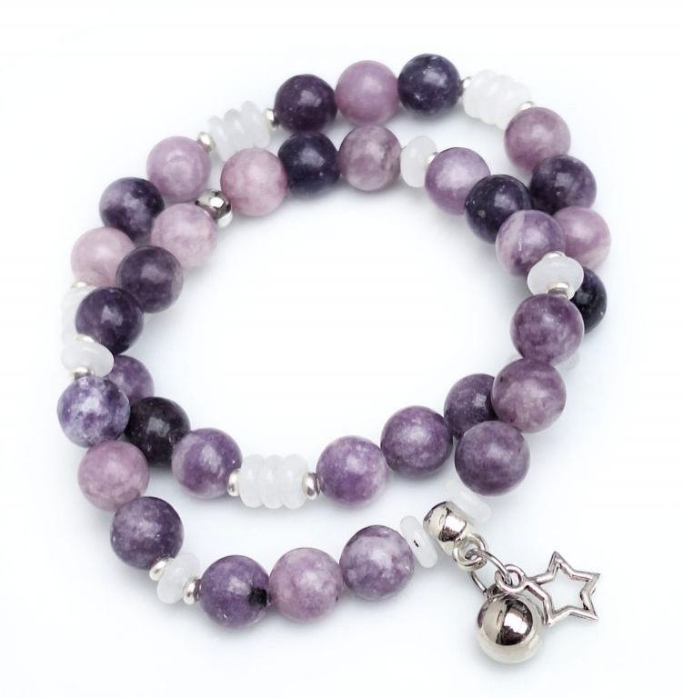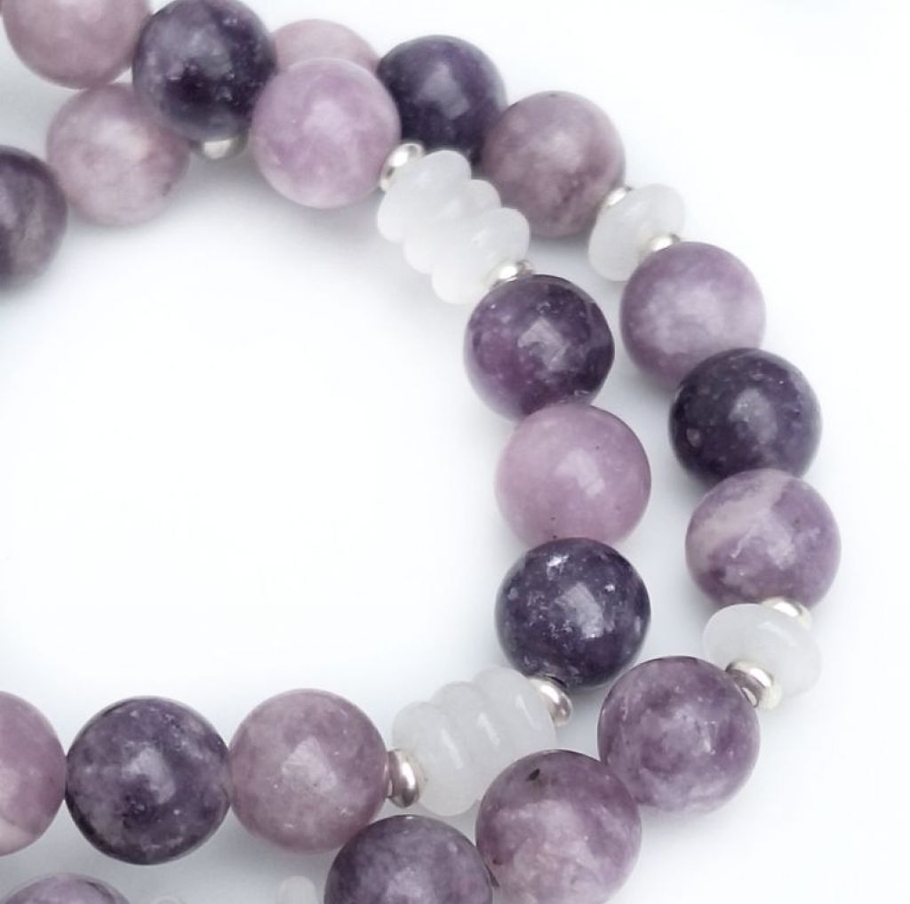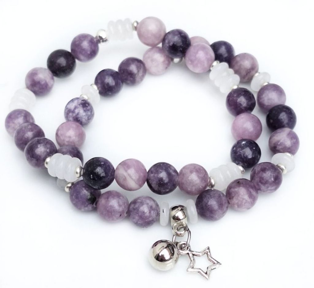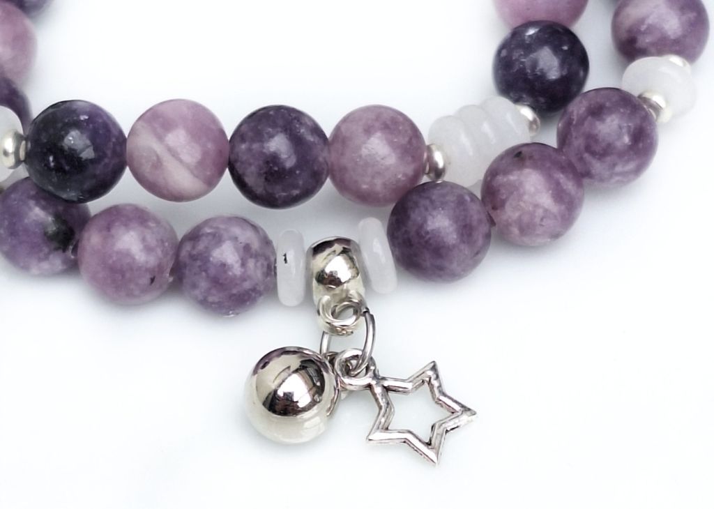 Armbandenset van lepidoliet, jade en zilverkleurige spacers, met bedels, geregen op elastiek.