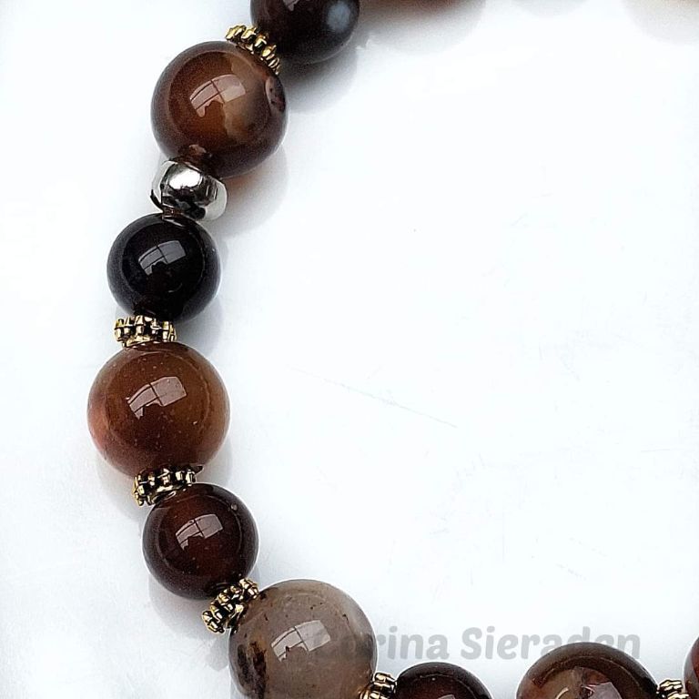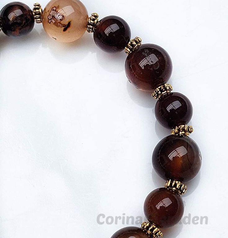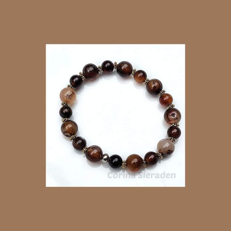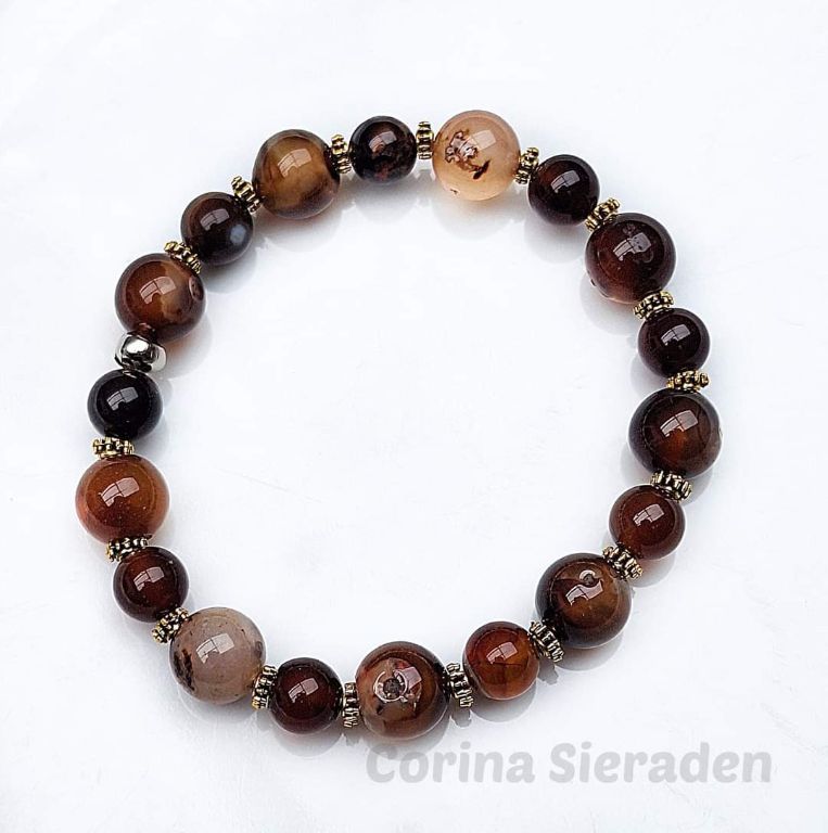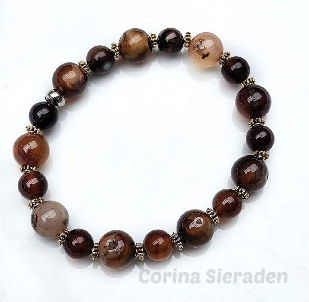 CORINA SIERADEN Armband van fire dragon veins agaat (8 en 10 mm) en brons, geregen op elastiek. Polsmaat: 19-20 cm.