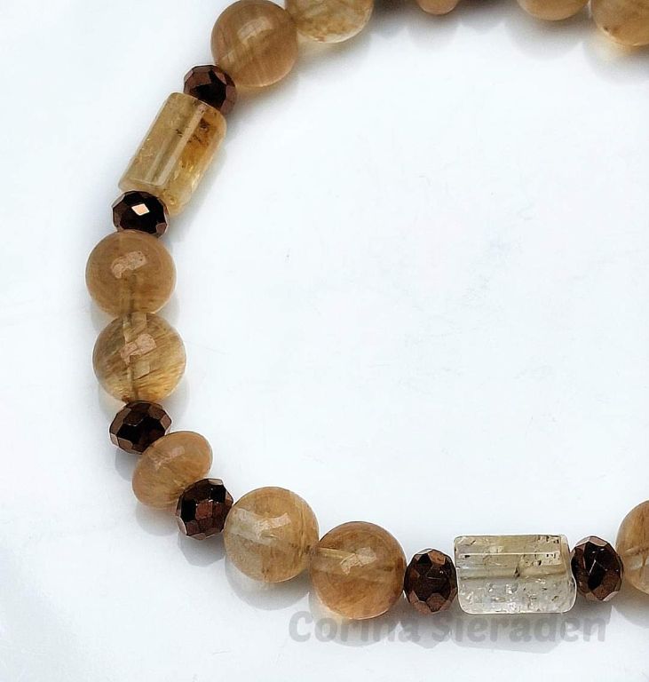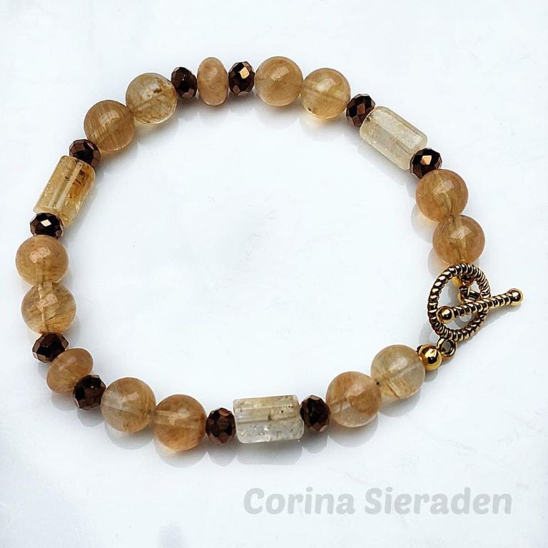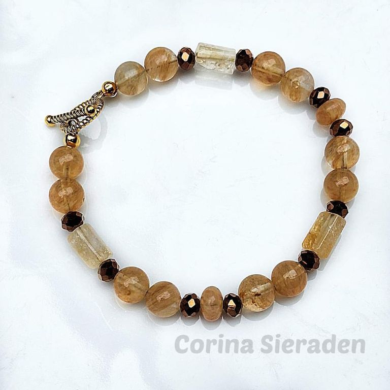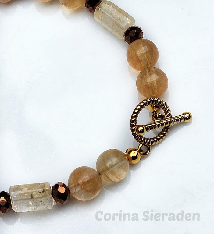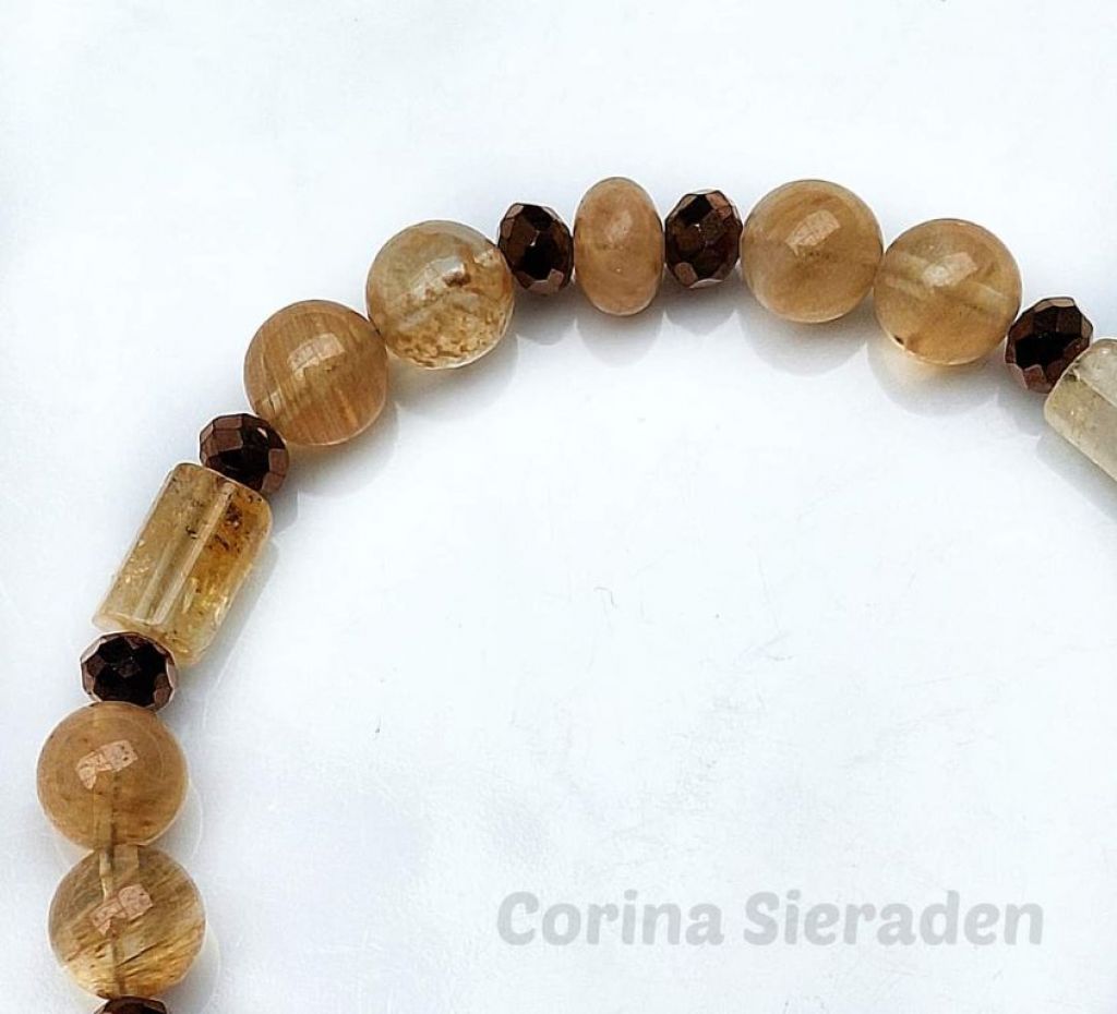 Armband van citrien (8 mm, rondelle en cilinder) en bronskleurige facetkralen, met goudkleurig kapittelslotje.
