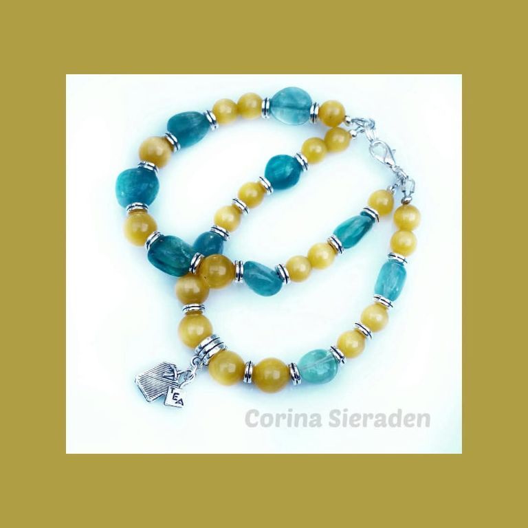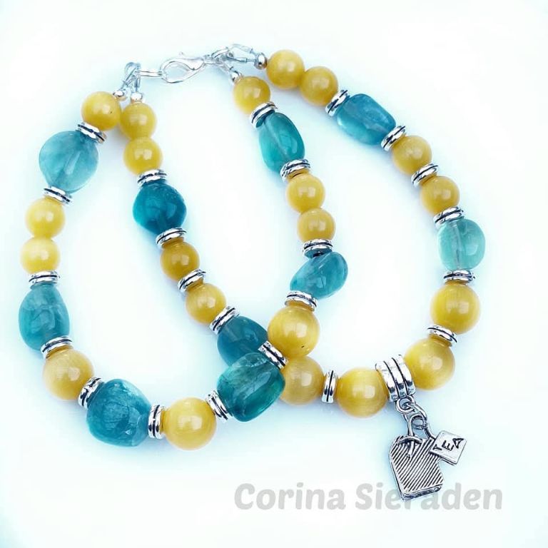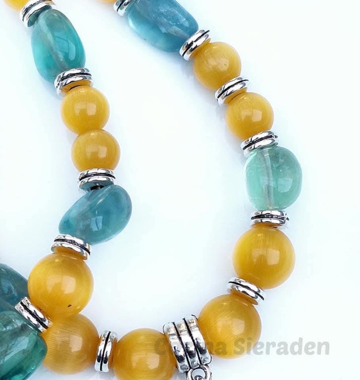 Dubbele armband van gele tiger eye (8 en 10 mm bijgekleurd), onregelmatige fluoriet en zilverkleurige spacers, met bedel.