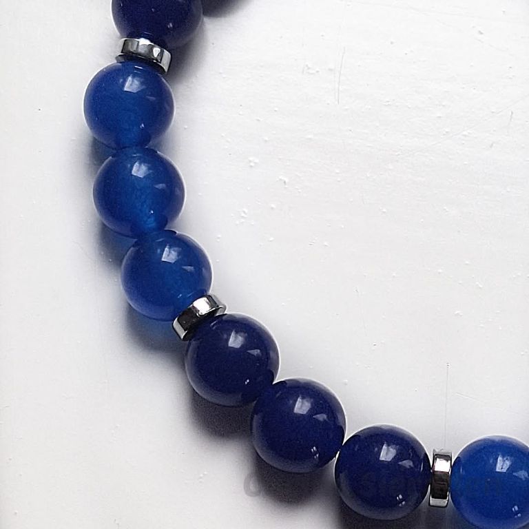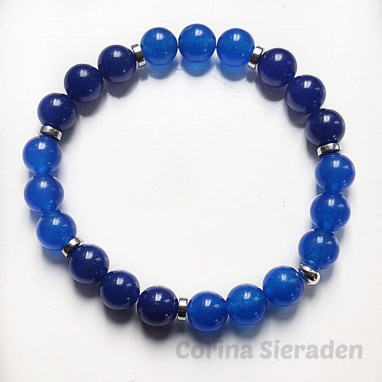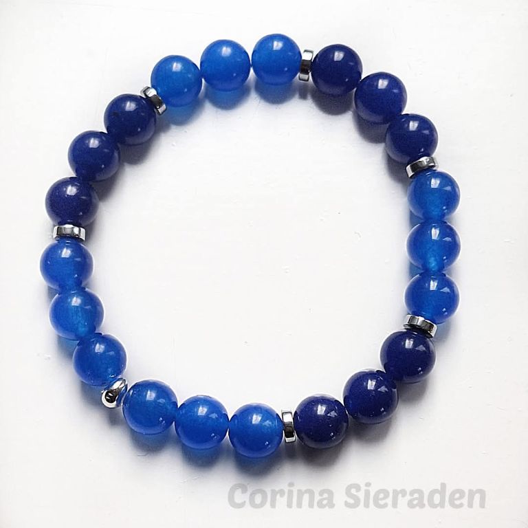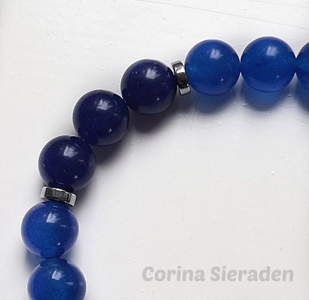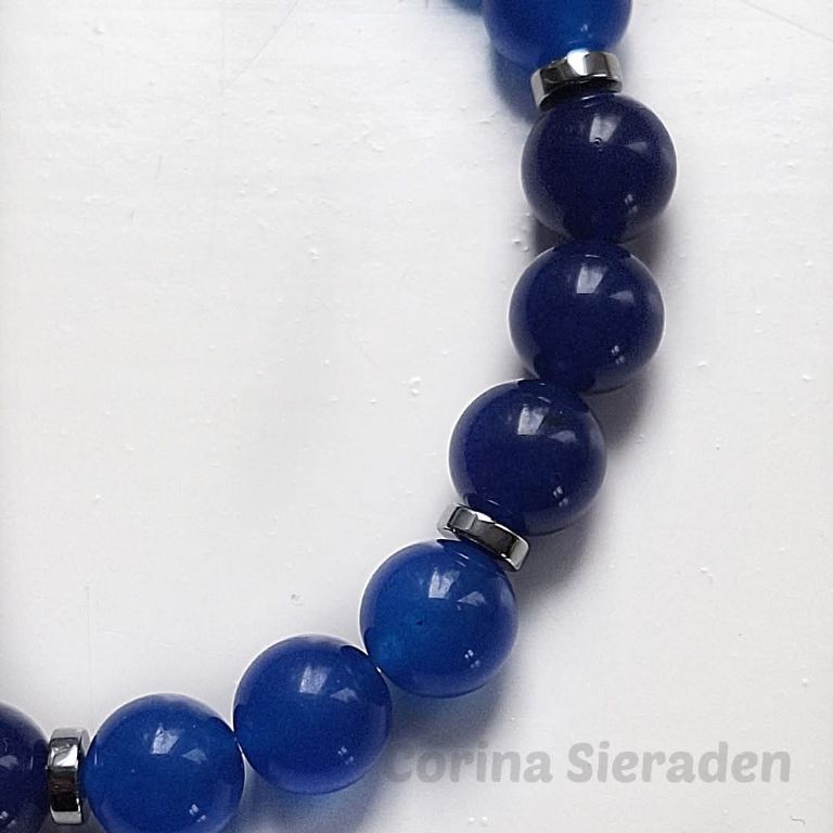Heren armband van donkerblauwe en middelblauwe jade (10 mm) en hematiet schijfjes, geregen op elastiek.