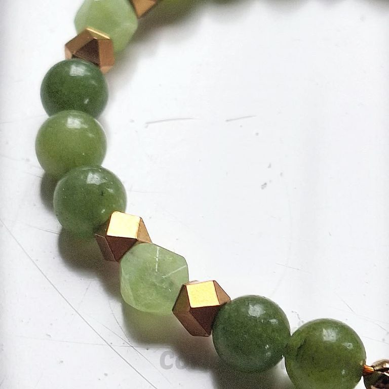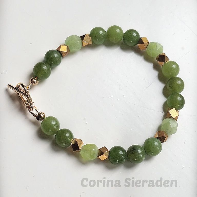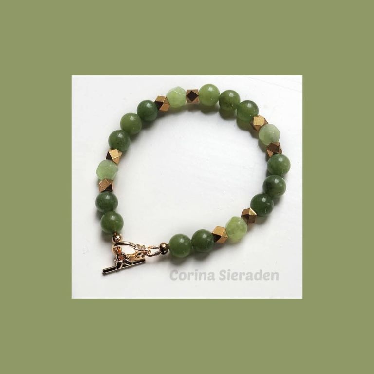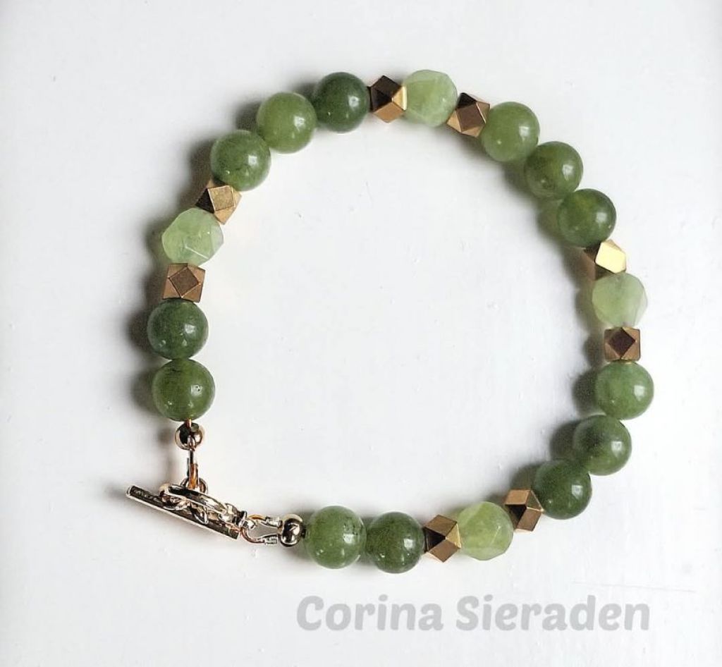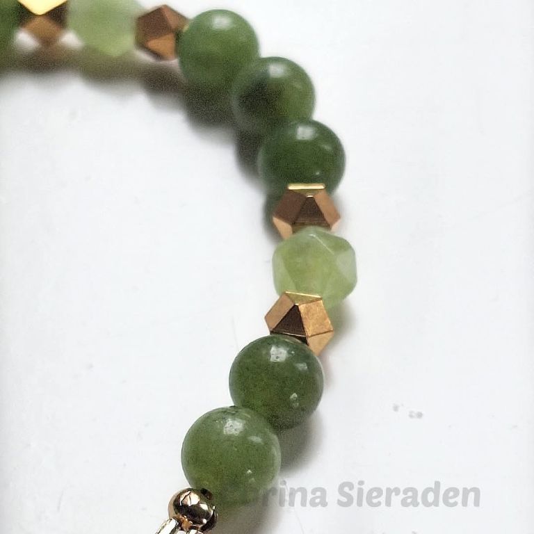 CORINA SIERADEN Armband van groene jade en goudkleurige spacers, met bedel zeepaardje, geregen op elastiek. Polsmaat: 17-18 cm. In de webshop vind je bijpassende oorstekers (zie laatste foto)