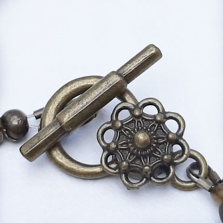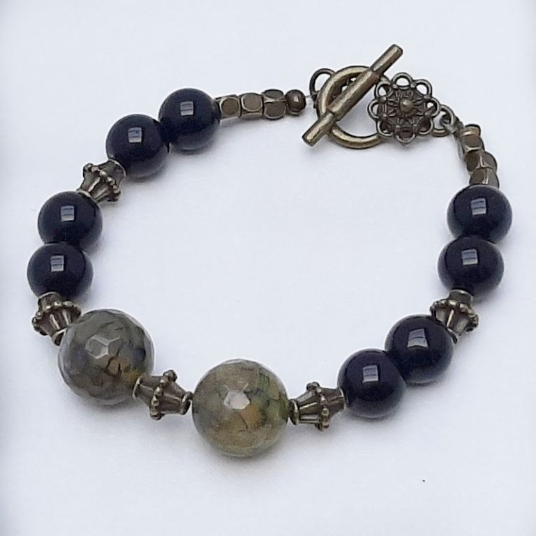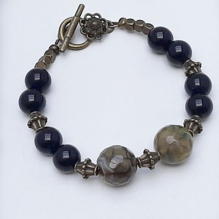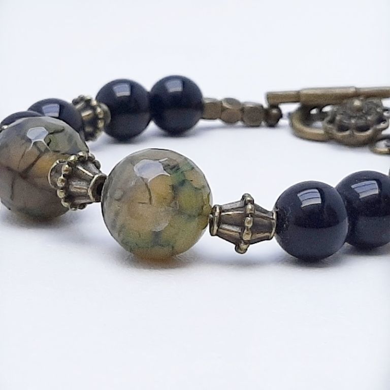Armband van prachtig, facetgeslepen mosagaat, blackstone en brons, met kapittelslot zeeuwse knoop.