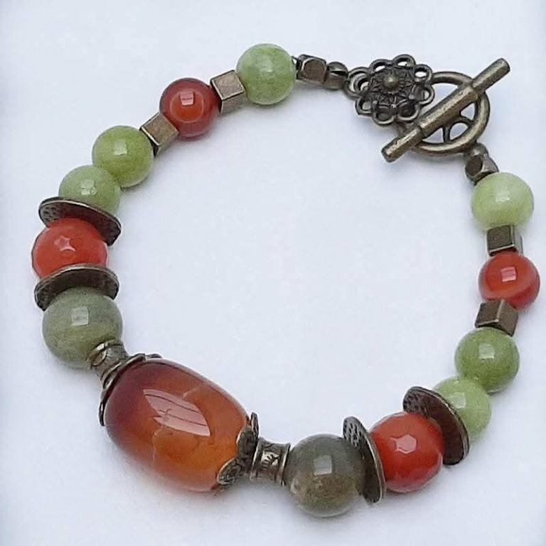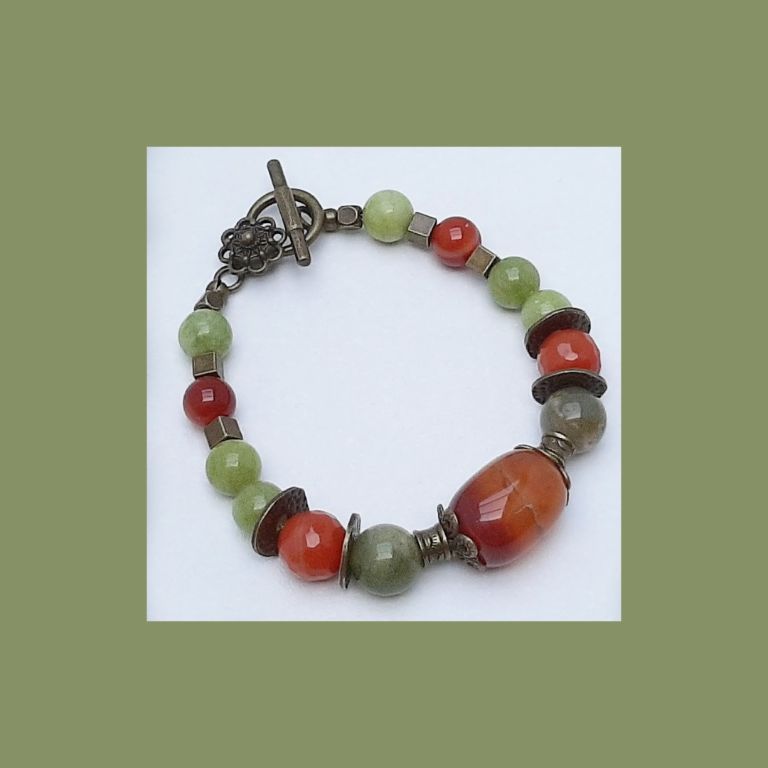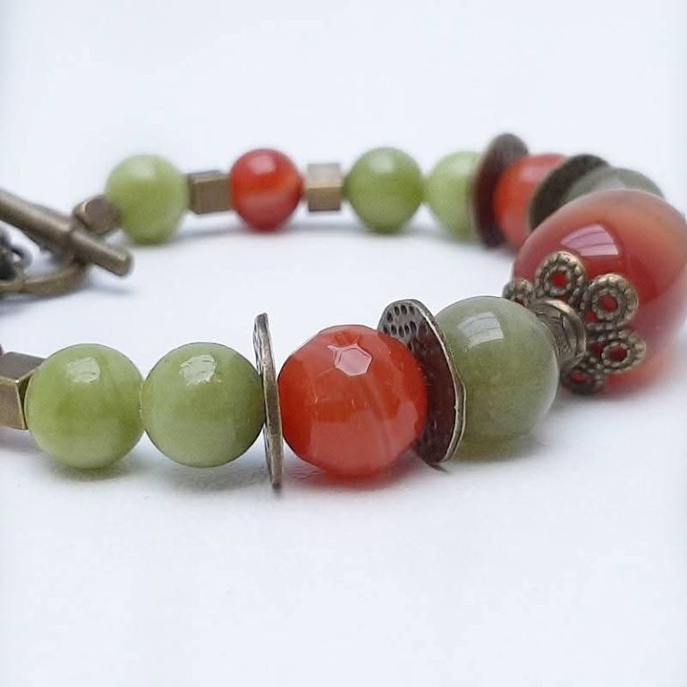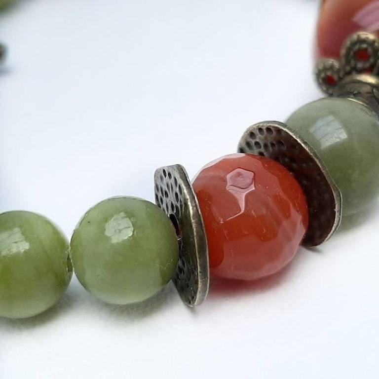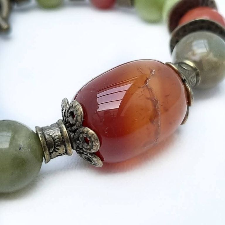 Unieke armband van chinese jade, agaat en brons, met prachtige sierkraal van carneool en bronzen kapittelslot zeeuwse knoop.