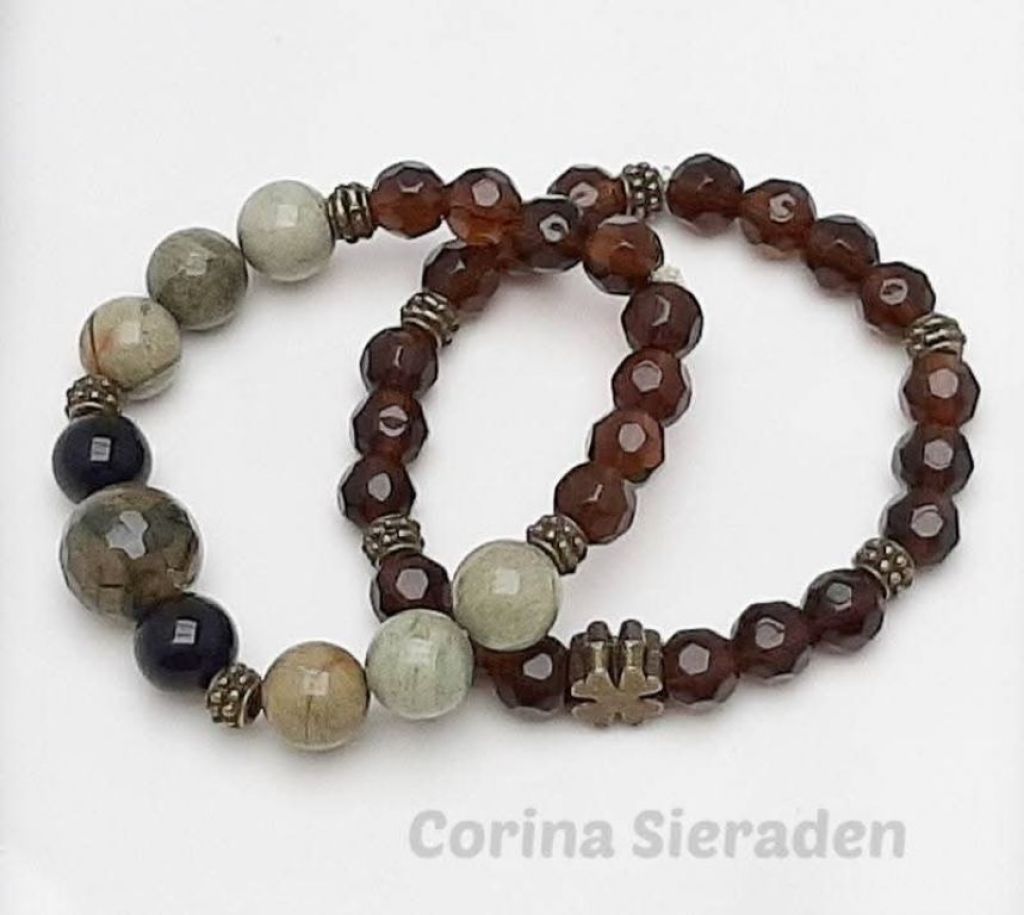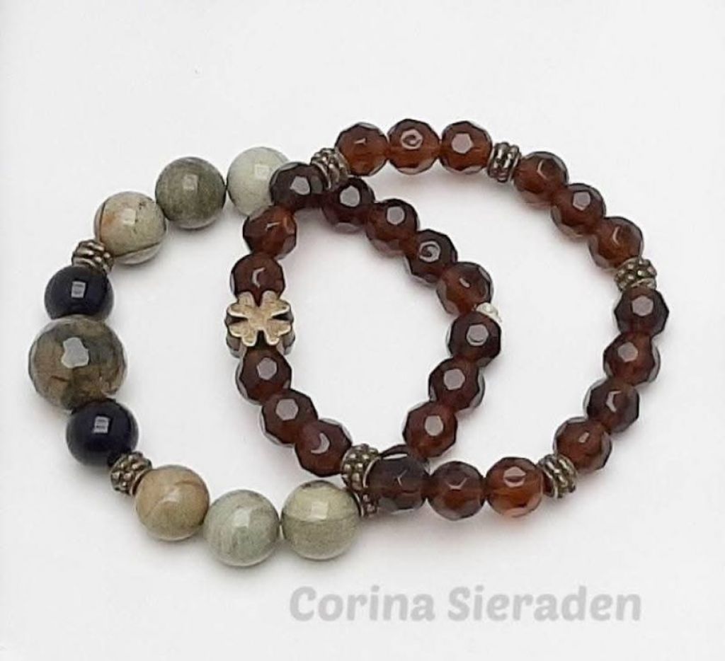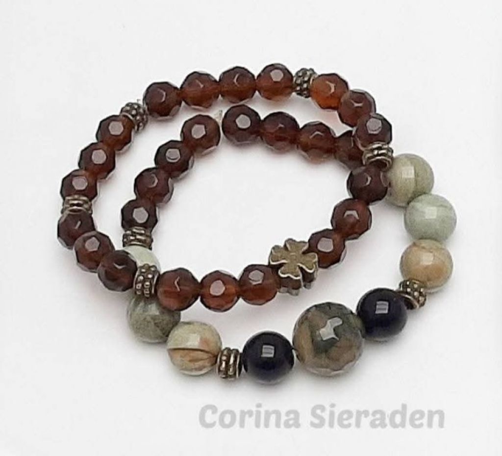 Armbandenset (2-delig) van mosagaat, silver leaf jaspis, kristal en brons.