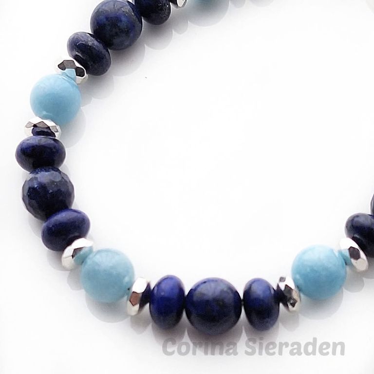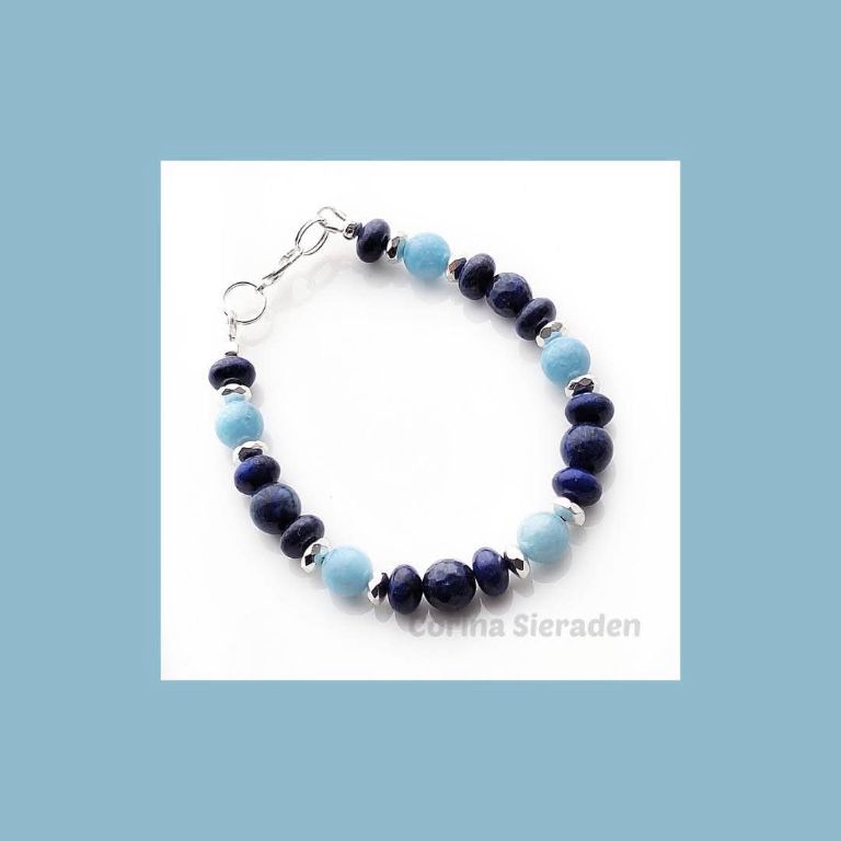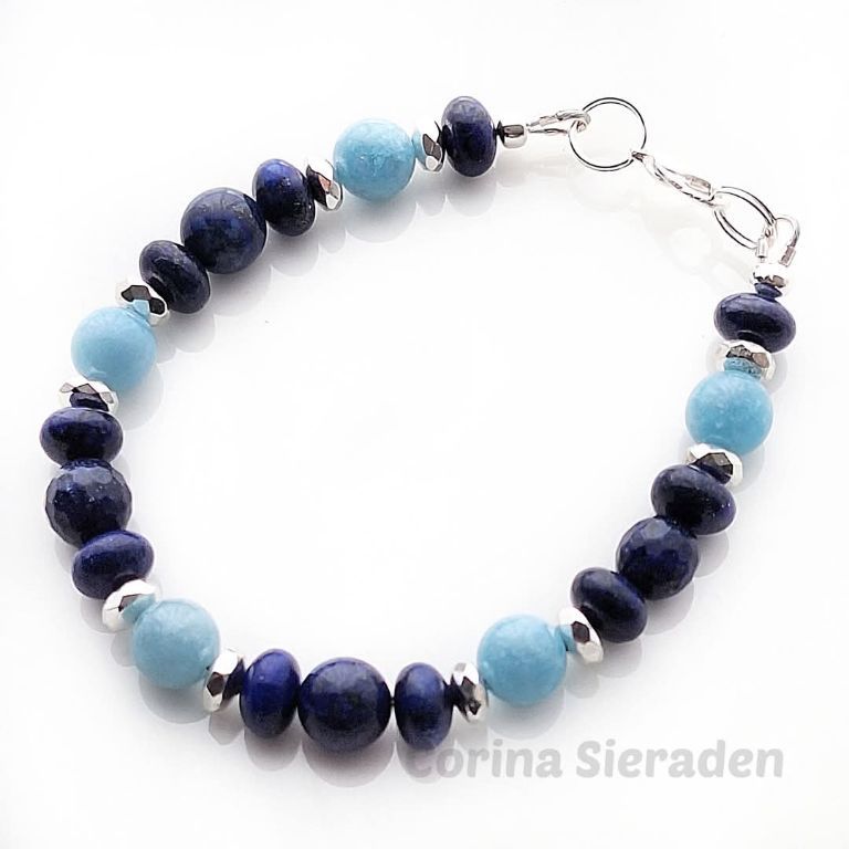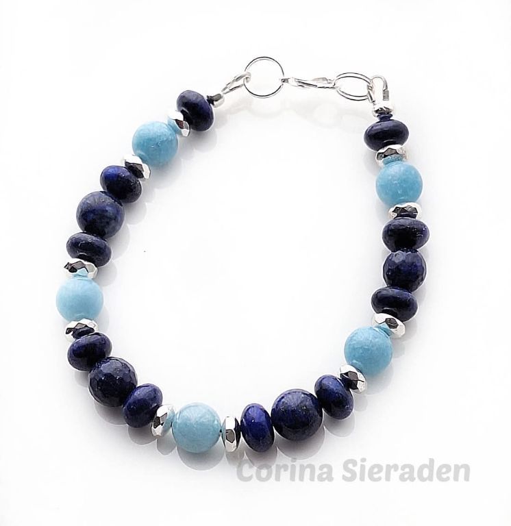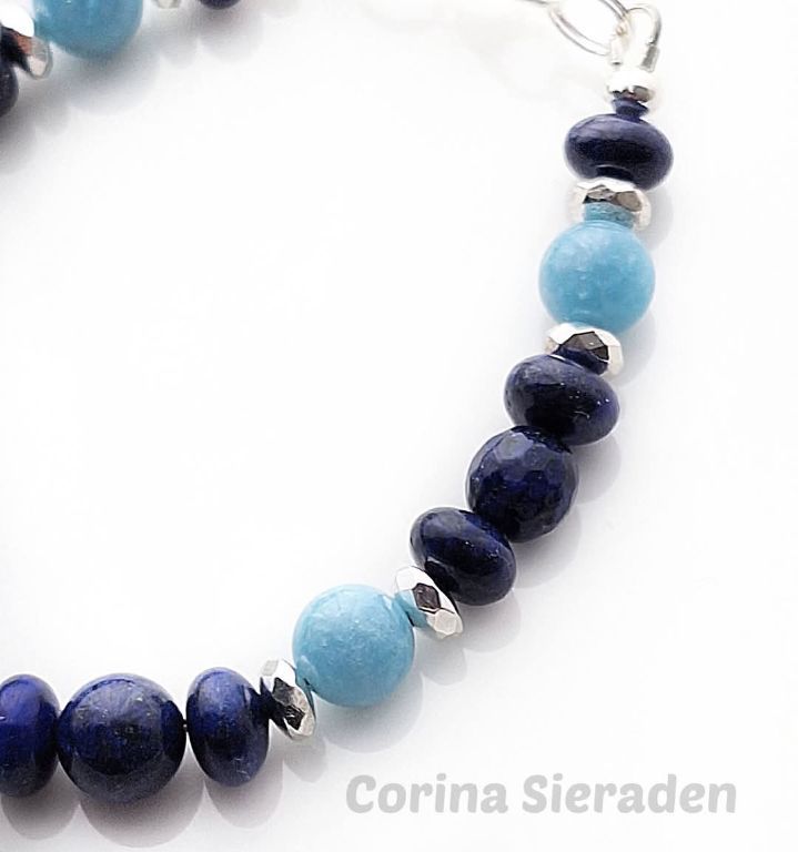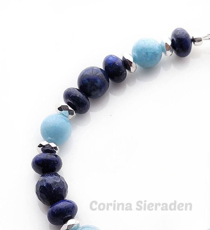 Armband van lapis lazuli (8 mm rond en facetgeslepen en rondelle), chalcedoon (8 mm) en verzilverde, facetgeslepen hematiet (rondelle)