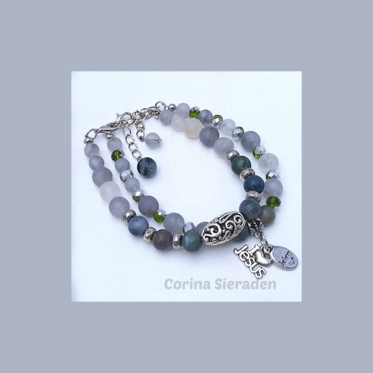 CORINA SIERADEN Deze unieke armband heb ik gemaakt van facetgeslepen golden tiger eye (8 mm) en mosagaat (8 mm), met goudkleurige spacers. Polsmaat: 18 cm.