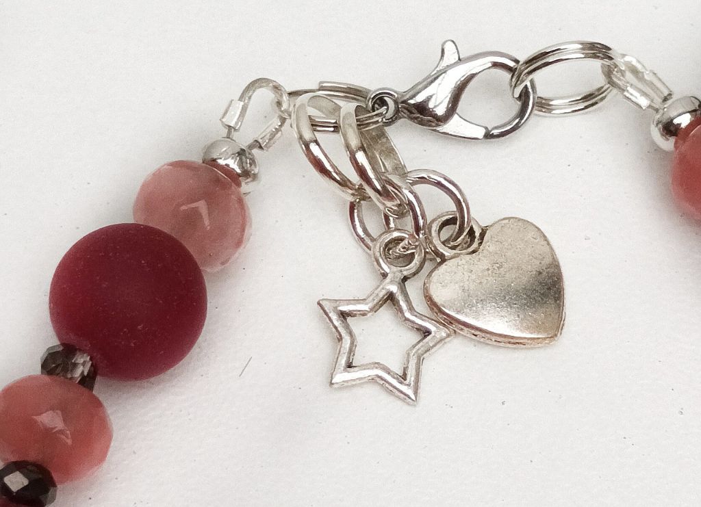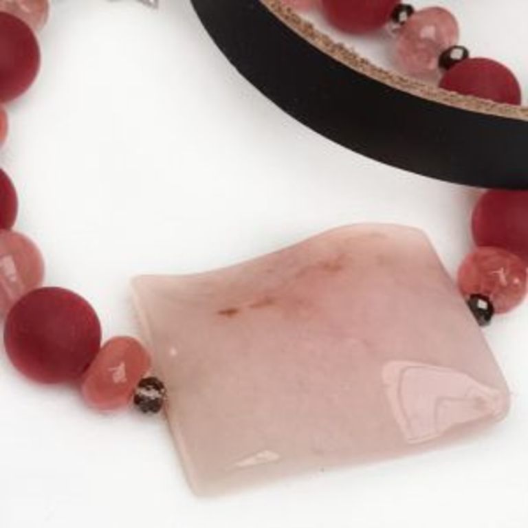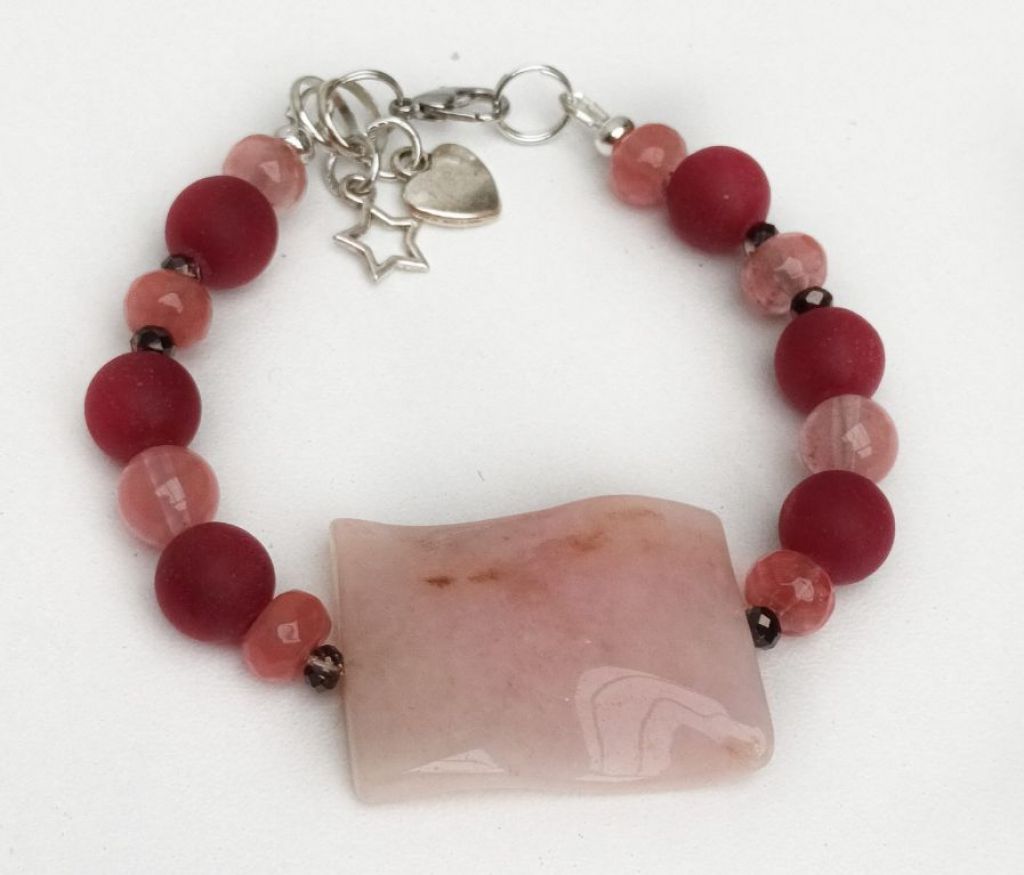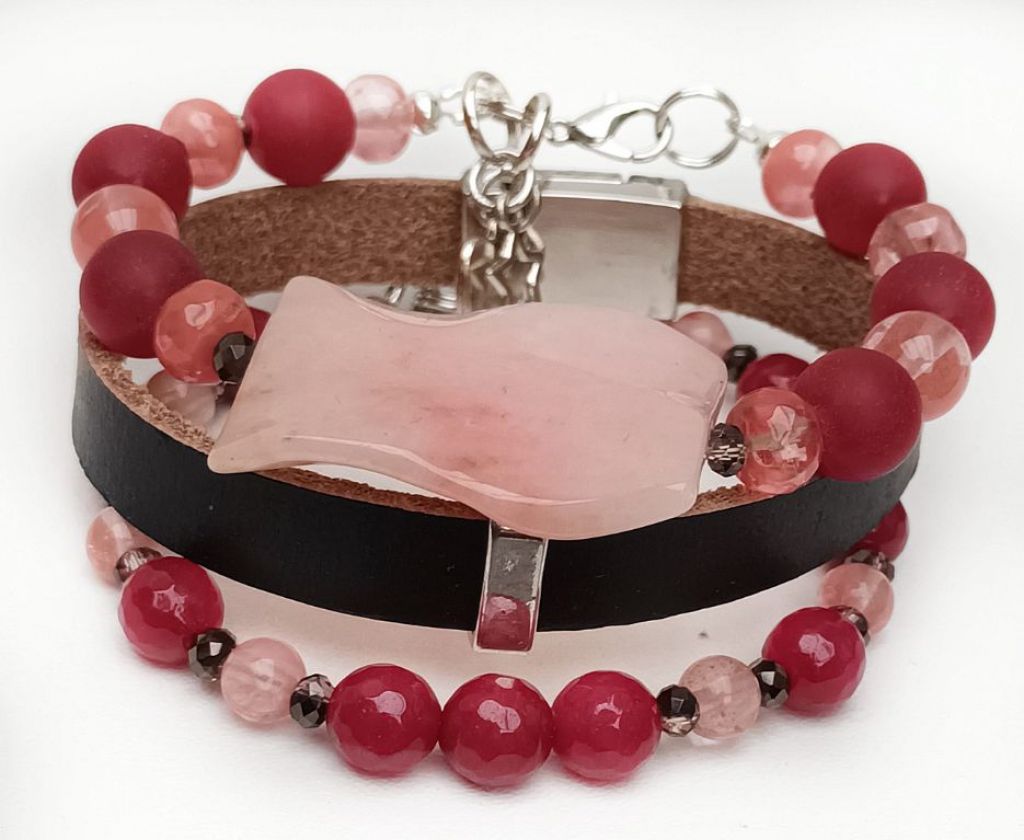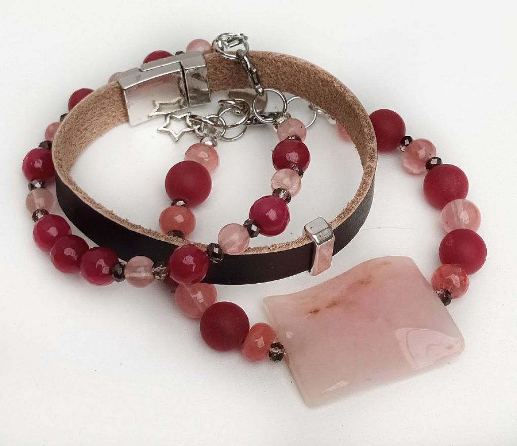 Armbandenset (3-delig): 2 armbanden van rode chalcedoon (mat 10 mm, facetgeslepen 8 mm), watermeloen quartz (8 mm), cherry quartz (rondel 5 x 8 mm en rond 6 mm) en facetgeslepen kristal (3 mm), met prachtige sierkraal van morganiet (gegolfd) en bedels + leren armband (10 mm) met schuifkraal en magneetslot. Polsmaat: 19 cm.