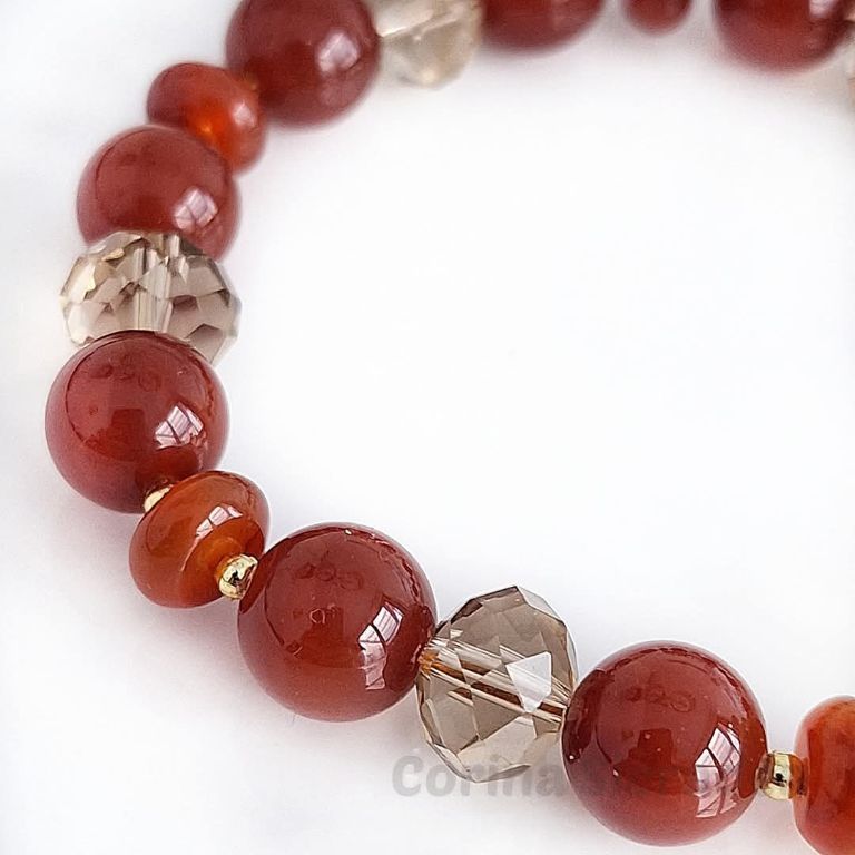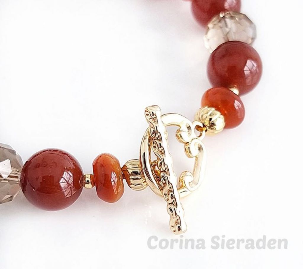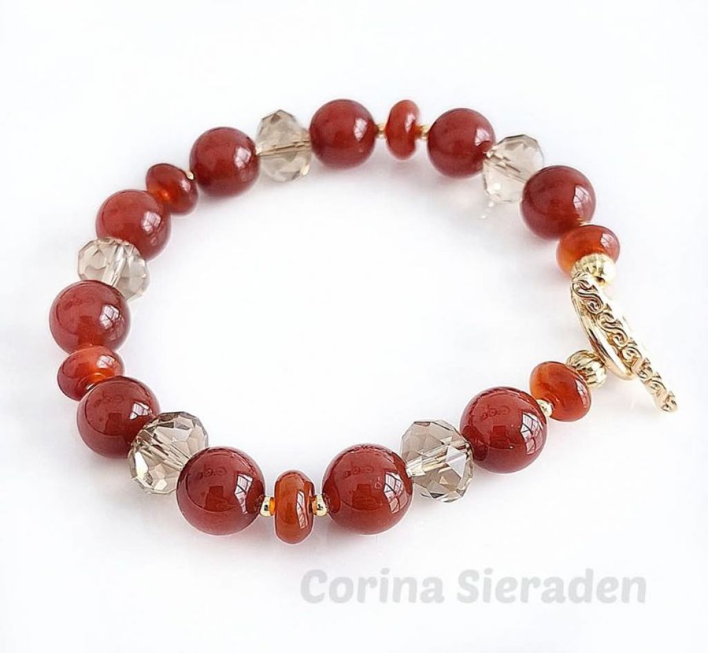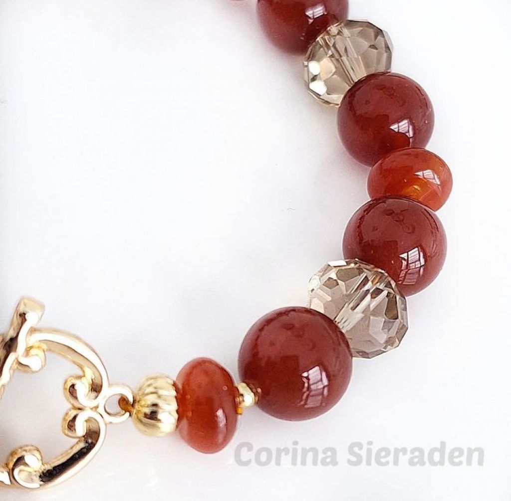 Armband van rode agaat (10 mm en 3x 8 mm rondelle), Swarovski kristallen (8×10 mm) en messing spacers, met prachtig messing kapittelslot.