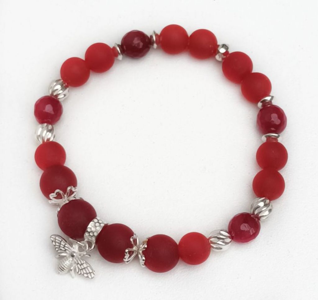 Prachtige armband met rode chalcedoon (frosted en facetgeslepen) en STERLING ZILVER, met schattig zilveren bedel bijtje, geregen op elastiek.