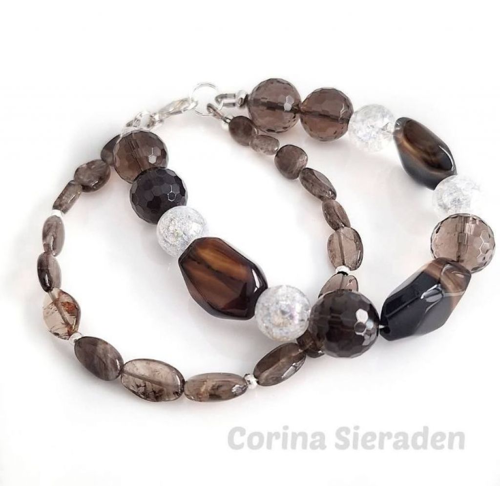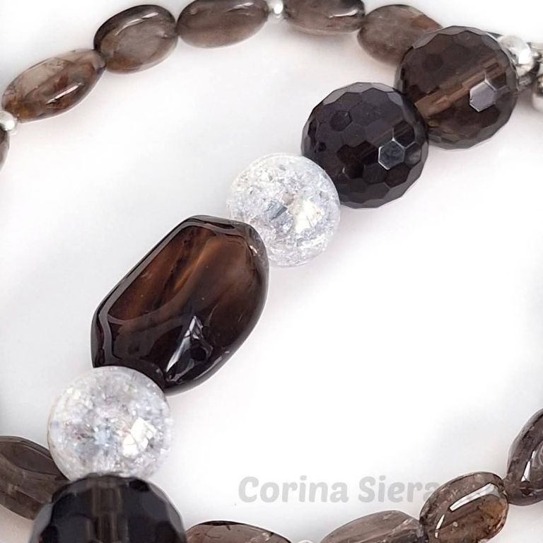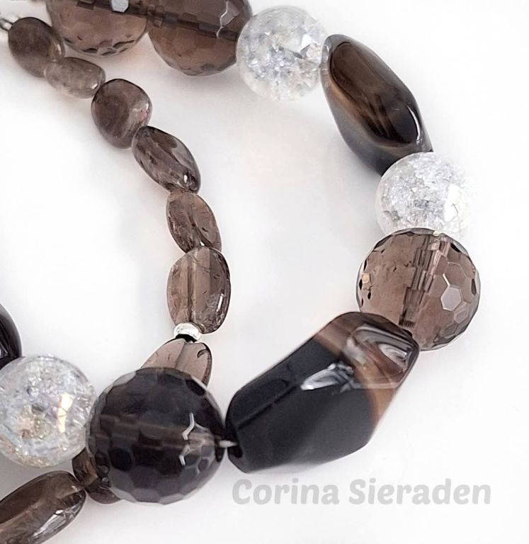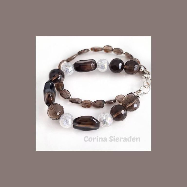 Dubbele armband van facetgeslepen rookquartz (12 mm en onregelmatige, platte kralen), gebarsten kristal (10 mm) en zilverkleurige spacers. Polsmaat: 18 cm.