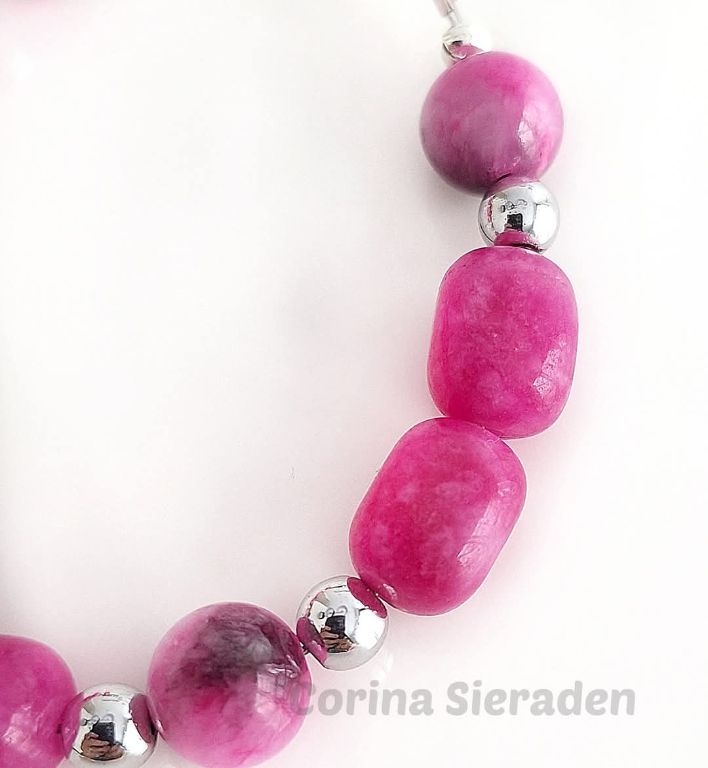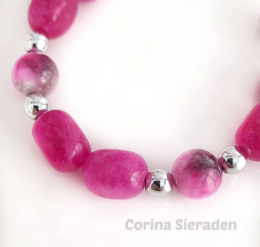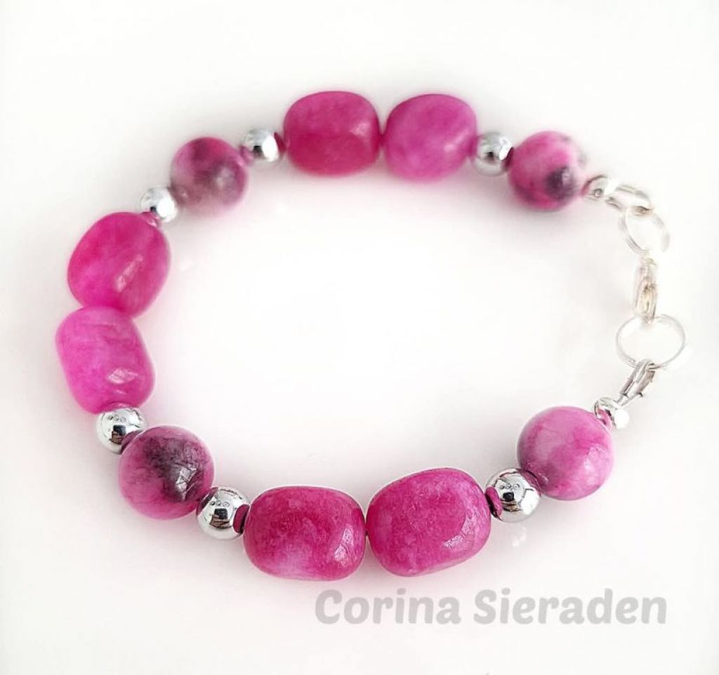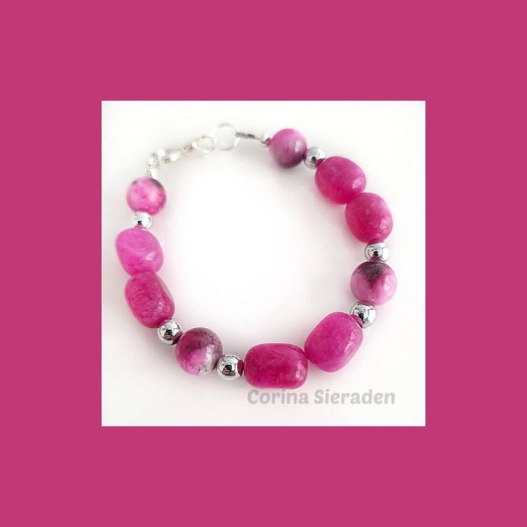 Vrolijke armband van jade (onregelmatig ovaal 9x11 mm), persian jade (10 mm bijgekleurd) en hematiet.