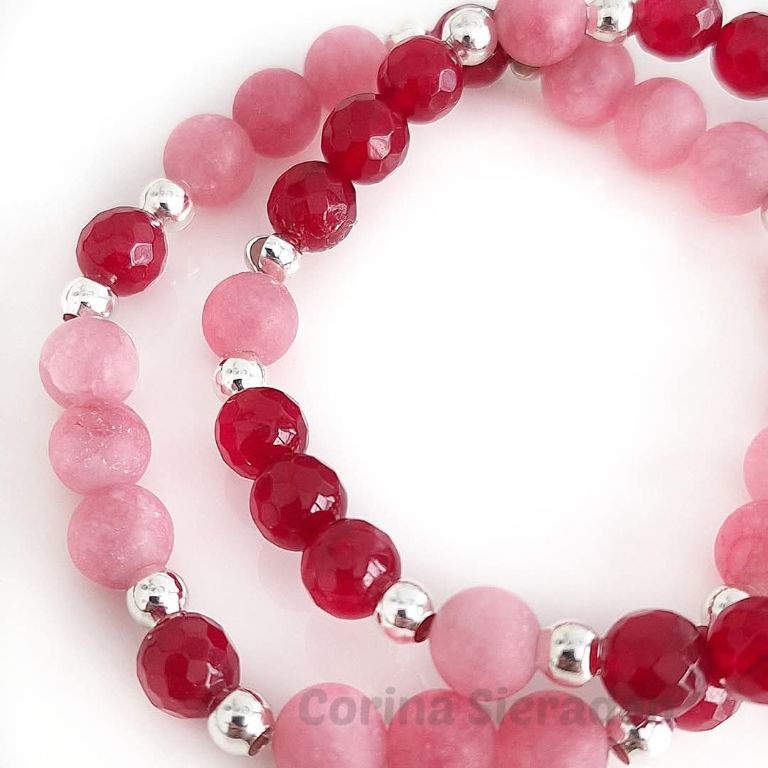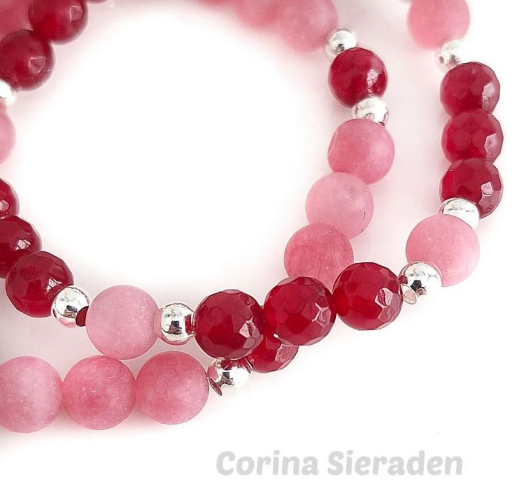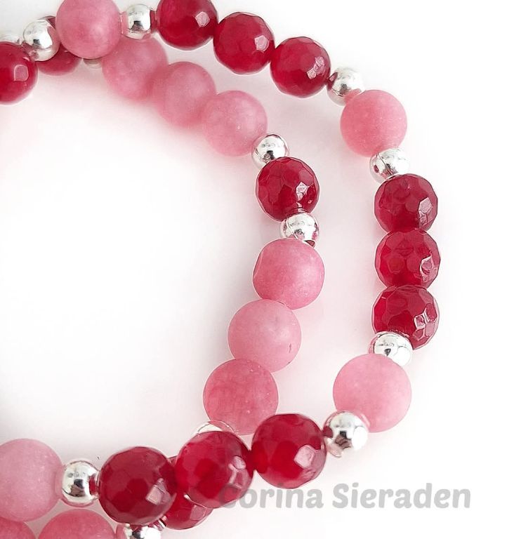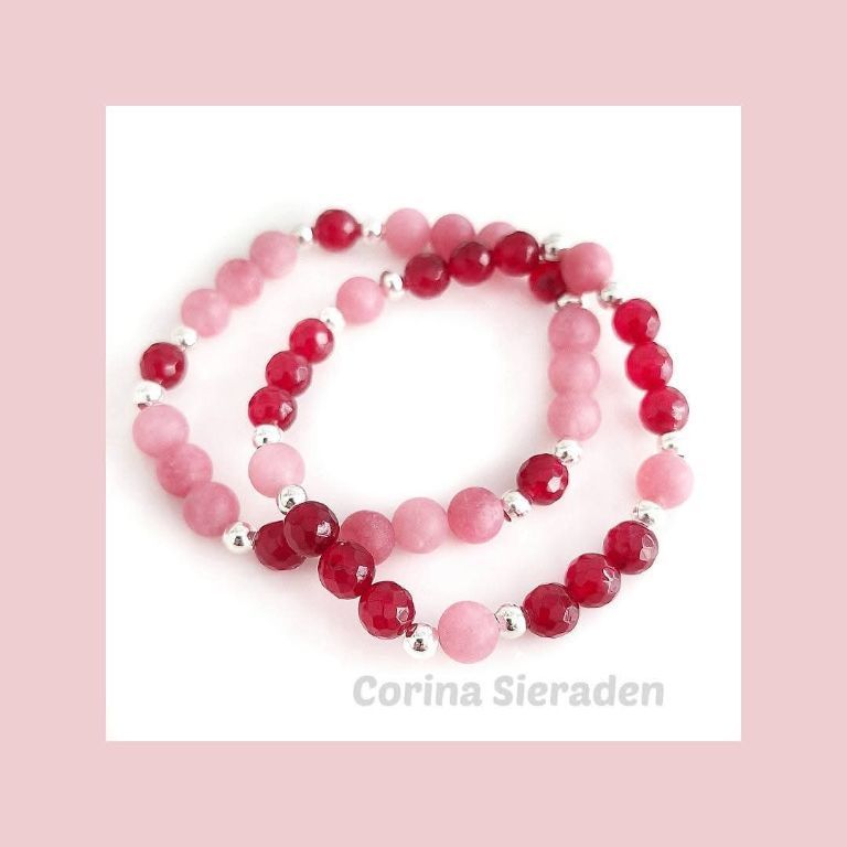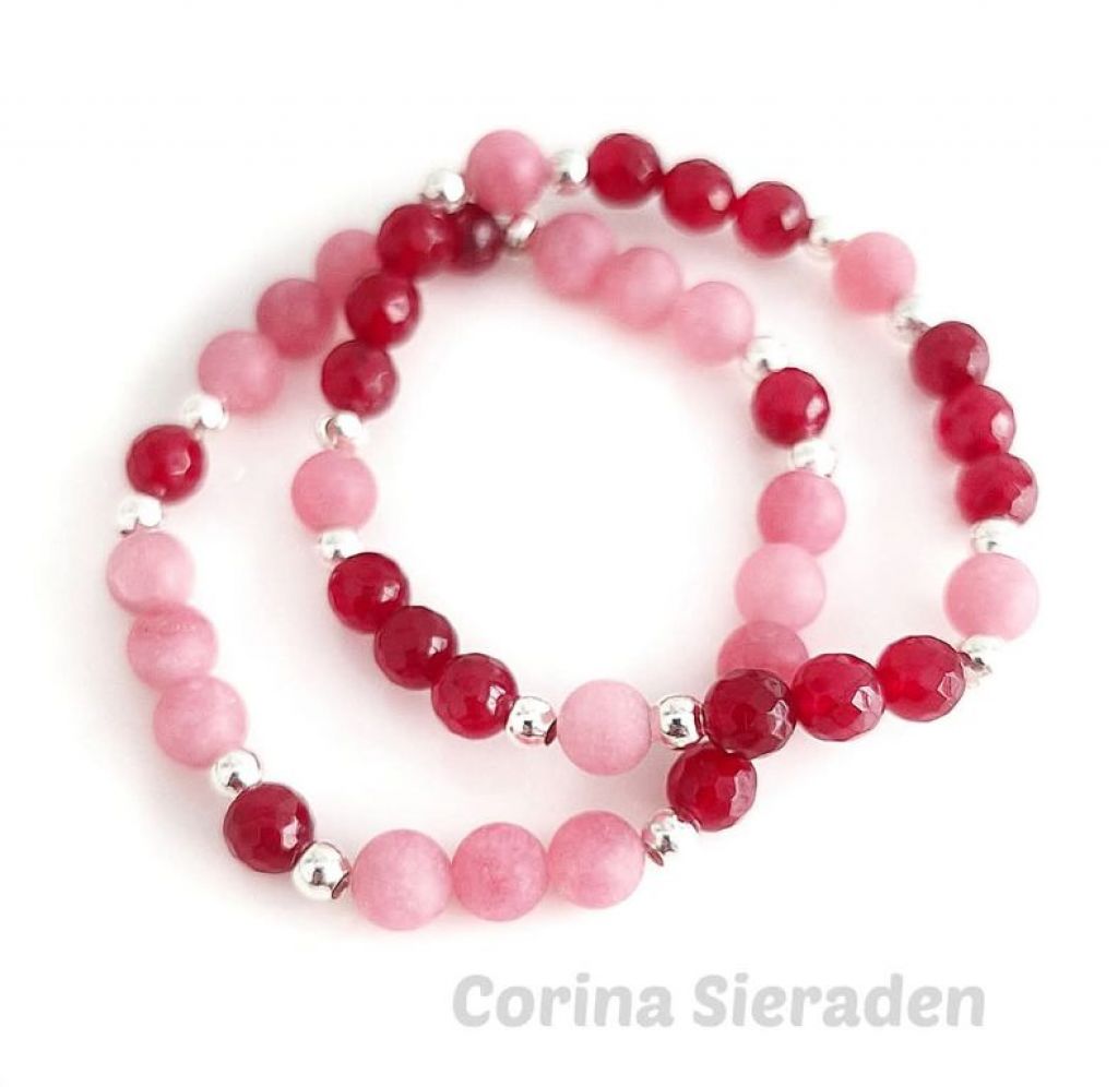 Zomerse armbandenset van frosted jade (8 mm), facetgeslepen jade (8 mm) en zilverkleurige spacers, geregen op elastiek.