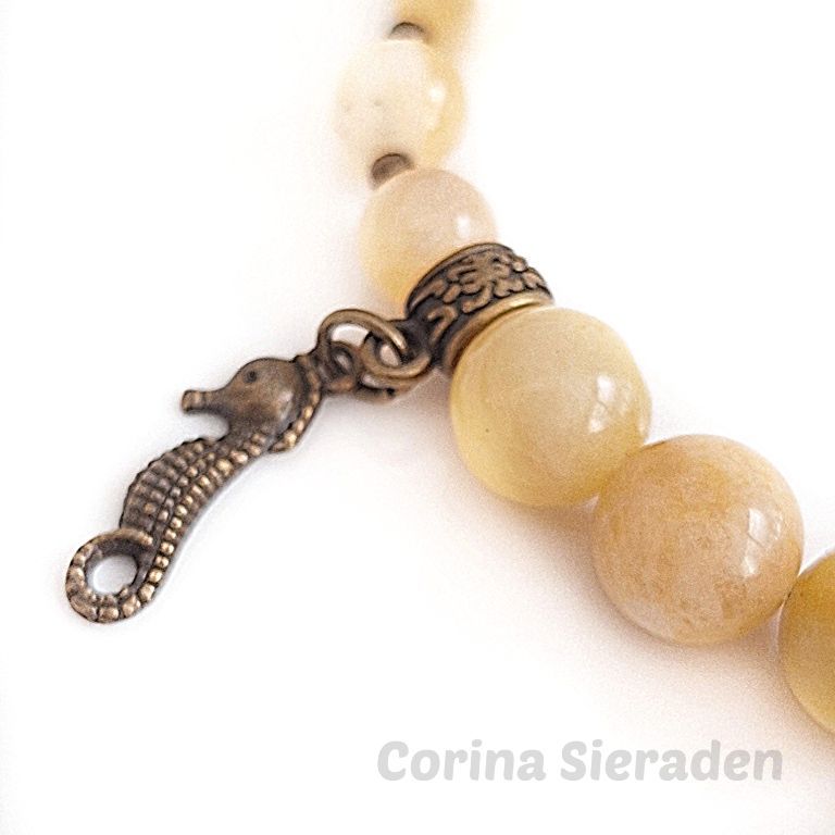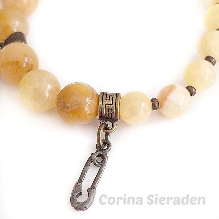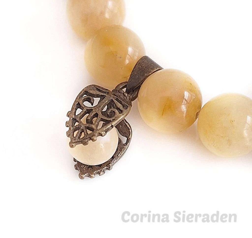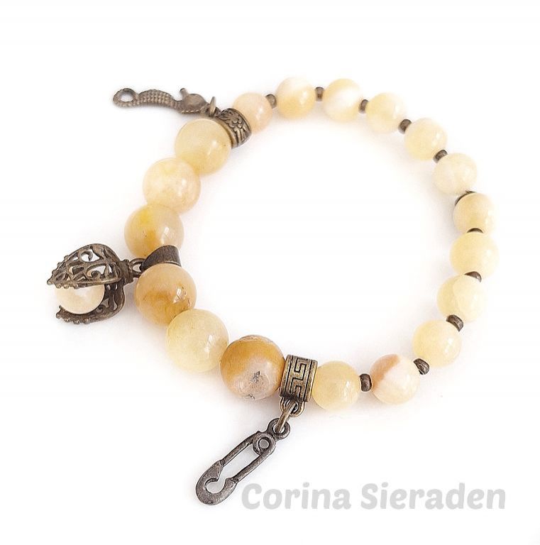 Zonnige armband van spring jade (10 mm), calciet (8 mm) en brons, met sierlijke bedel met kraal, geregen op elastiek.